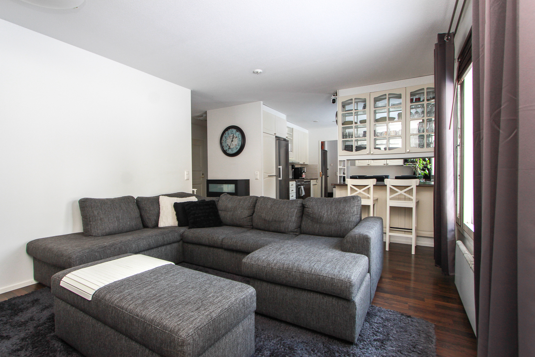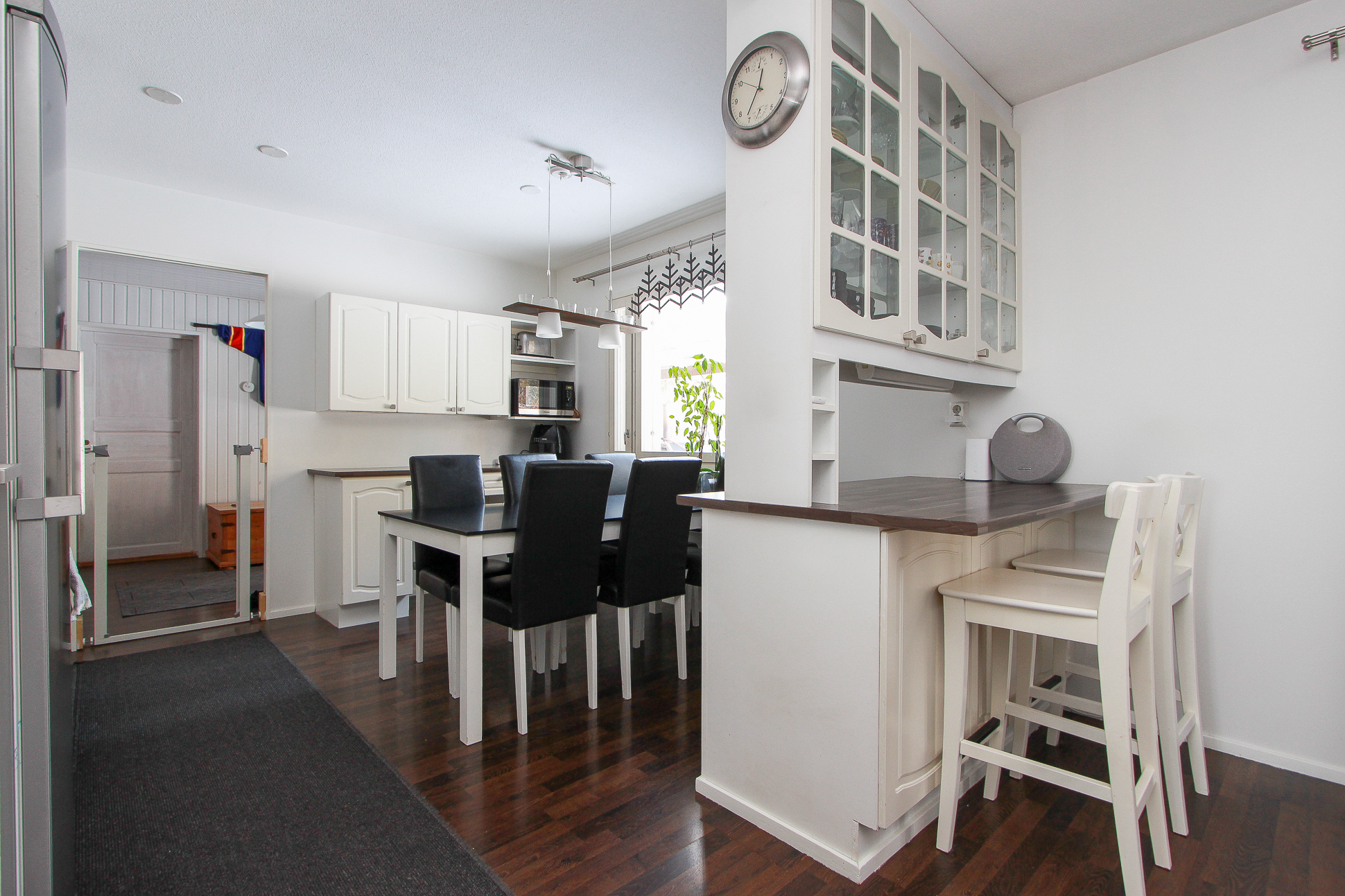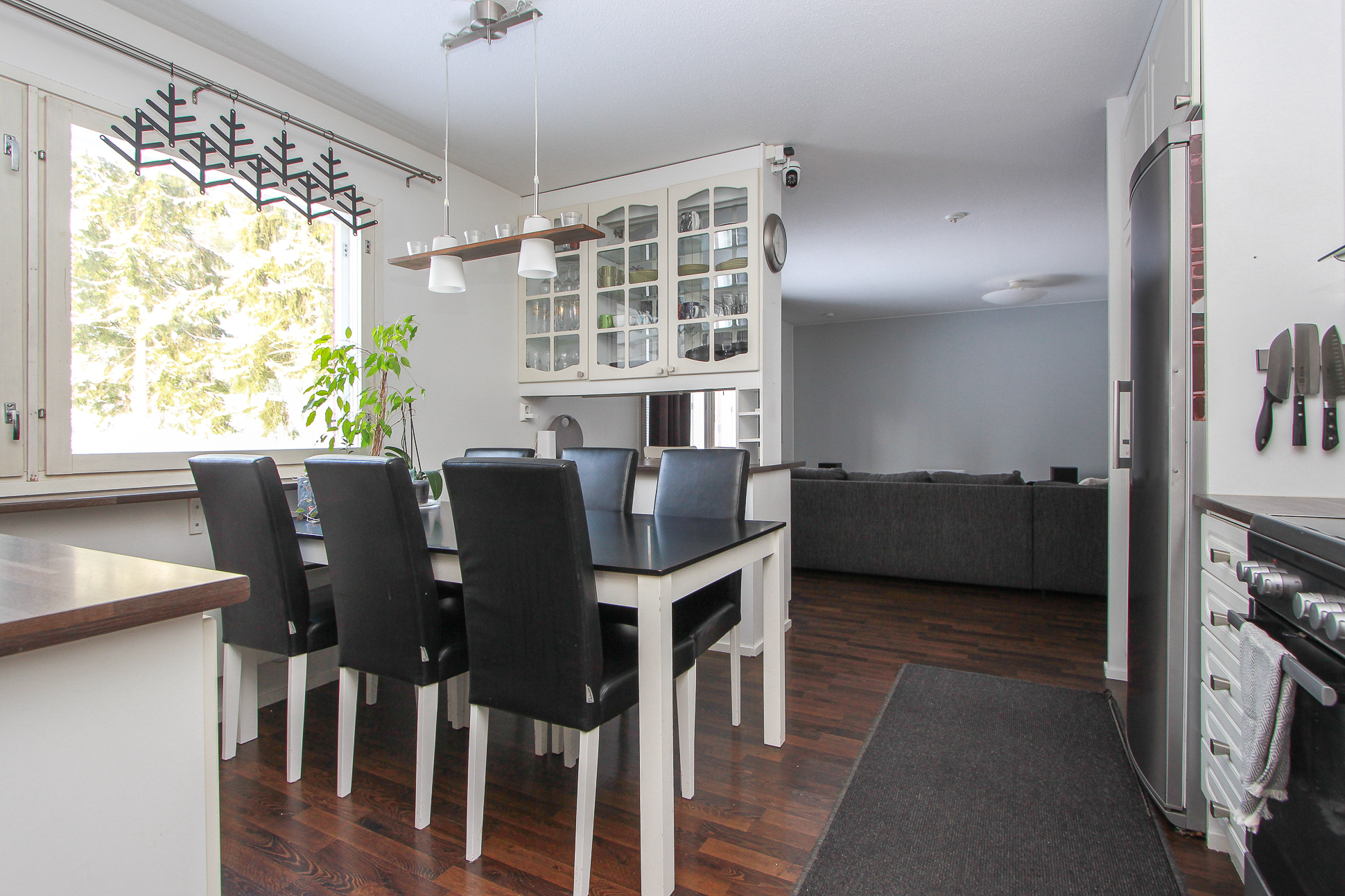 Keittiössä on riittävästi taso- ja kaappitilaa ja paikka isommallekin ruokapöydälle.Takkahuoneesta on käynti valokatetulle terassille ja pihalle. Osa takapihasta on aidattu. Avotakka tuo tunnelmaa ja ilmalämpöpumppu lisää asumismukavuutta ympäri vuoden.