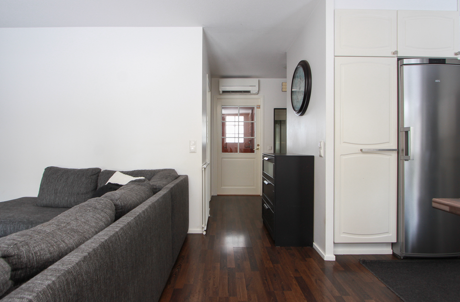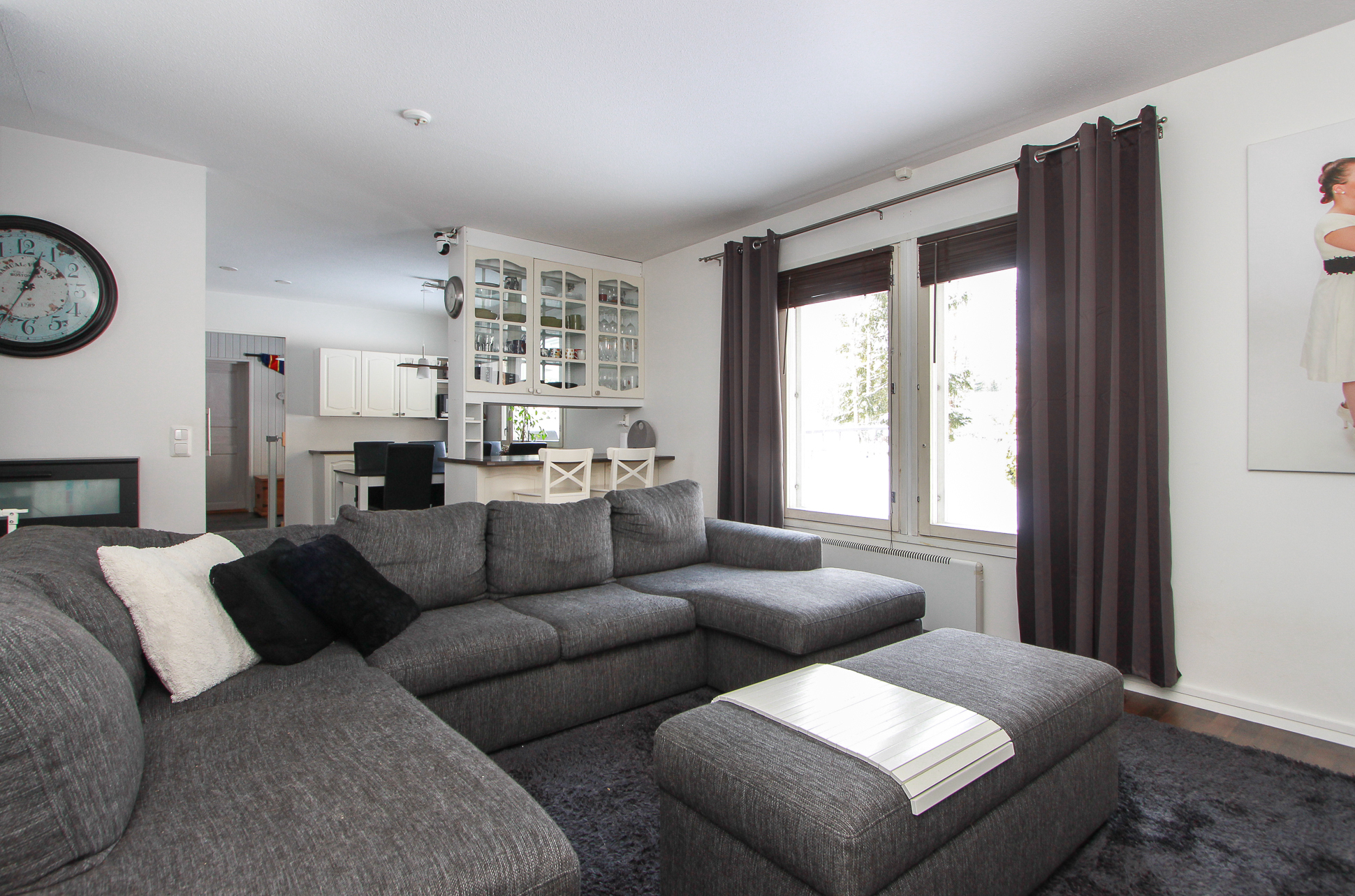 Ilmalämpöpumppu asennettu 4/2017. Takkahuoneessa avotakka.