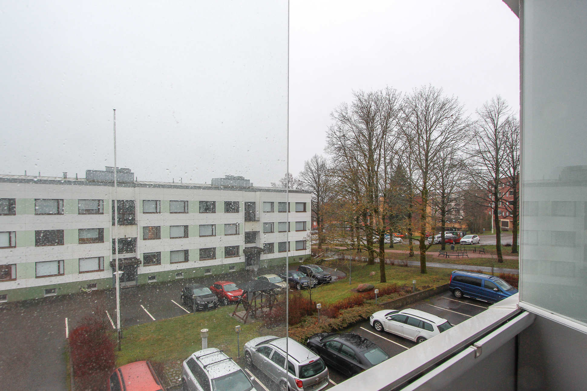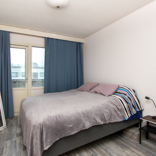 Parvekkeelle kulku toisesta makuuhuoneesta. Näkymät taloyhtiön sisäpihan puolelle.
