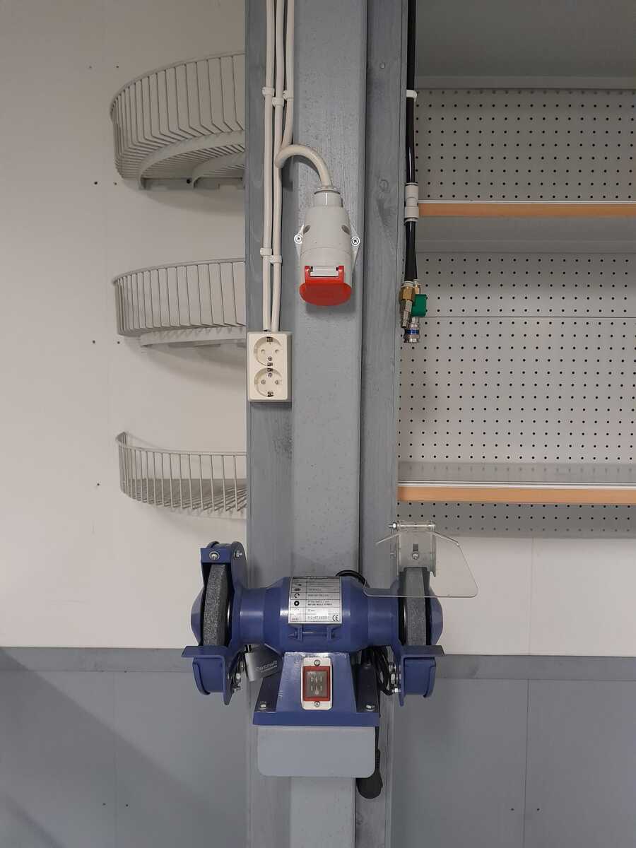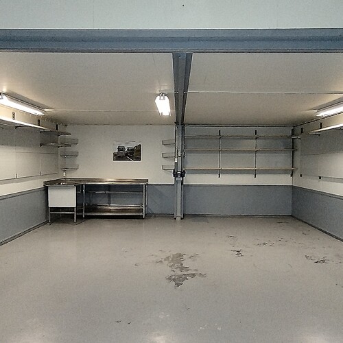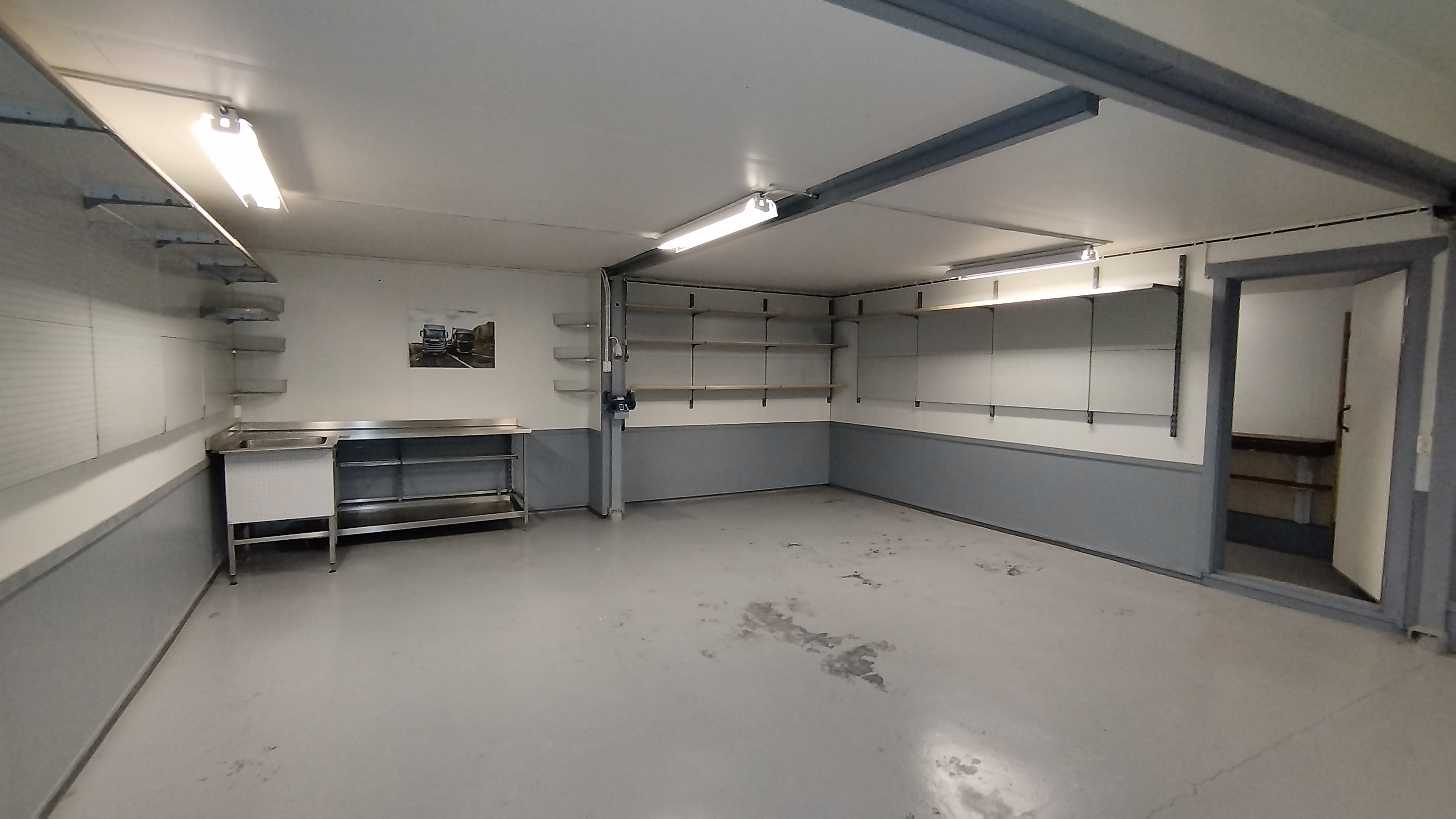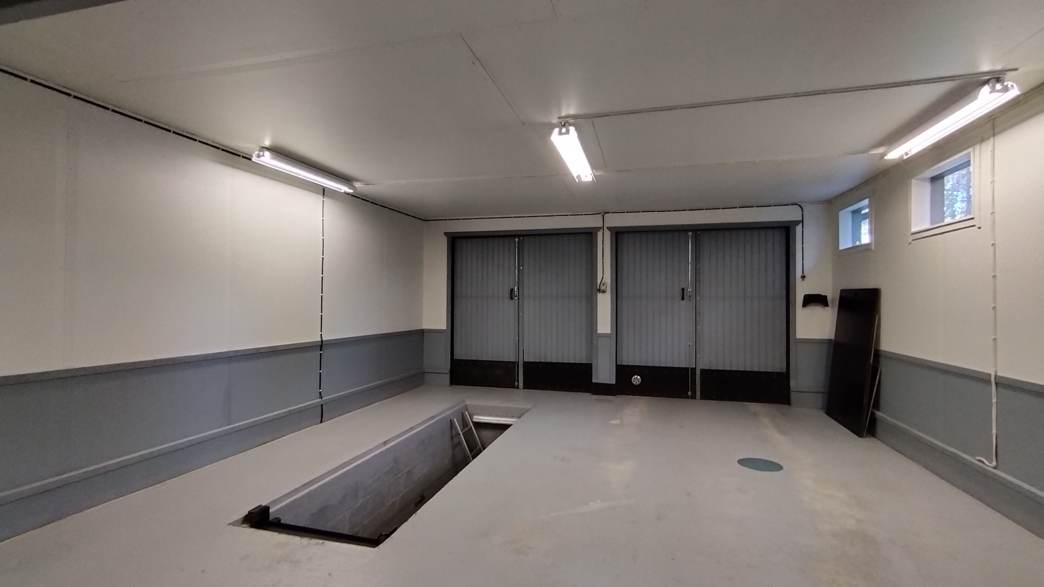 Suuri 4 auton talli, joka on suunniteltu autojen laiton ehdoilla. Autotallissa on ponni ja kiskot siirtovaunutaljalle, on paineilmalinja ja 16 A voimavirta. Tallin sisäpituus on 11 m ja leveys 5,60 m. Ovien vapaan aukon koko on korkeus 2,30 m ja leveys 2,20 m. Autotallin sisäkorkeus on takaosassa 2,30 m ja etuosassa 2,60 m.