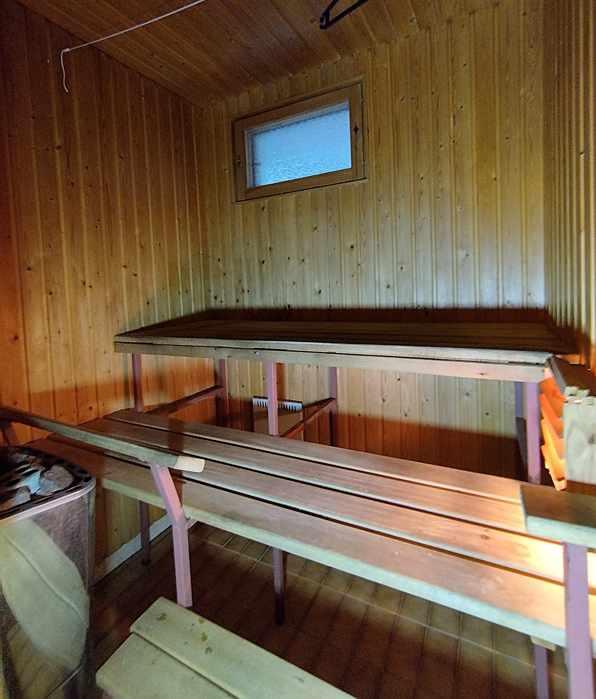 Siistikuntoinen sauna lämpiää sähkökiukaalla. Kiuas on uusi ja käyttämätön.