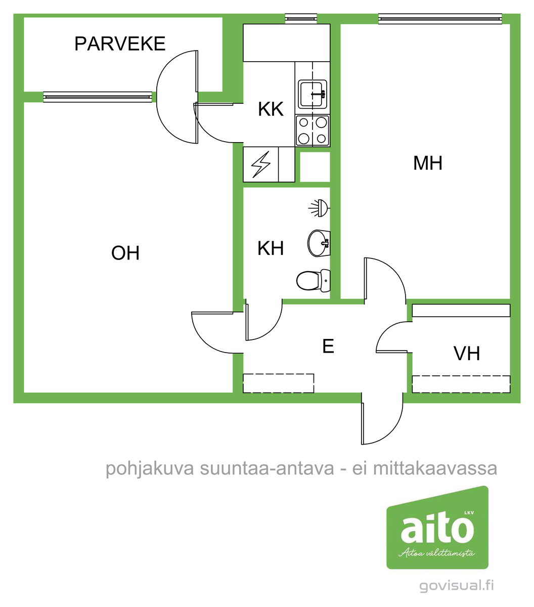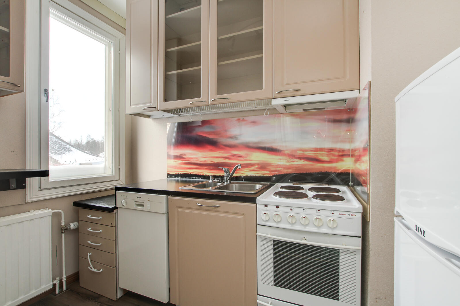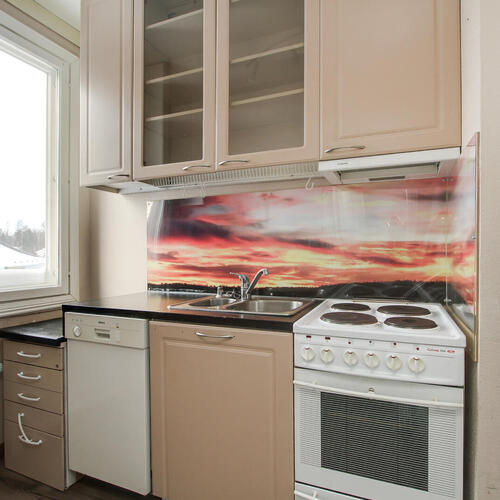 Varusteet: jenkkikaappi, sähköliesi, liesituuletin, astianpesukone