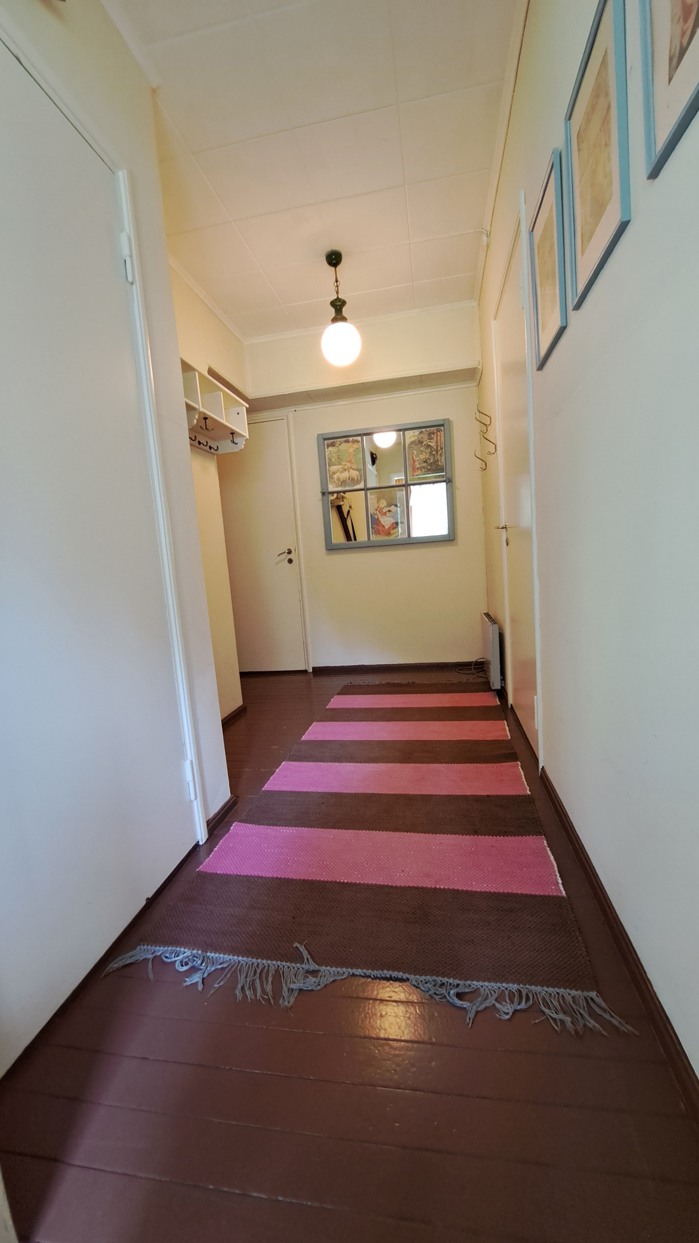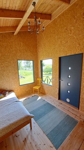 Pintamateriaalit: lattia maalattu puu, seinät paneeli, katto paneeli.