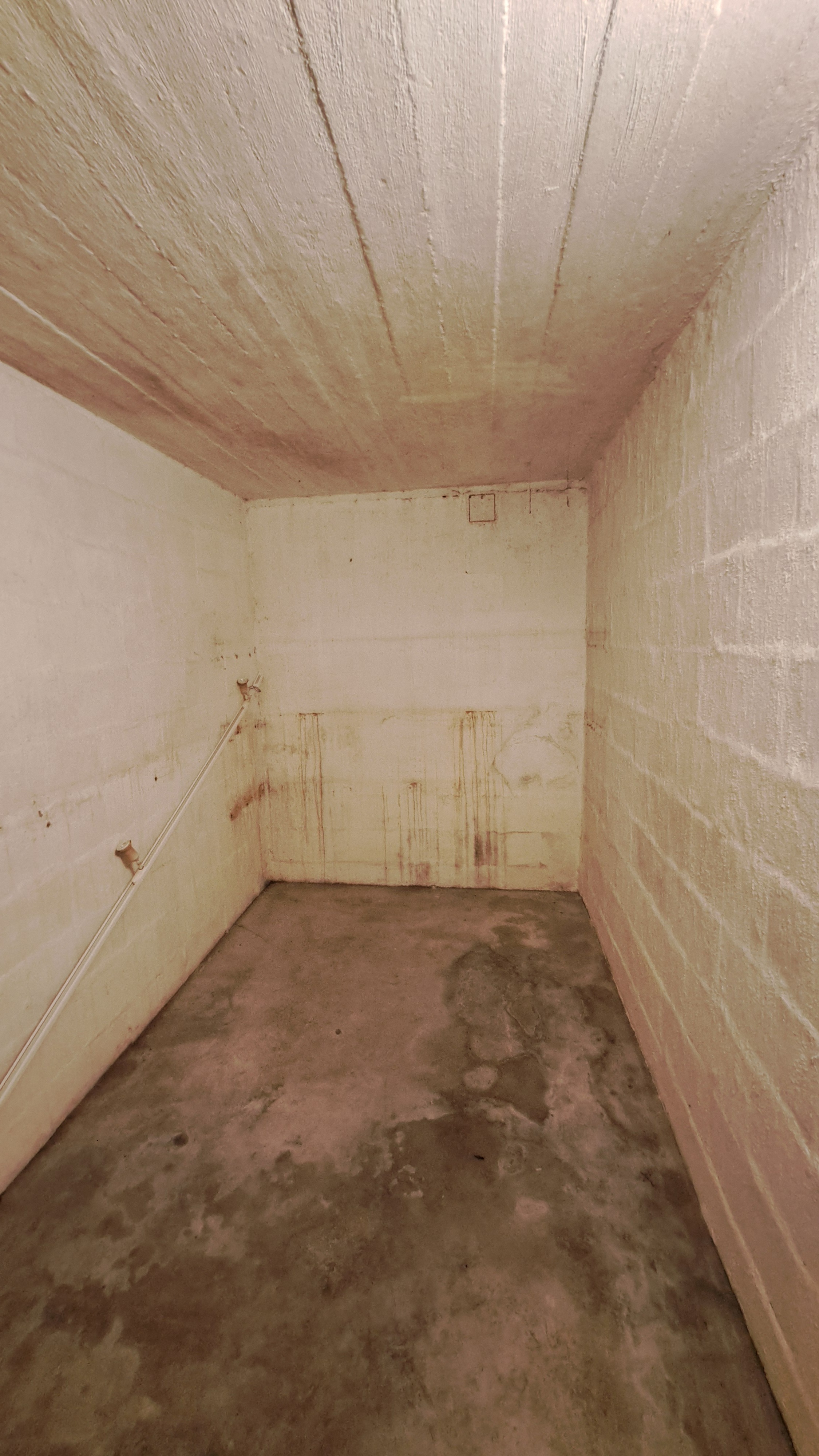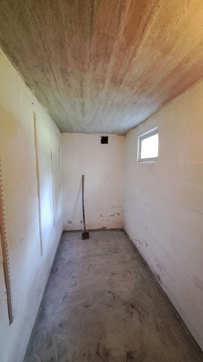 Kellarikerroksessa remontointia kaipaava sauna, josta purettu pois kiuas ja lauteet.