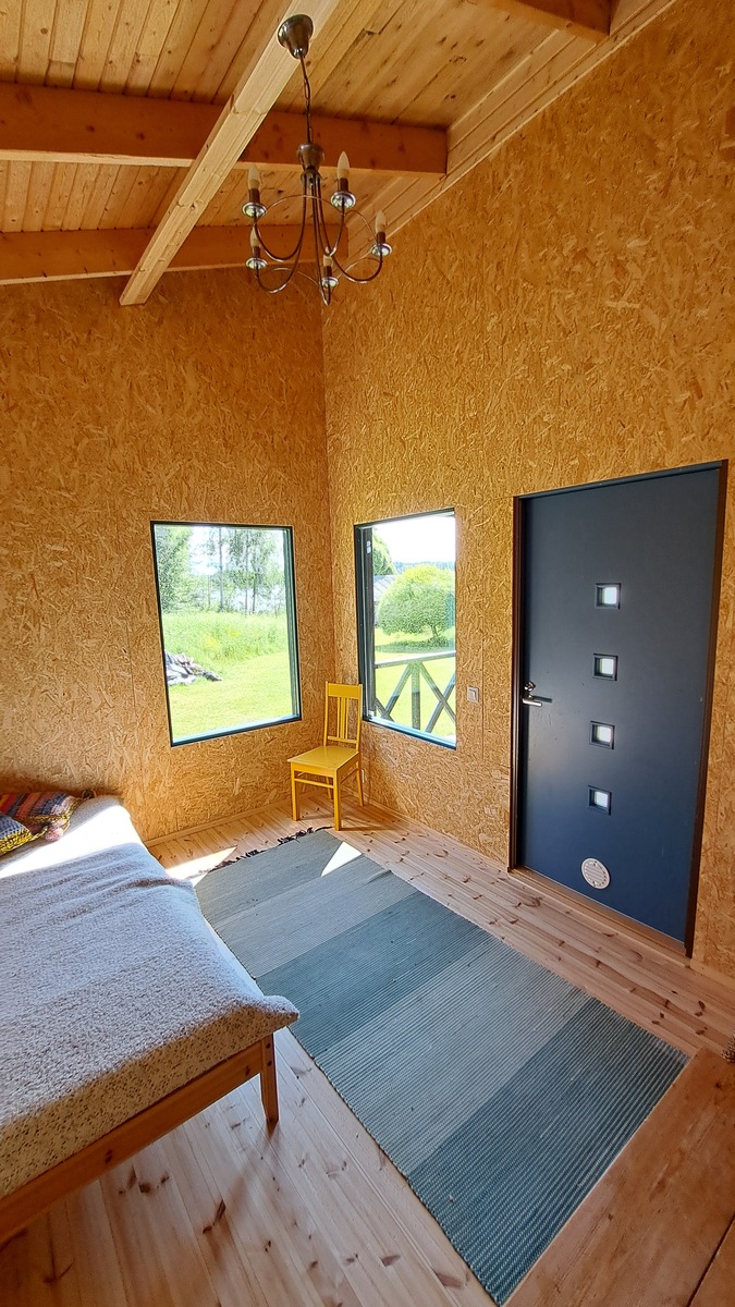 Pintamateriaalit: lattia lakattu puu, seinät ja katto paneeli.