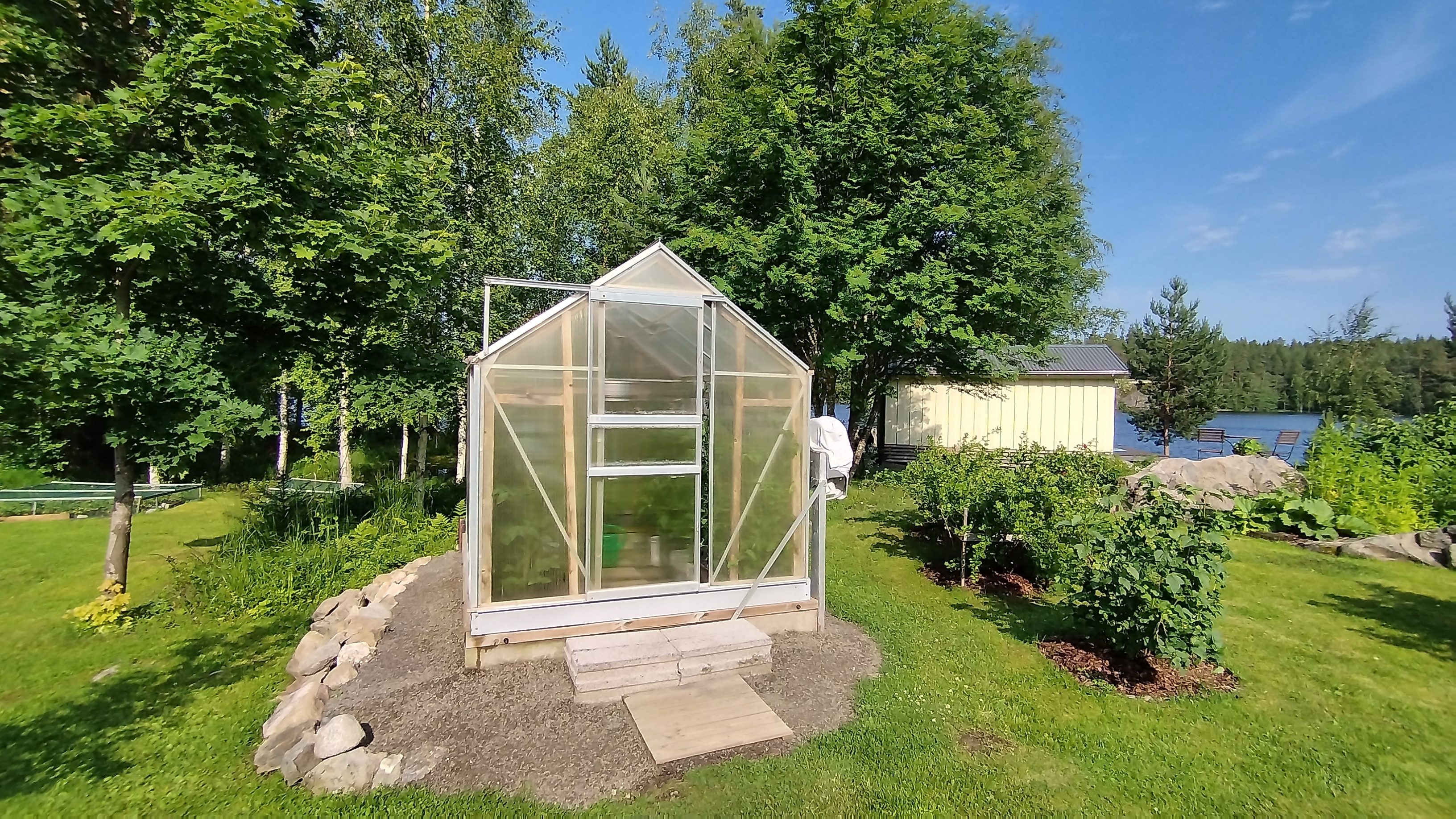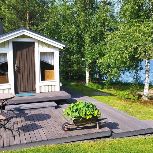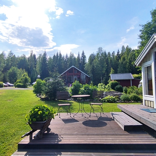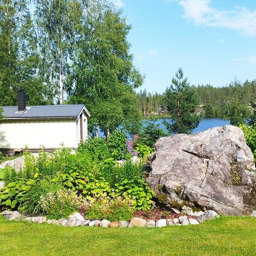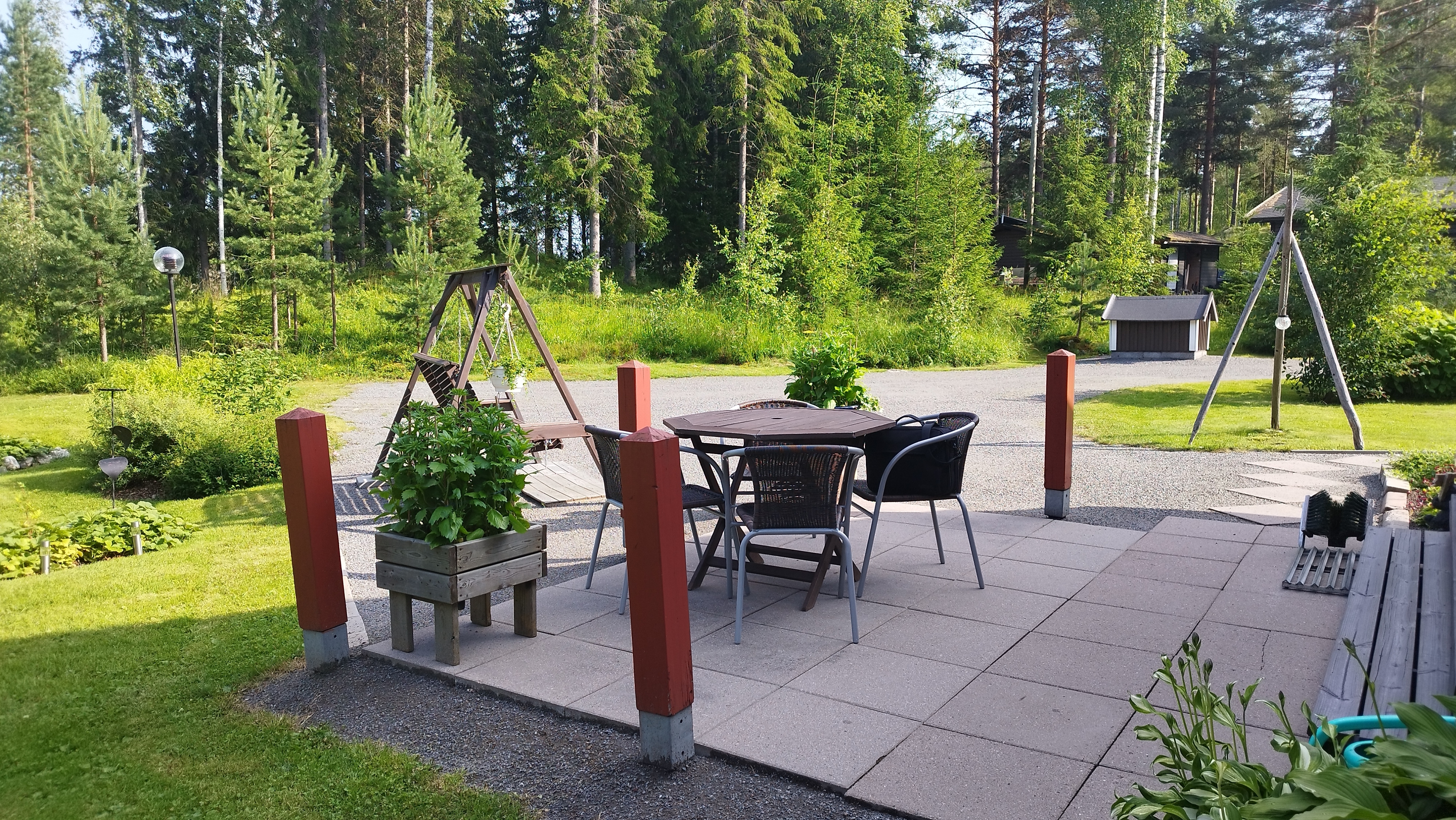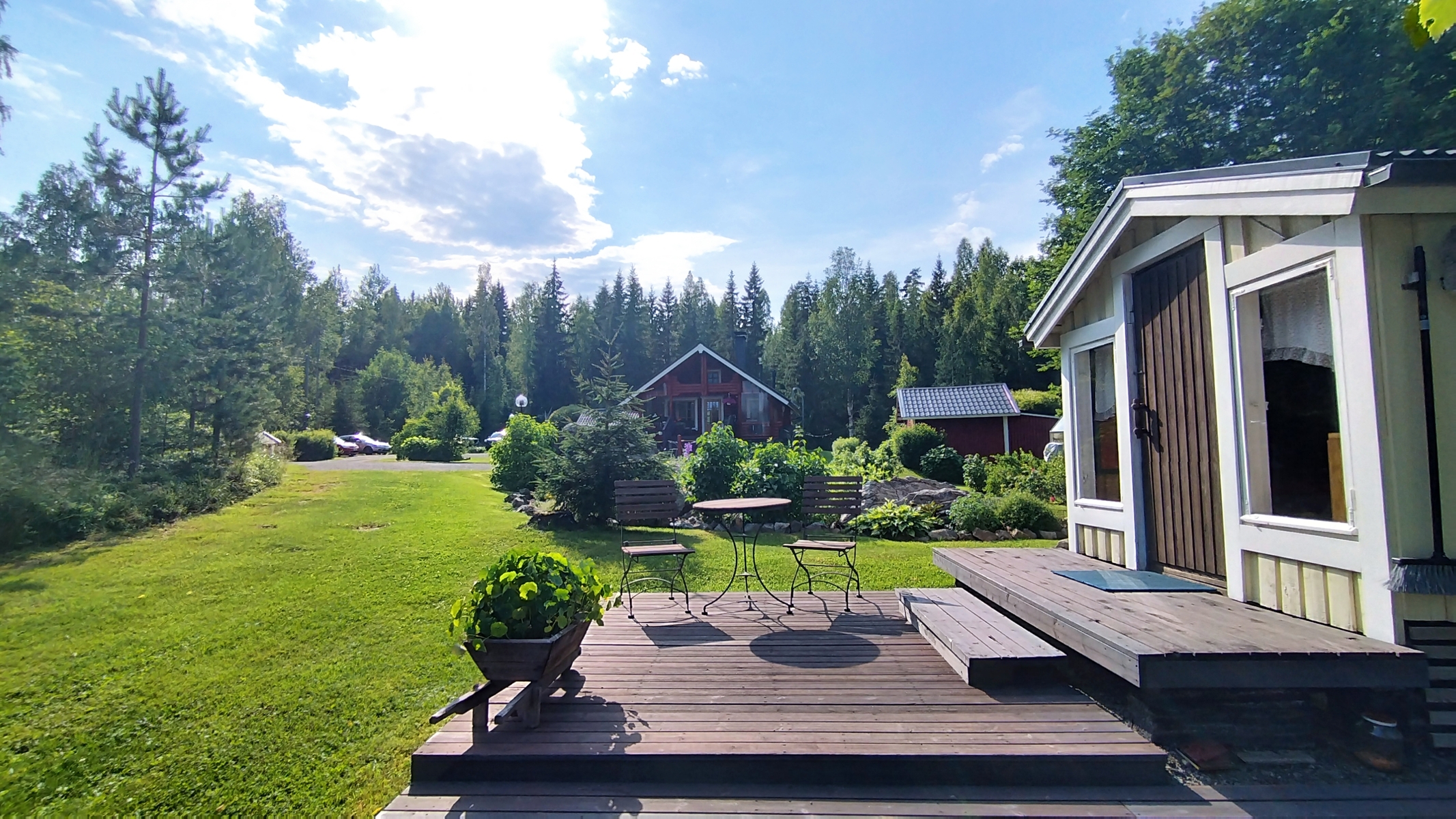 Terassilta avautuu näkymä puutarhaan ja järvelle.