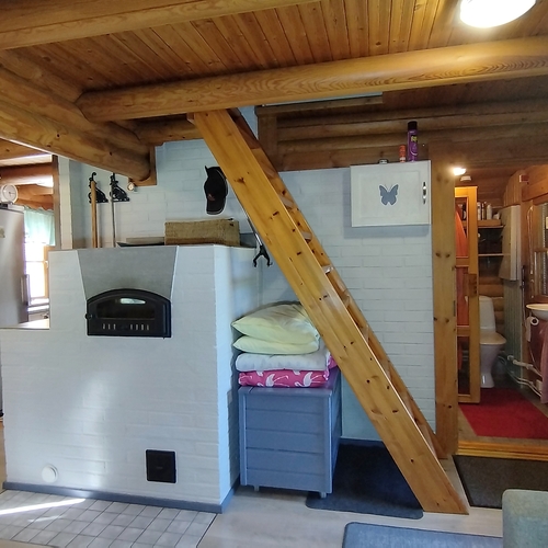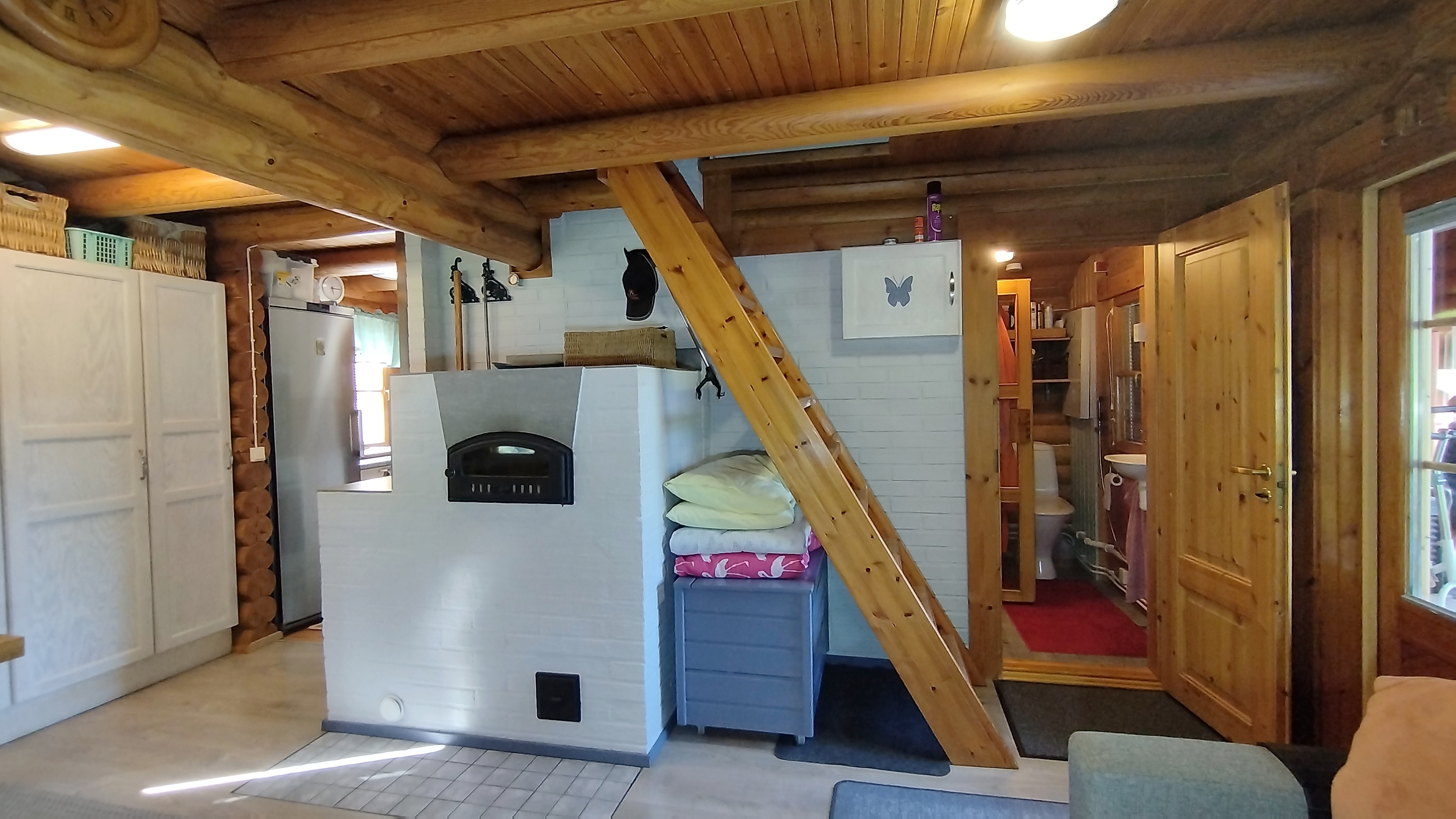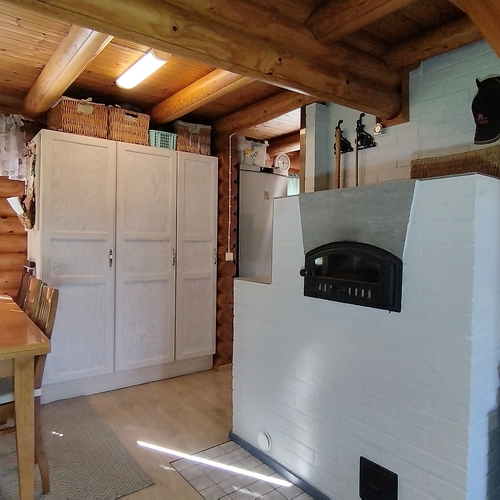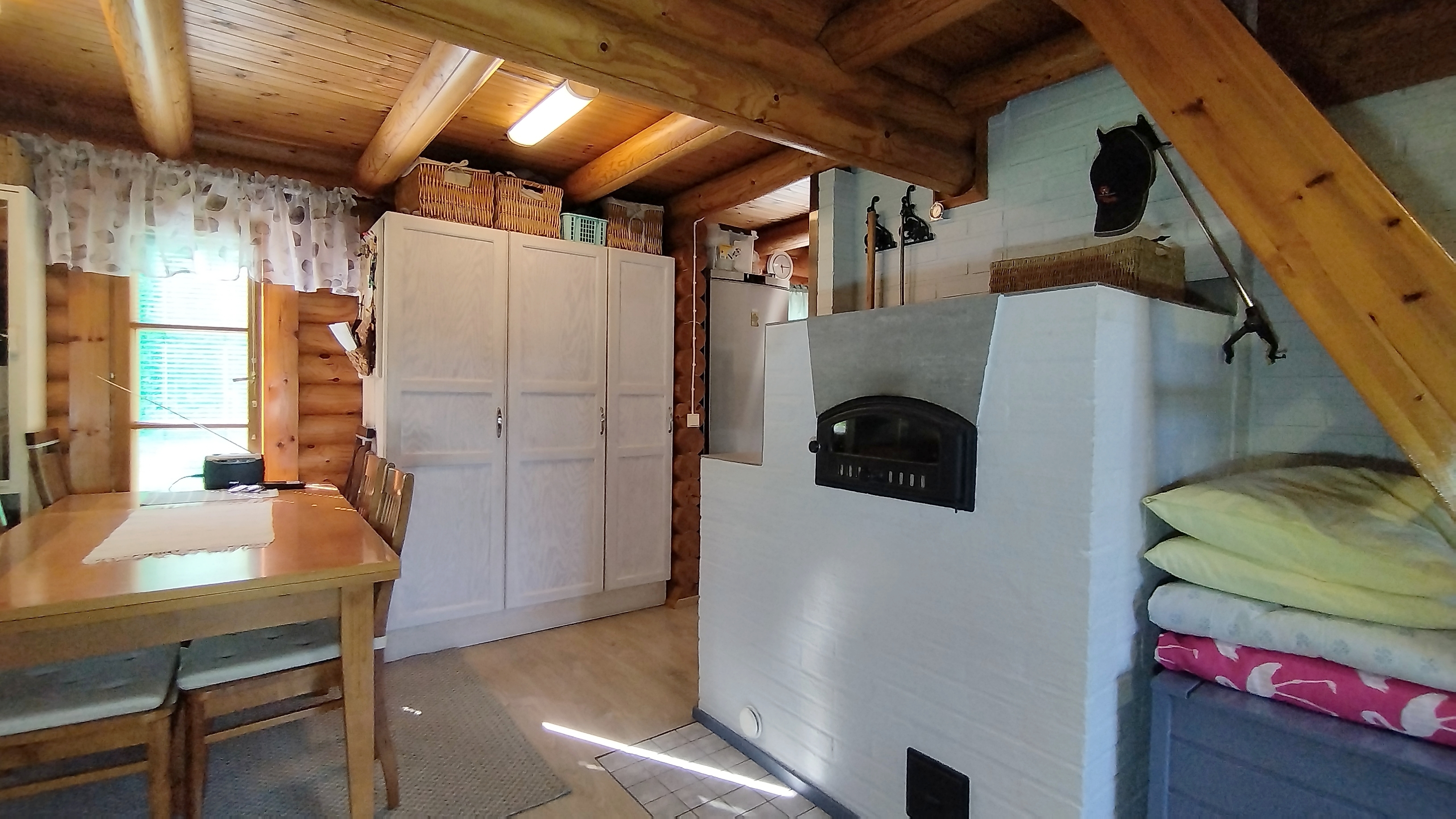 Varaava leivinuuni on keskellä mökkiä ja lämmittää koko mökin.