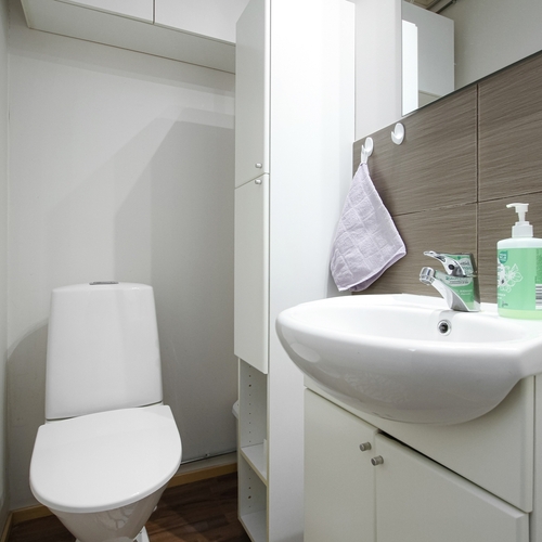 Varusteet: suihku, suihkuseinä, kiinteät valaisimet, lattialämmitys, pesukoneliitäntä, peilikaappi, kylpyhuonekaapistot