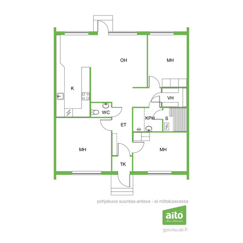 Varusteet: jääkaappipakastin, astianpesukone, astianpesukoneliitäntä, induktioliesi, liesituuletin hormilla, mikroaaltouuni, erillisuuni