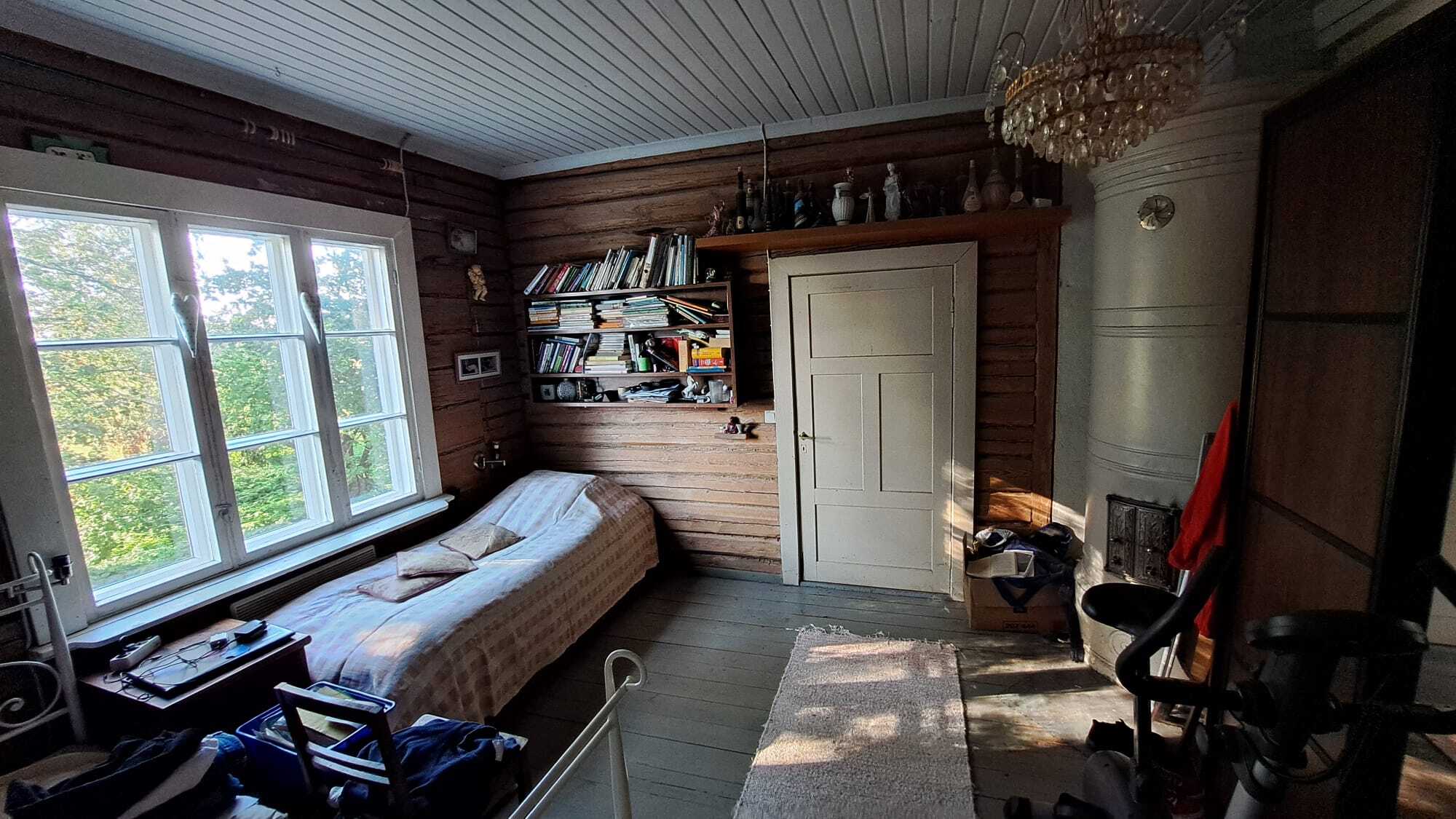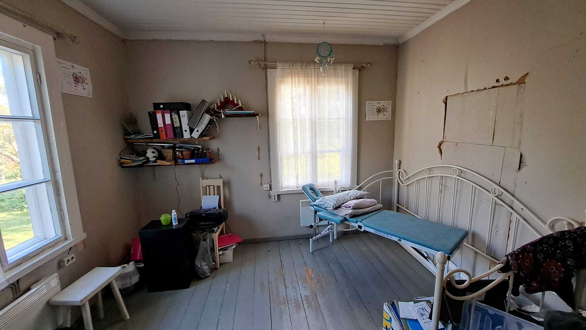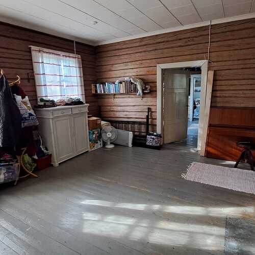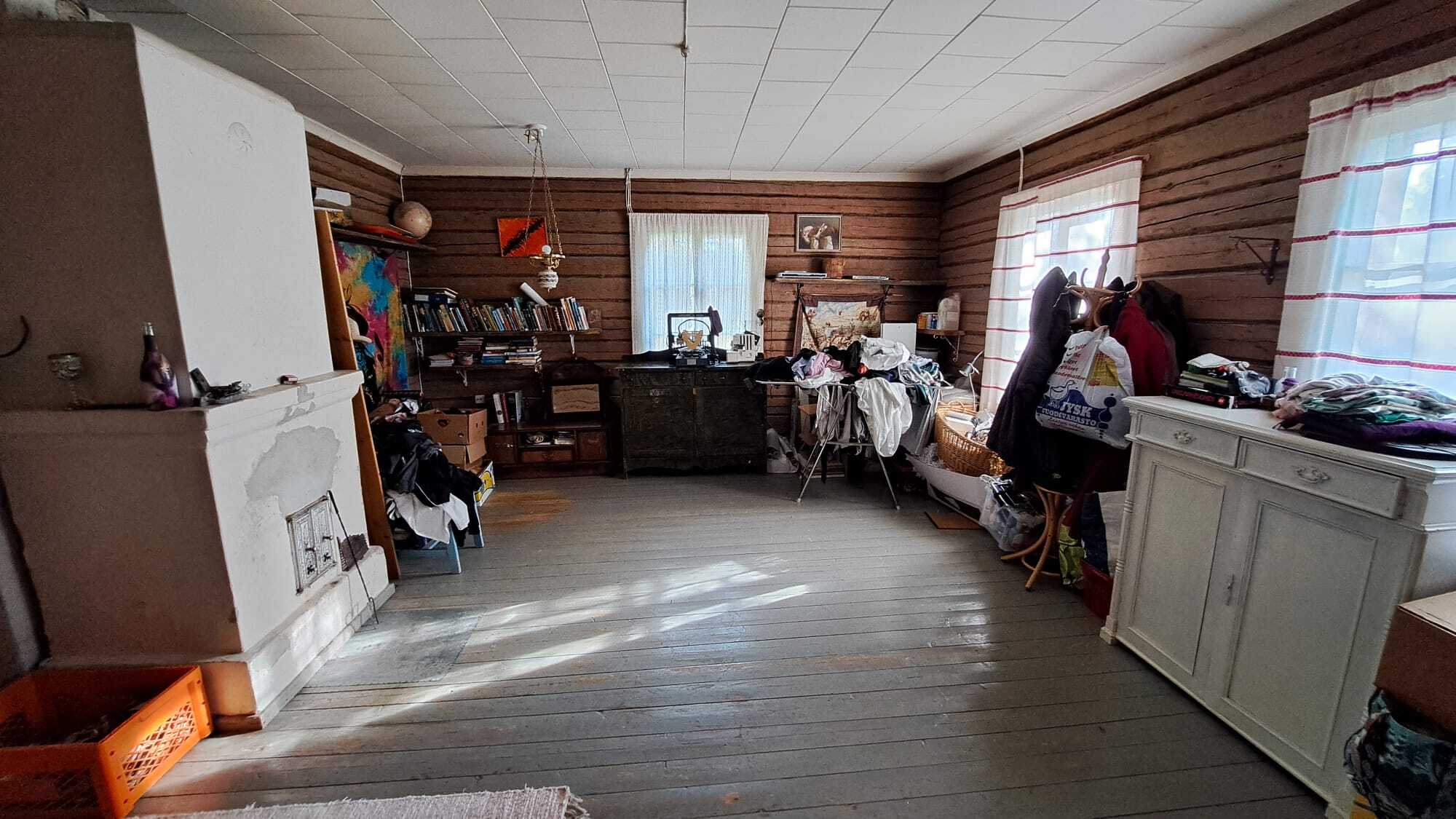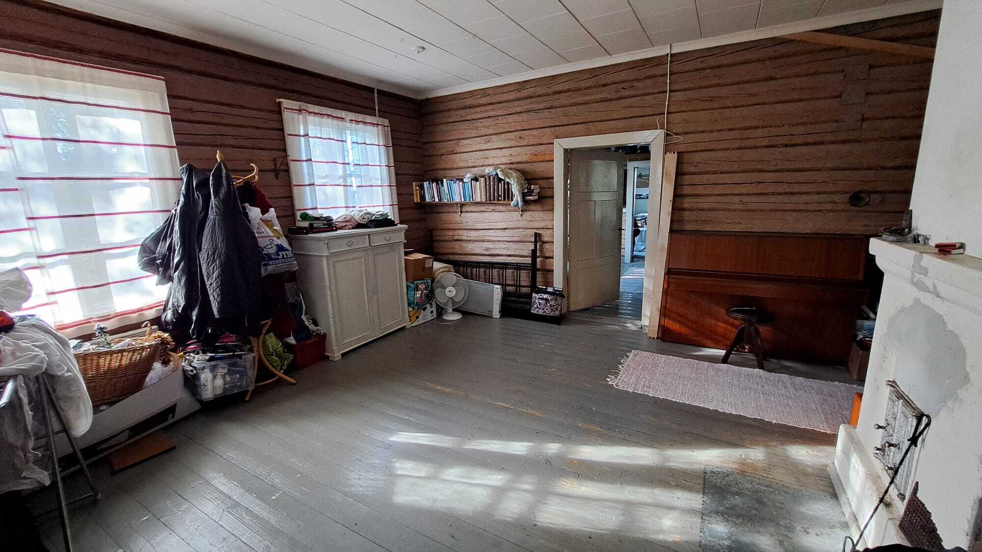 Pintamateriaalit: lattia maalattu lankku, seinät puolipaneeli/maalattu levy ja osin hirsi, Katto maalattu paneeli.
