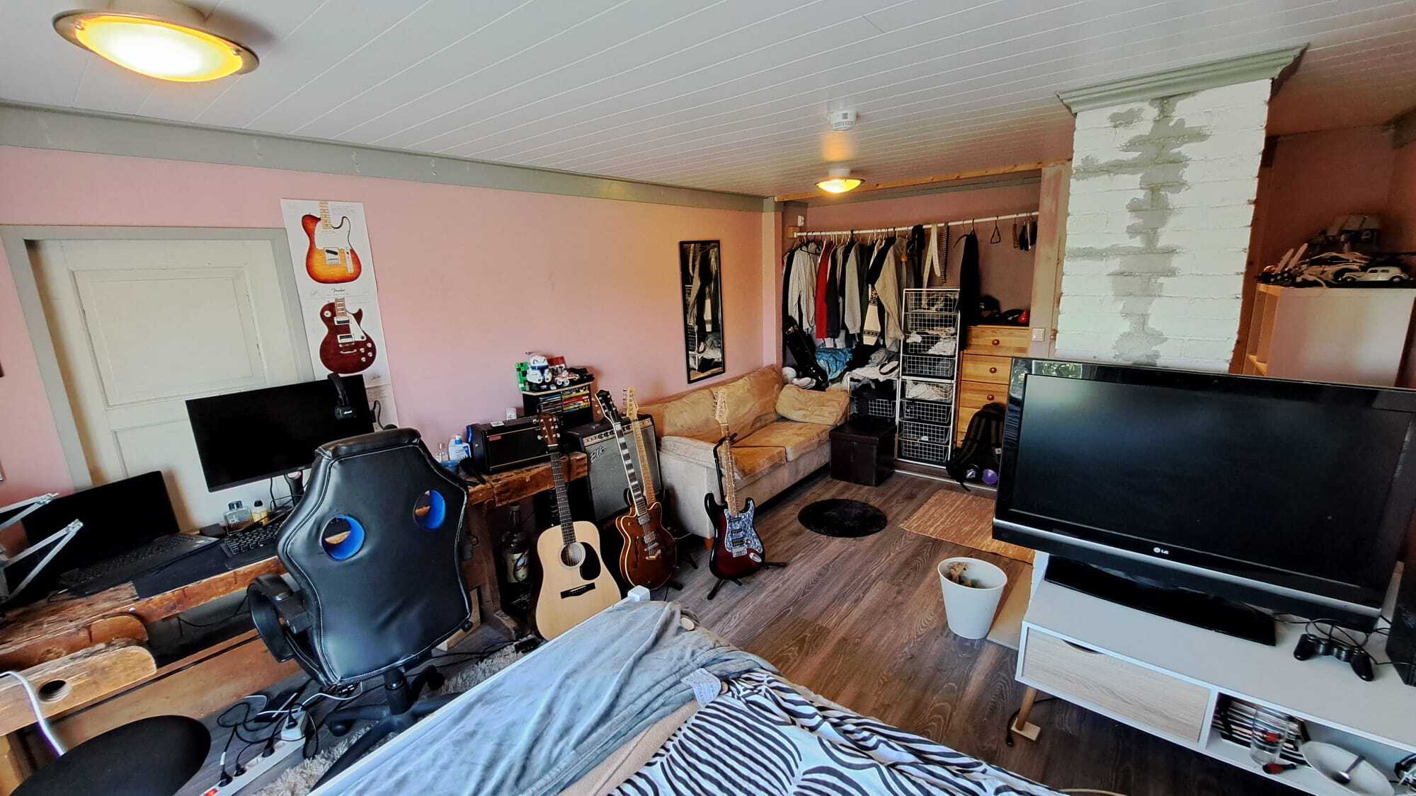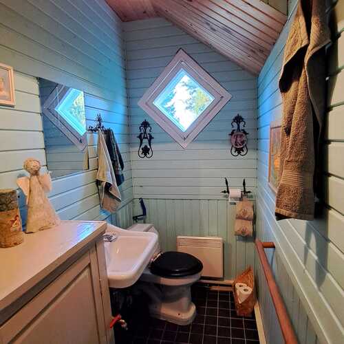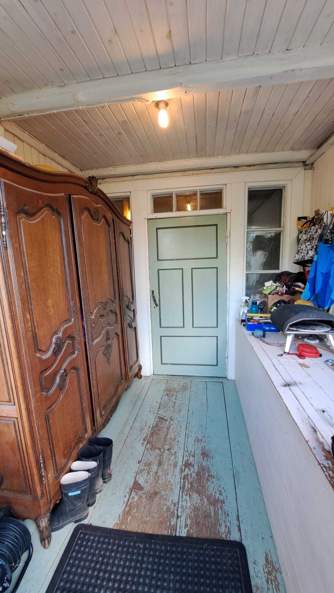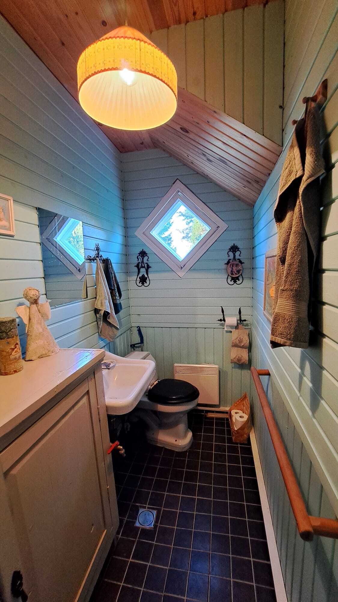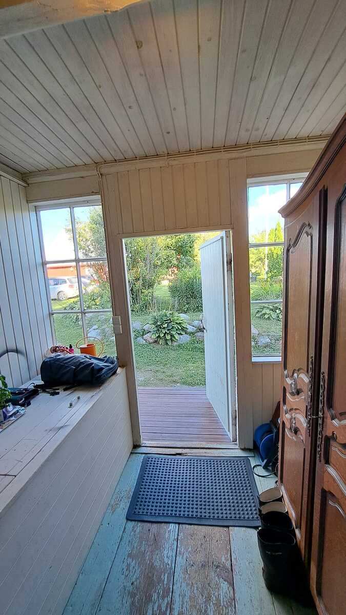 Pintamateriaalit: lattia maalattu lankku, seinät puolipaneeli/maalattu levy ja osin hirsi, Katto maalattu paneeli.