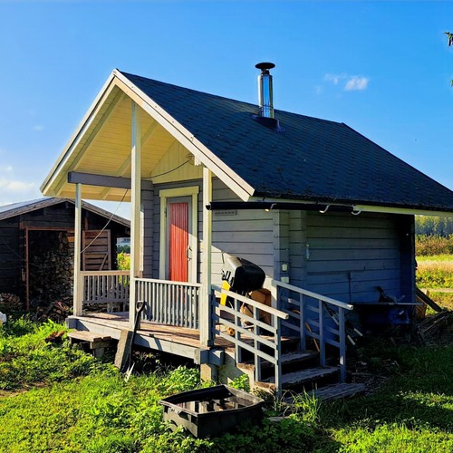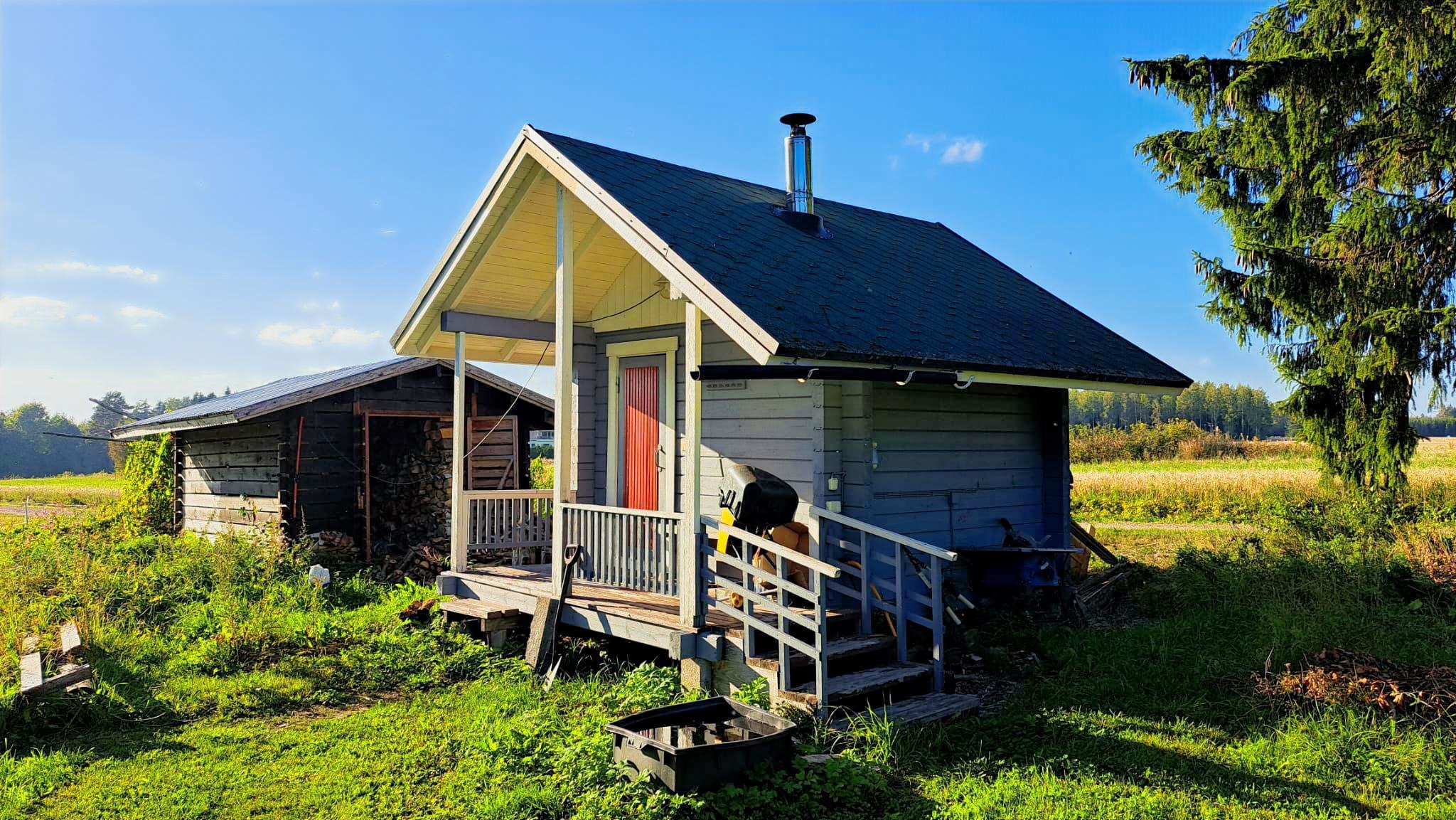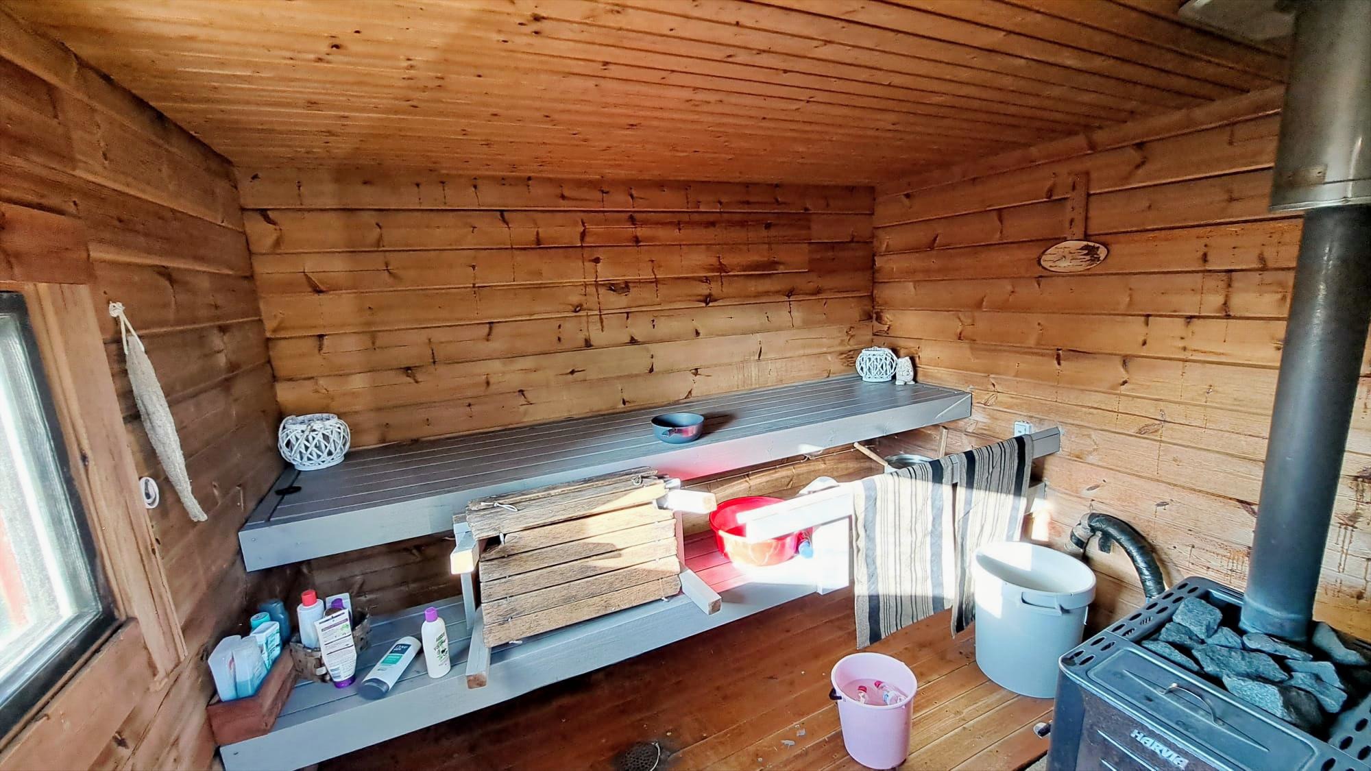 N. 15 v. sitten rakennettu kevythirsinen pihasauna, jossa puulämmitteinen kiuas kuumavesisäiliöllä, kevythormi. Pilariperusta, harjakatto, kateaineena pelti. Sähkö, vesijohto kaivolta (saattokaapeli), viemäröinti maahan imeytykseen.