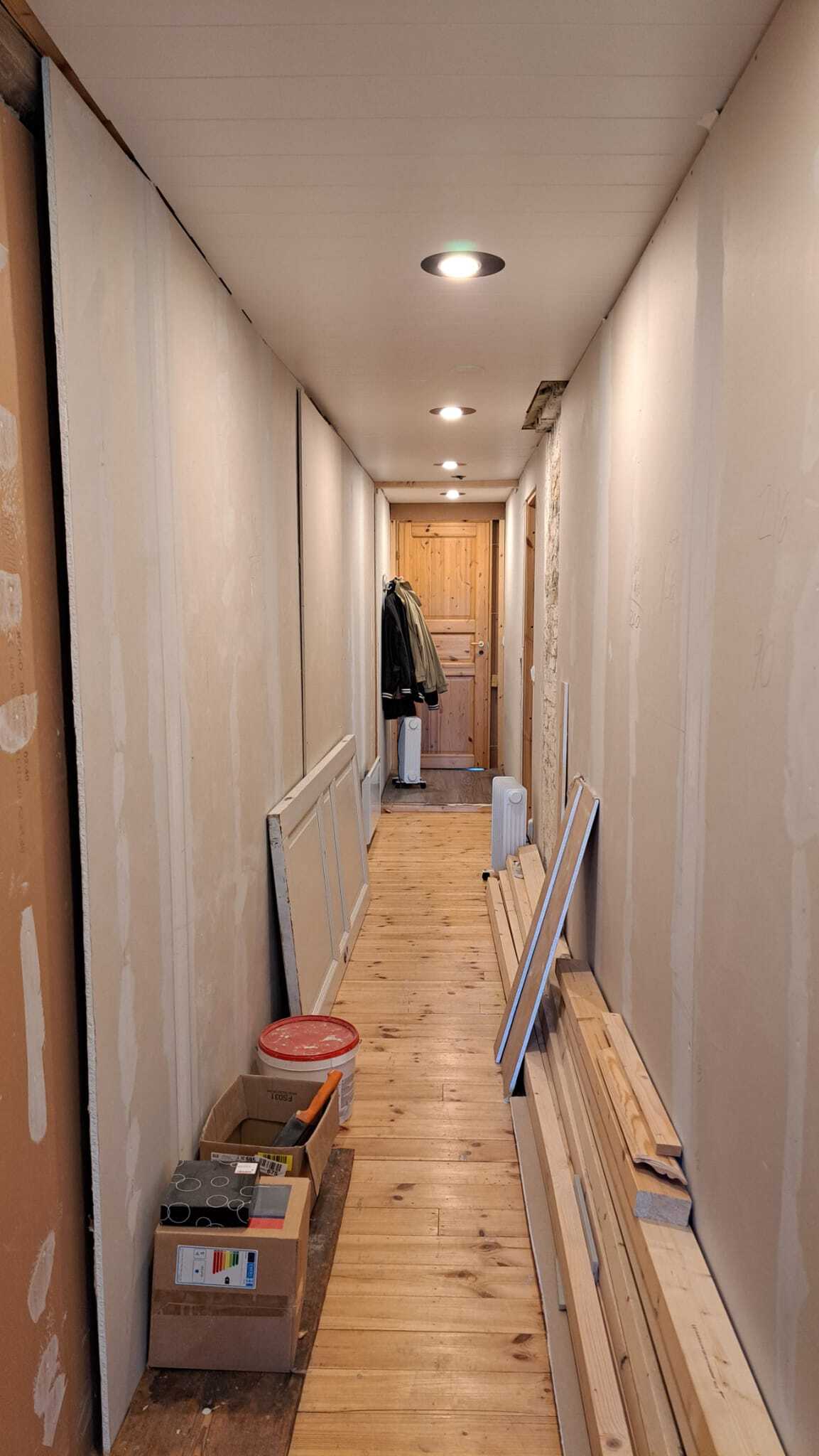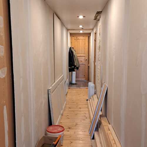 joka keskeneräinen. Käytävä ja aulatila myös viimeistelyä vaille.