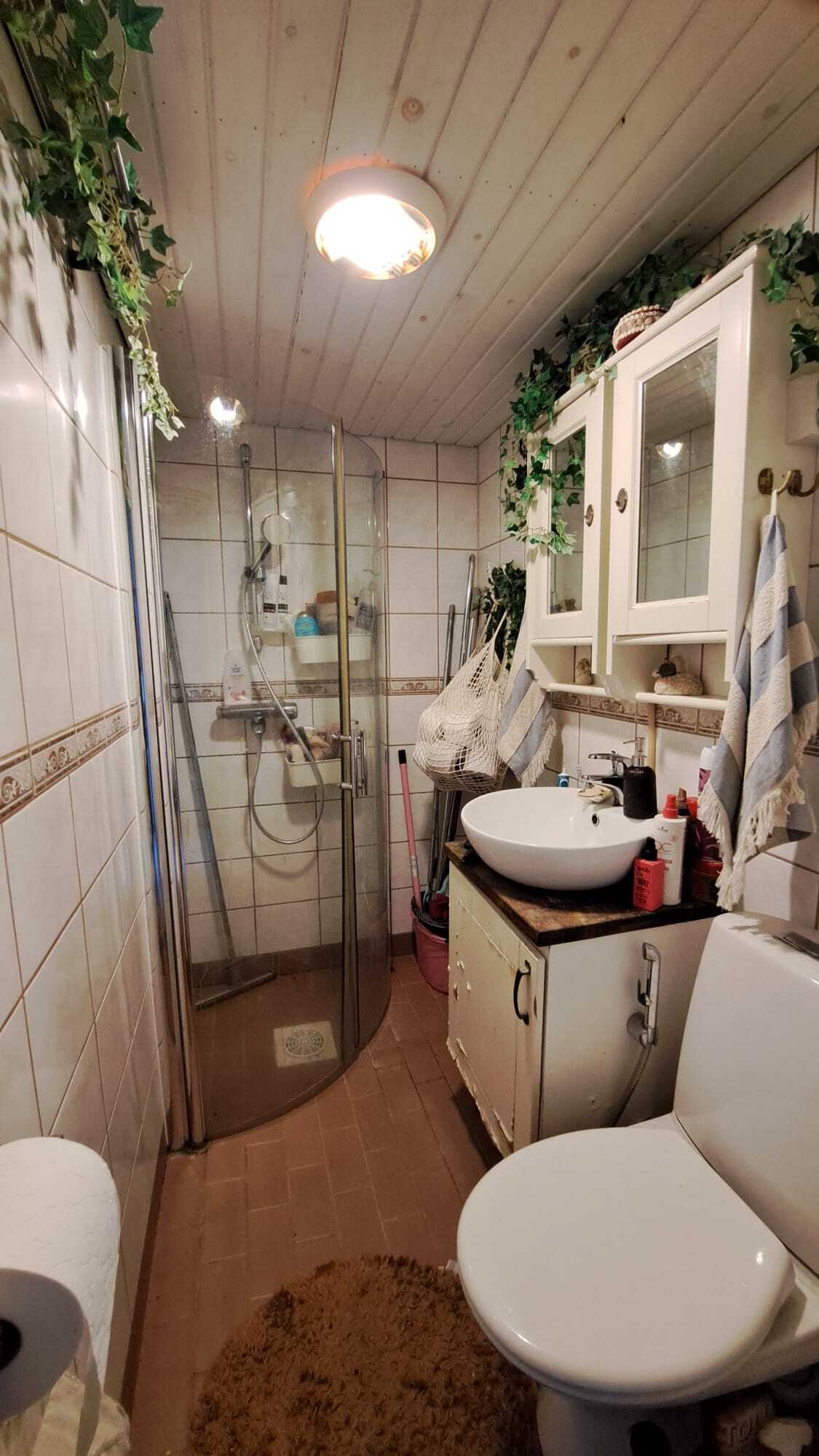 Yläkerrassa: 1 kpl keskeneräinen wc/suihkutila, jossa varaus pesukoneelle.