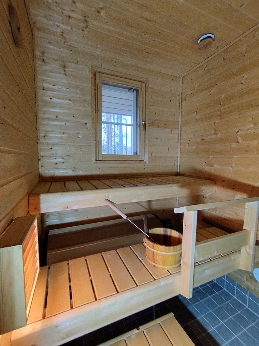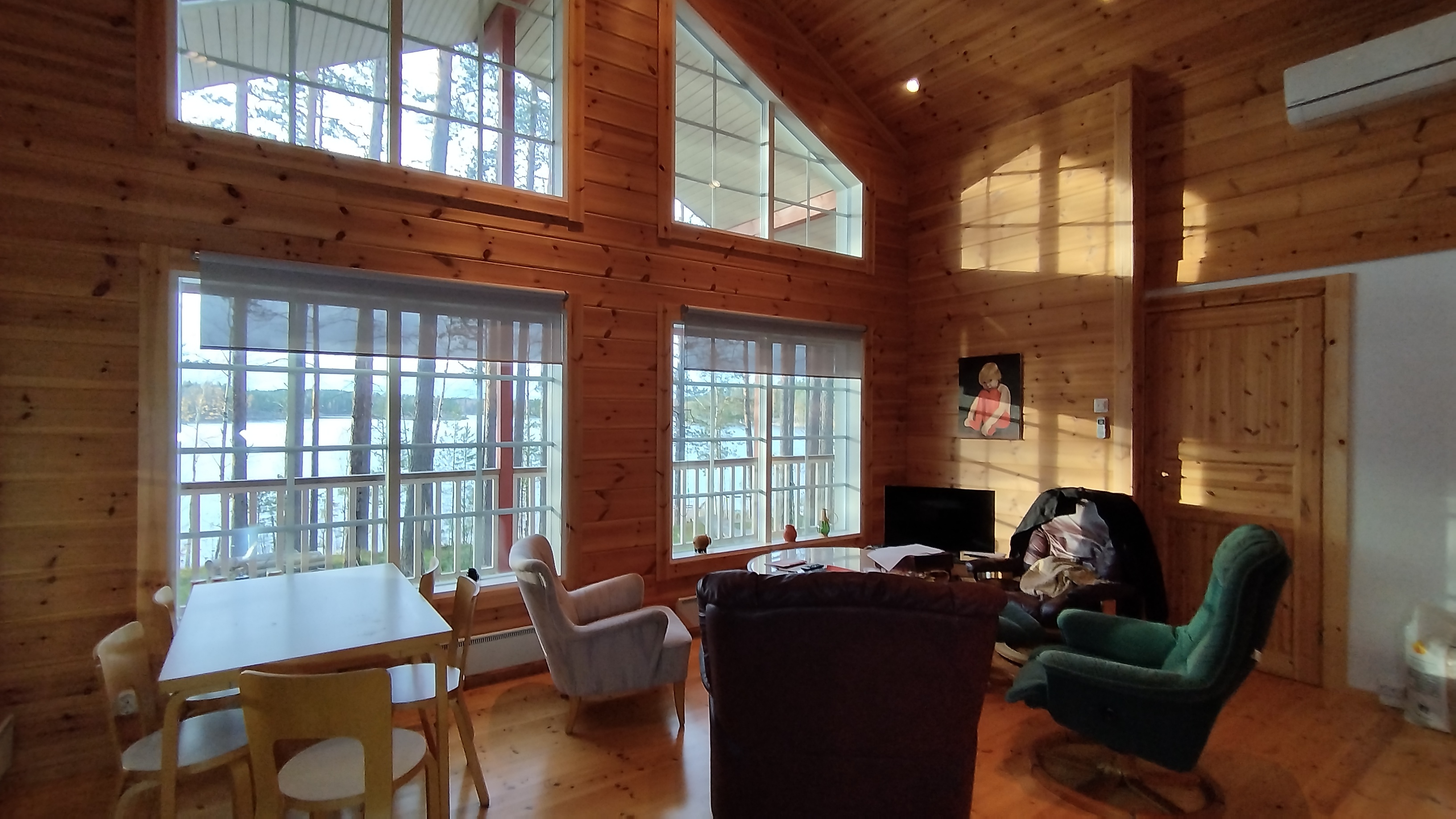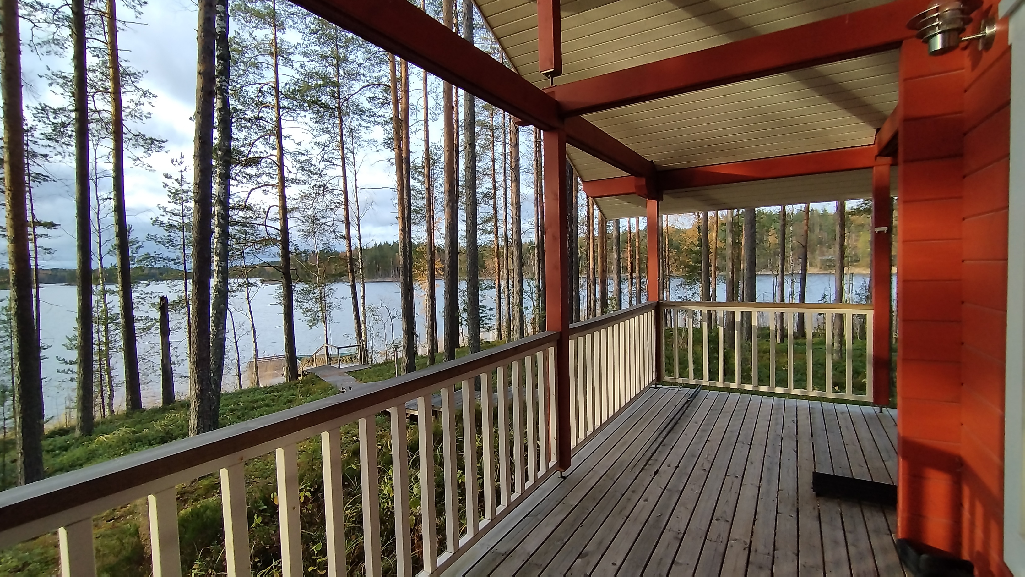 Valoisa olohuone avautuu suurin maisemaikkunoin Saimaalle, ja keittiö on varusteltu nykyaikaisesti – astianpesukone, erillisuuni, mikro ja jääkaappipakastin tekevät arjesta sujuvaa. Huvilassa on kaksi makuuhuonetta, tilava parvi sekä sauna, joka lämpiää aidolla puukiukaalla. Katettu terassi ja luonnonläheinen piha viimeistelevät idyllisen kokonaisuuden.