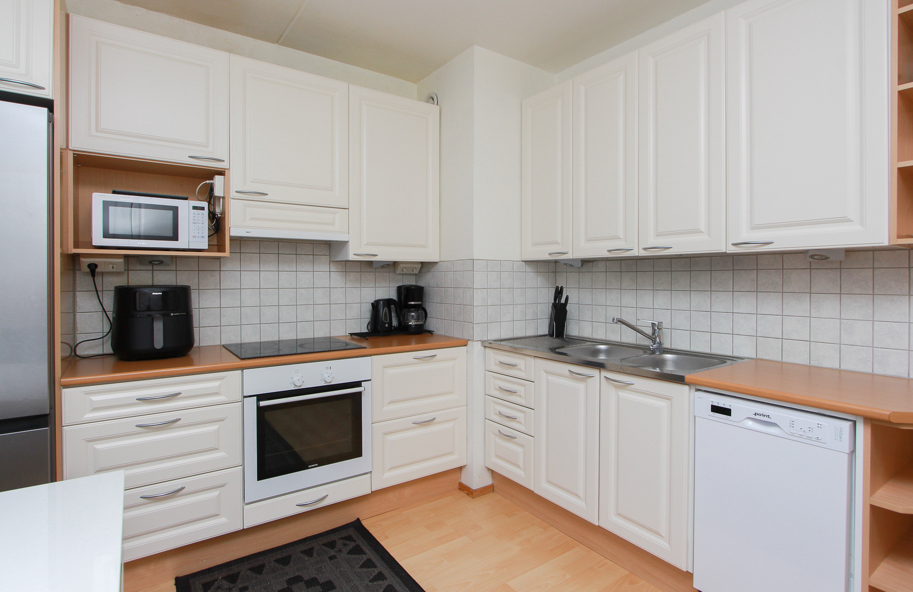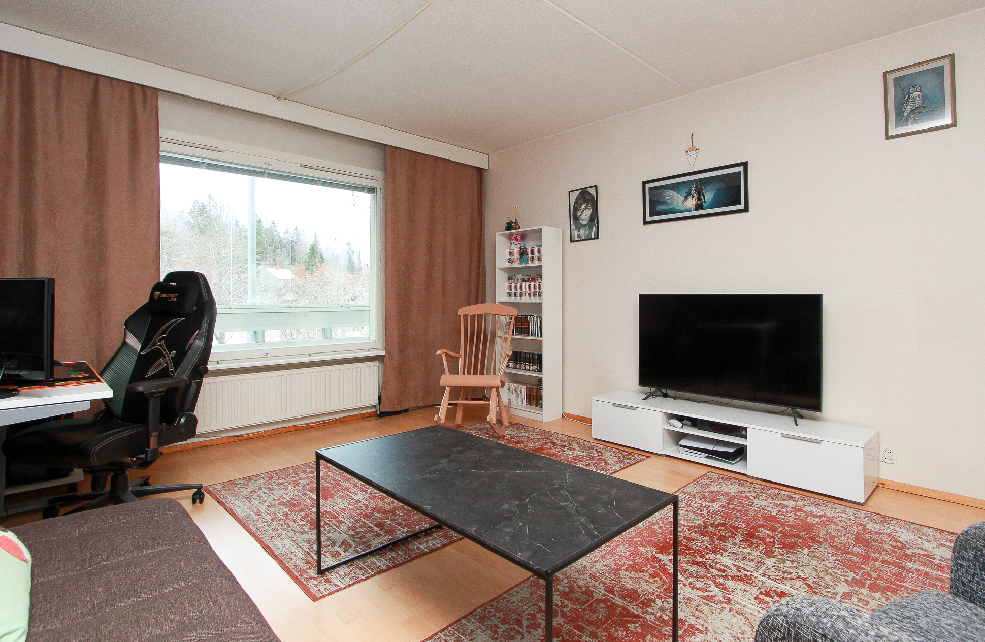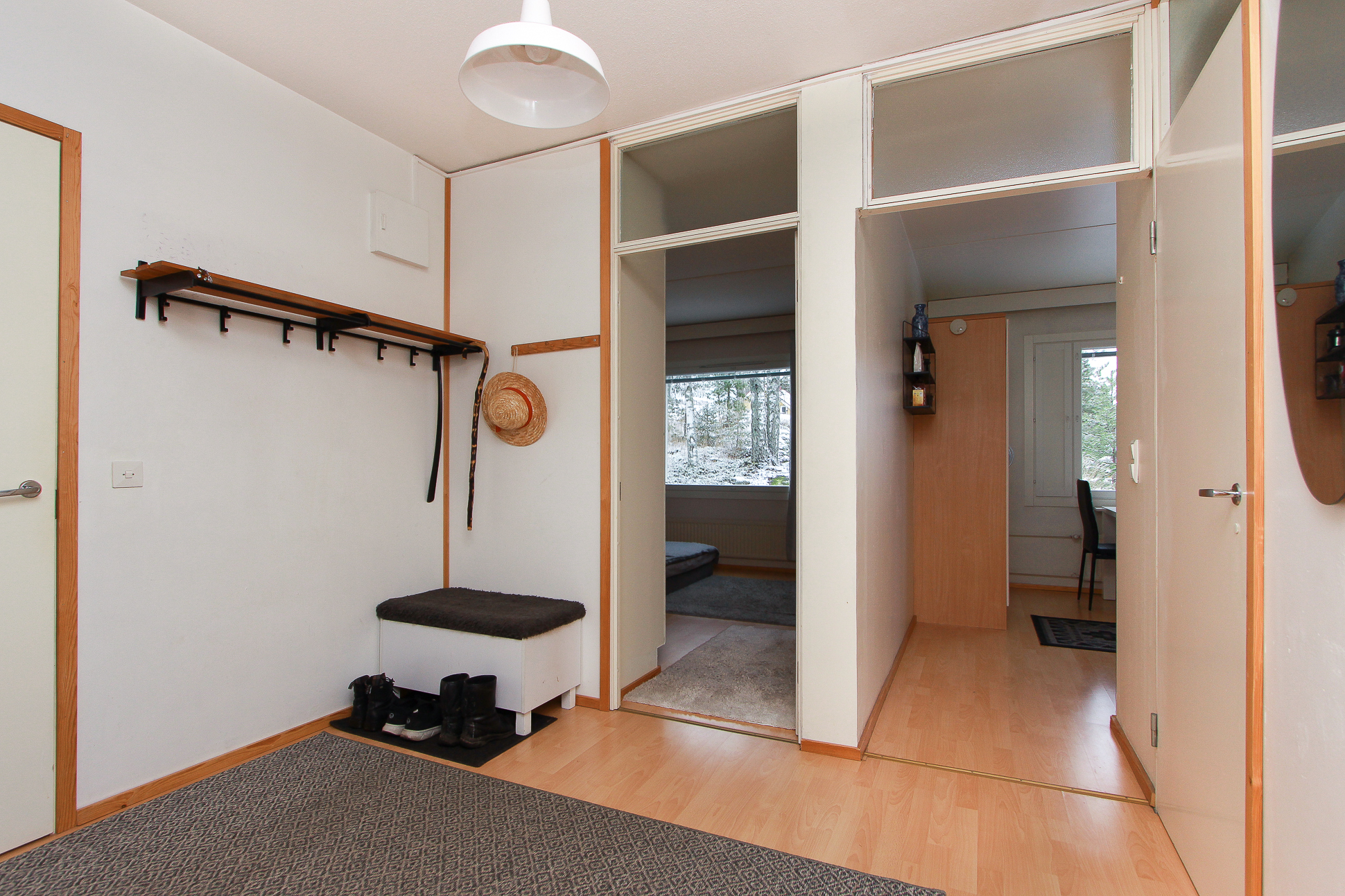 Päätyasunnon sijainti lisää rauhaa ja yksityisyyttä ja ensimmäisen kerroksen sijainti yhdet portaat ylös tekee liikkumisesta helppoa kaikenikäisille.