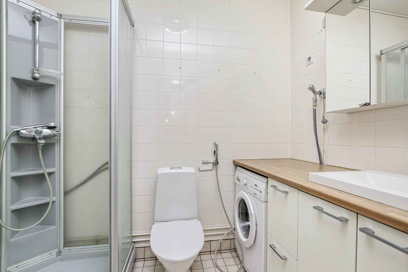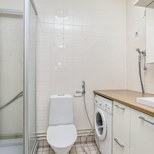 Varusteet: suihku, suihkukaappi, pesukoneliitäntä, pesukone, allaskaappi, peilikaappi