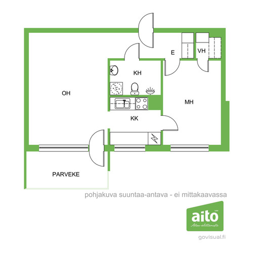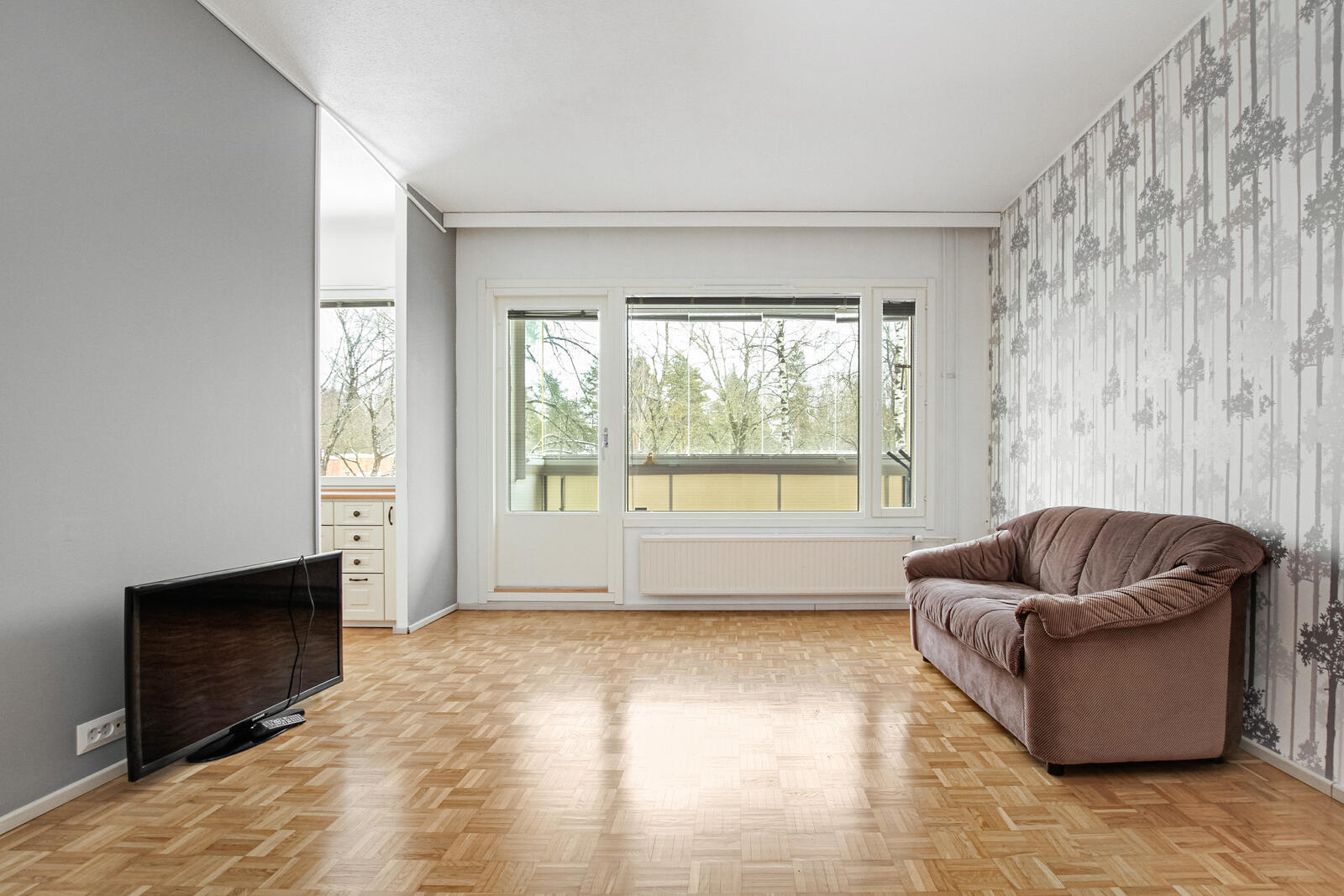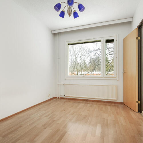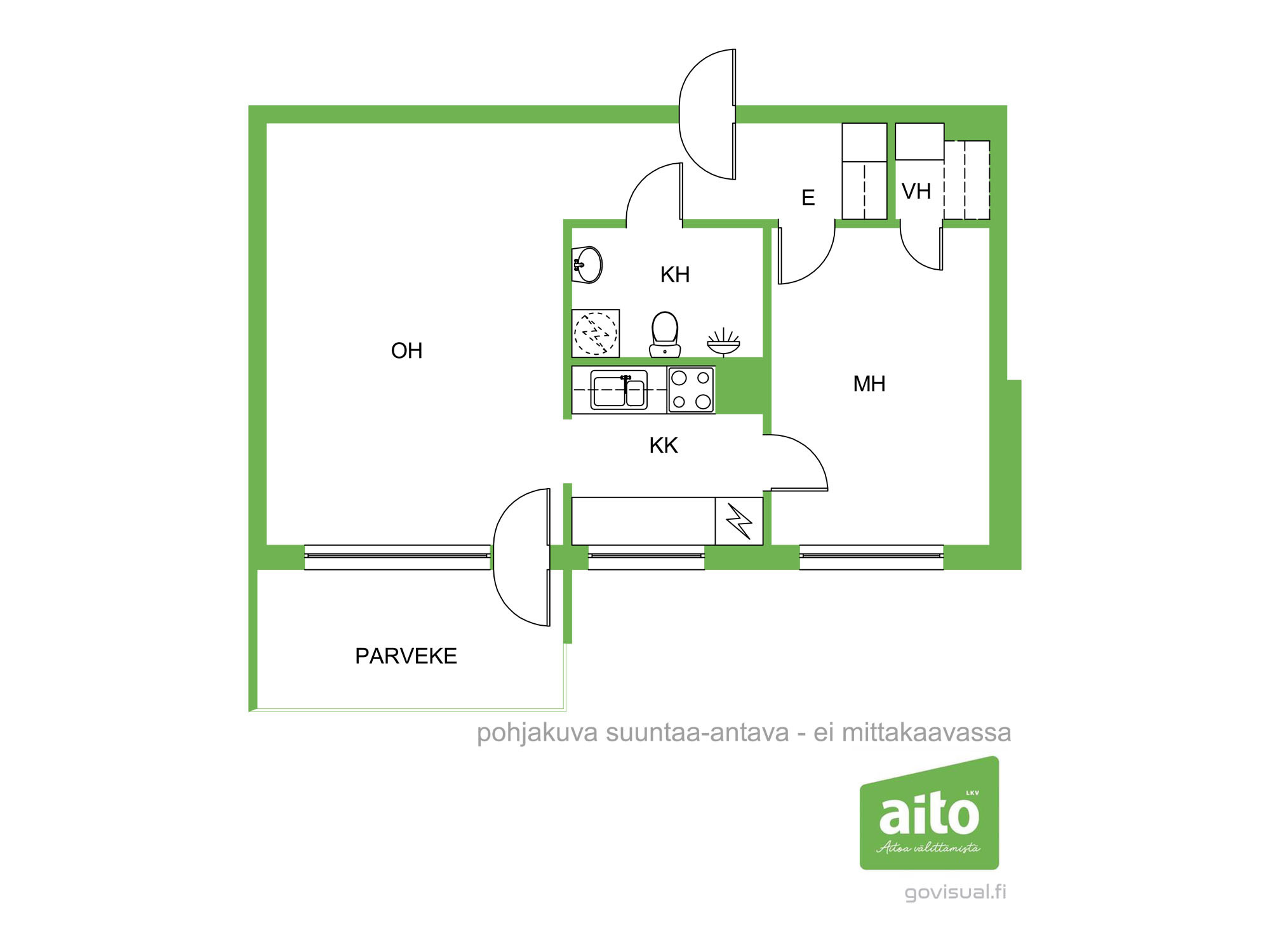 Asunnon pohjaratkaisu on käytännöllinen ja toimiva, tarjoten tilaa sekä yhdessäoloon että yksityisyyteen. Makuuhuone on rauhallinen ja kylpyhuone on tilava.