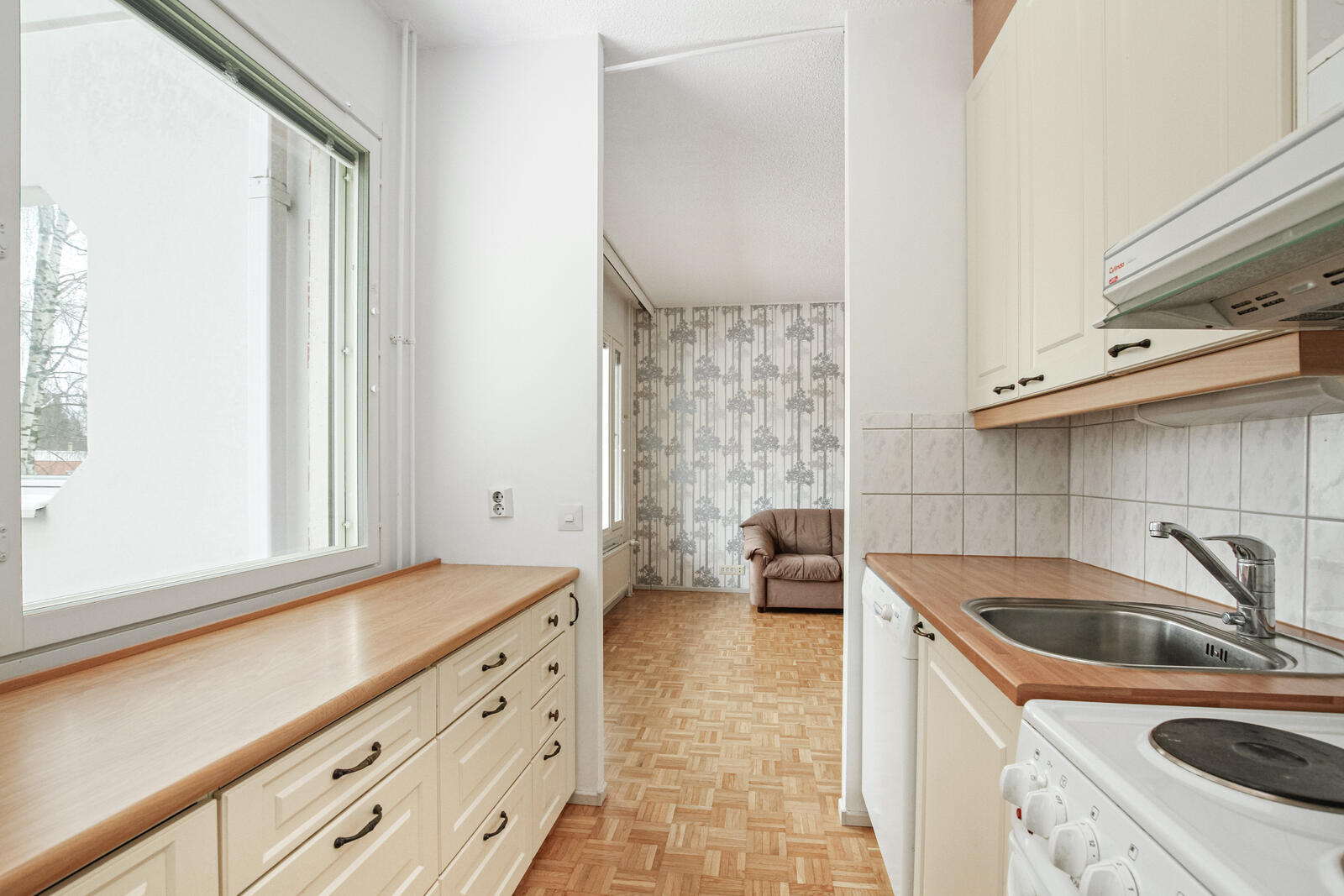 ikkunallinen keittokomero, jonka läpi pääsee kulkemaan