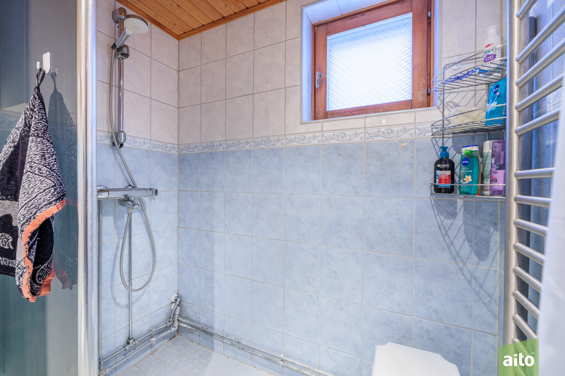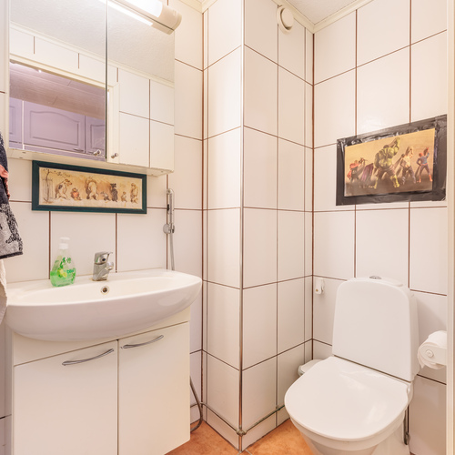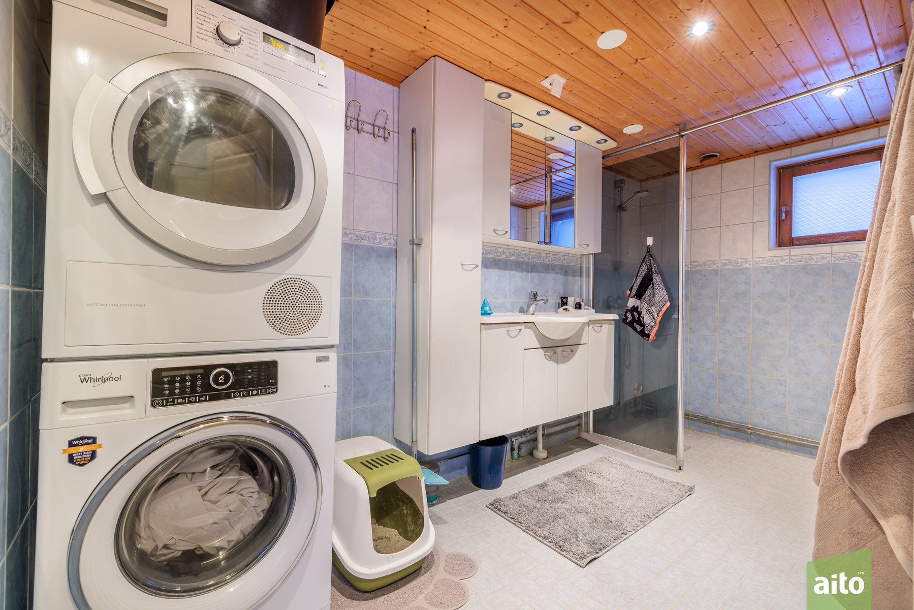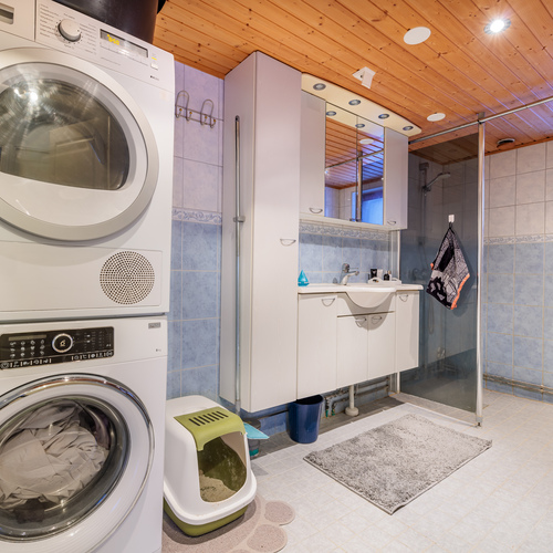 Kylpyhuoneessa on suihku, suihkuseinä, allaskaappi, peilikaappi, pesukonevalmius sekä avattava ikkuna, joka tuo luonnonvaloa ja helpottaa tuuletusta.
