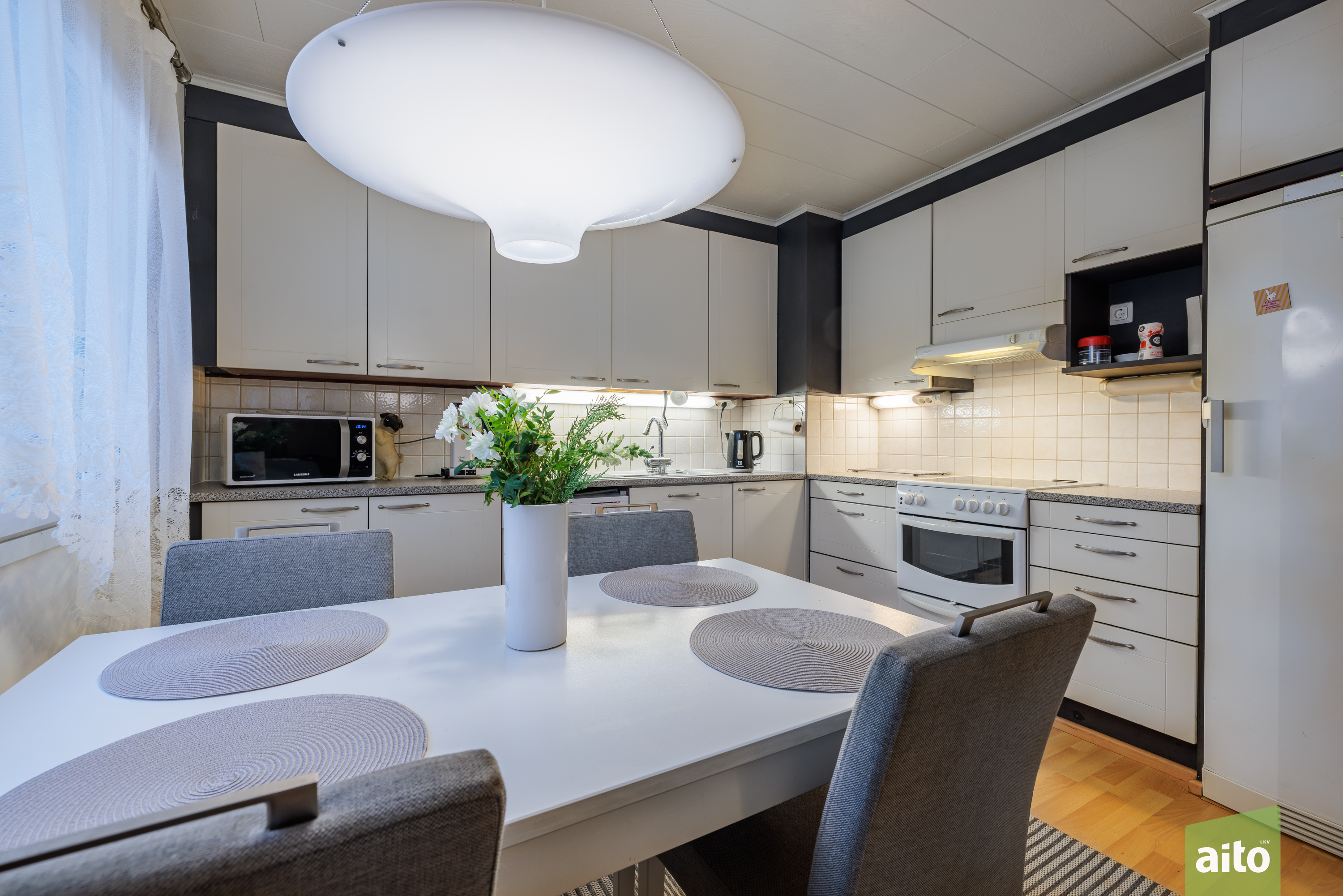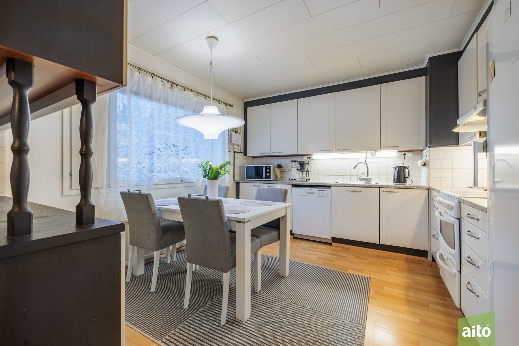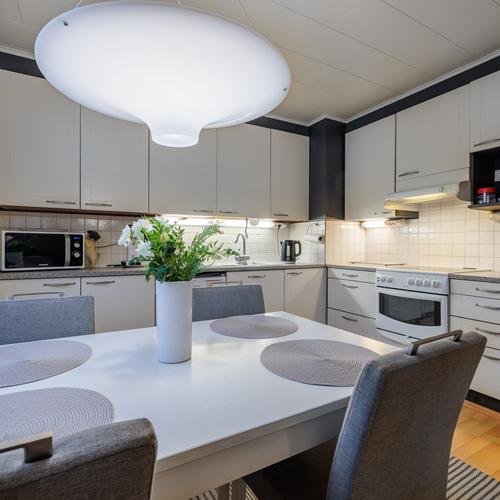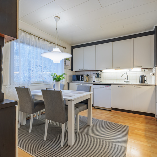 Keittiössä on hyvin tilaa suurelle ruokapöydälle ja varusteluun kuuluvat astianpesukone, keraaminen liesi, liesituuletin, jääkaappi ja pakastin.