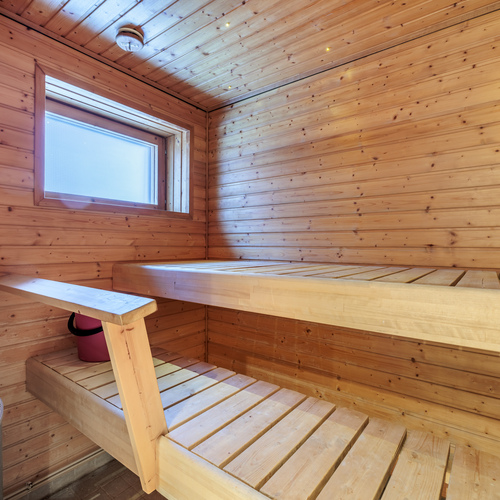 Saunassa on sähkökäyttöinen kiuas, laattalattia sekä paneelipinnat seinissä ja katossa – myös täällä avattava ikkuna.