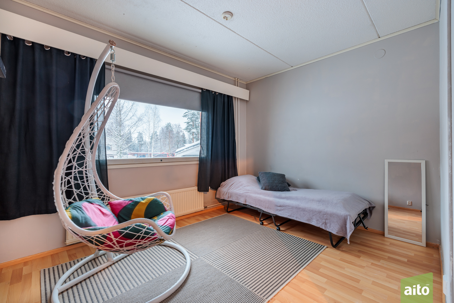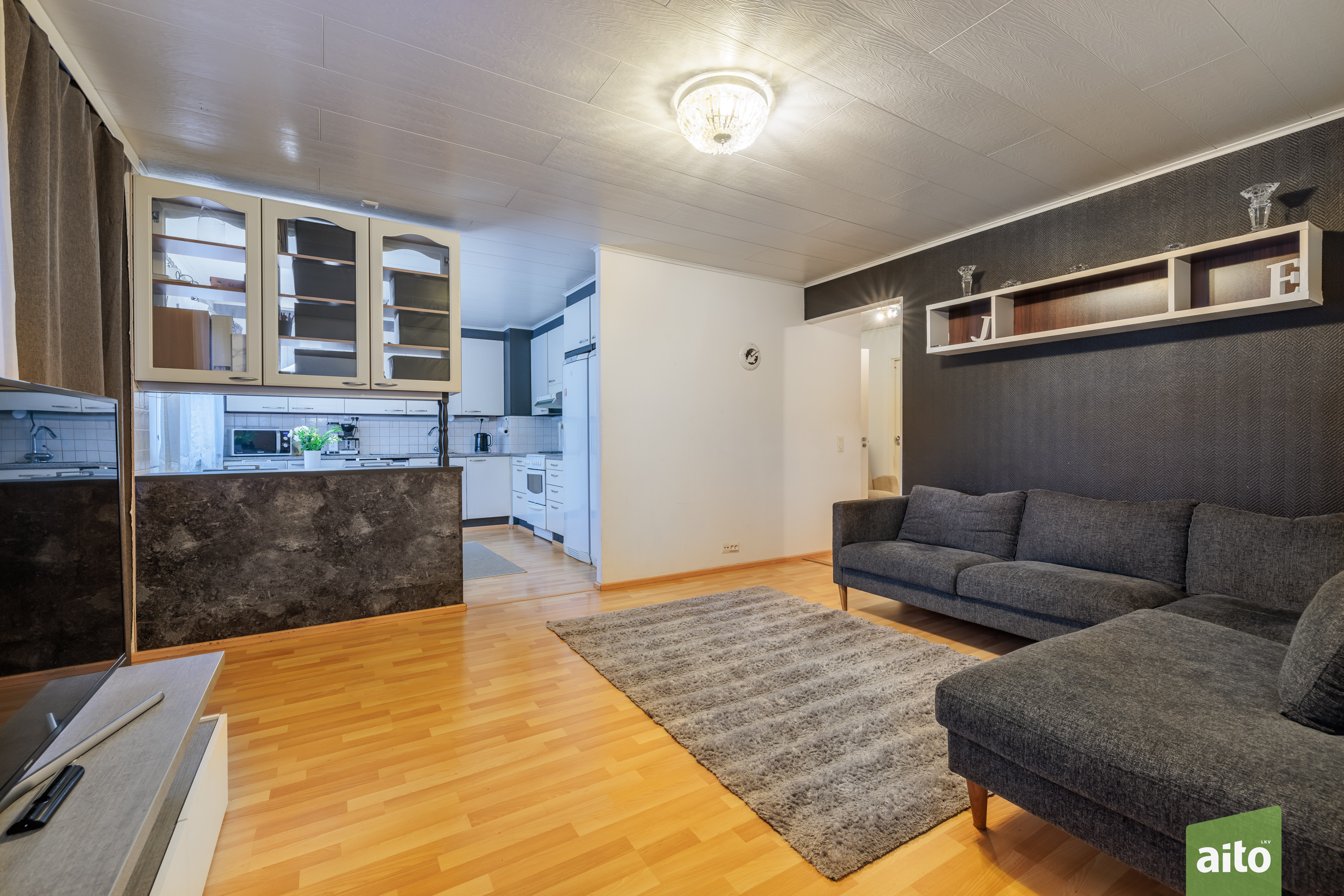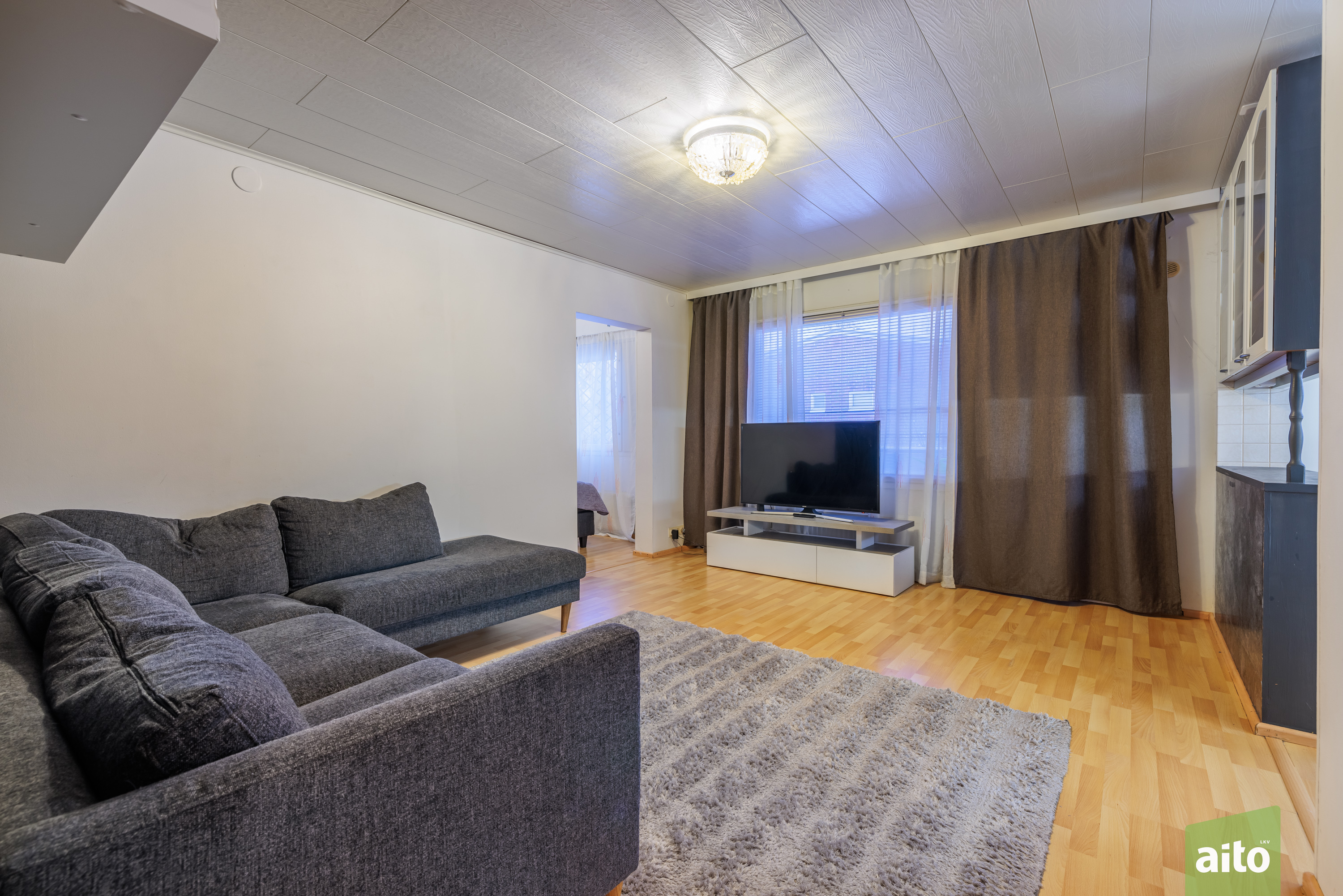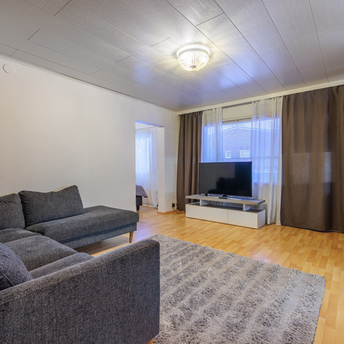 Olohuone on tilava ja helposti kalustettava. Lattiat ovat laminaattia ja seinät tapetoitu sekä osin maalattu.