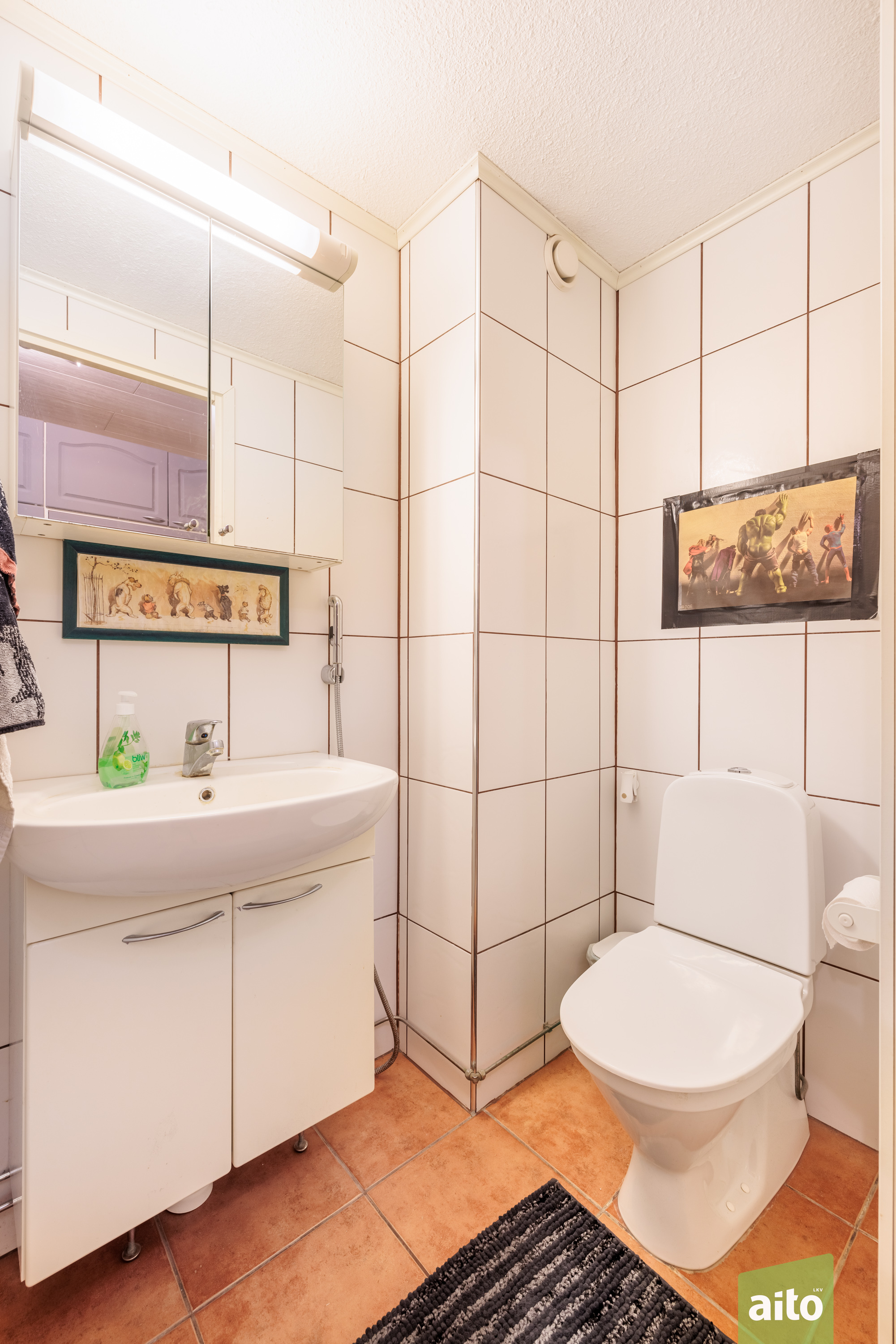 Asunnossa on kaksi WC:tä, joissa on peili- ja allaskaapit sekä laatoitetut lattiat ja seinät.