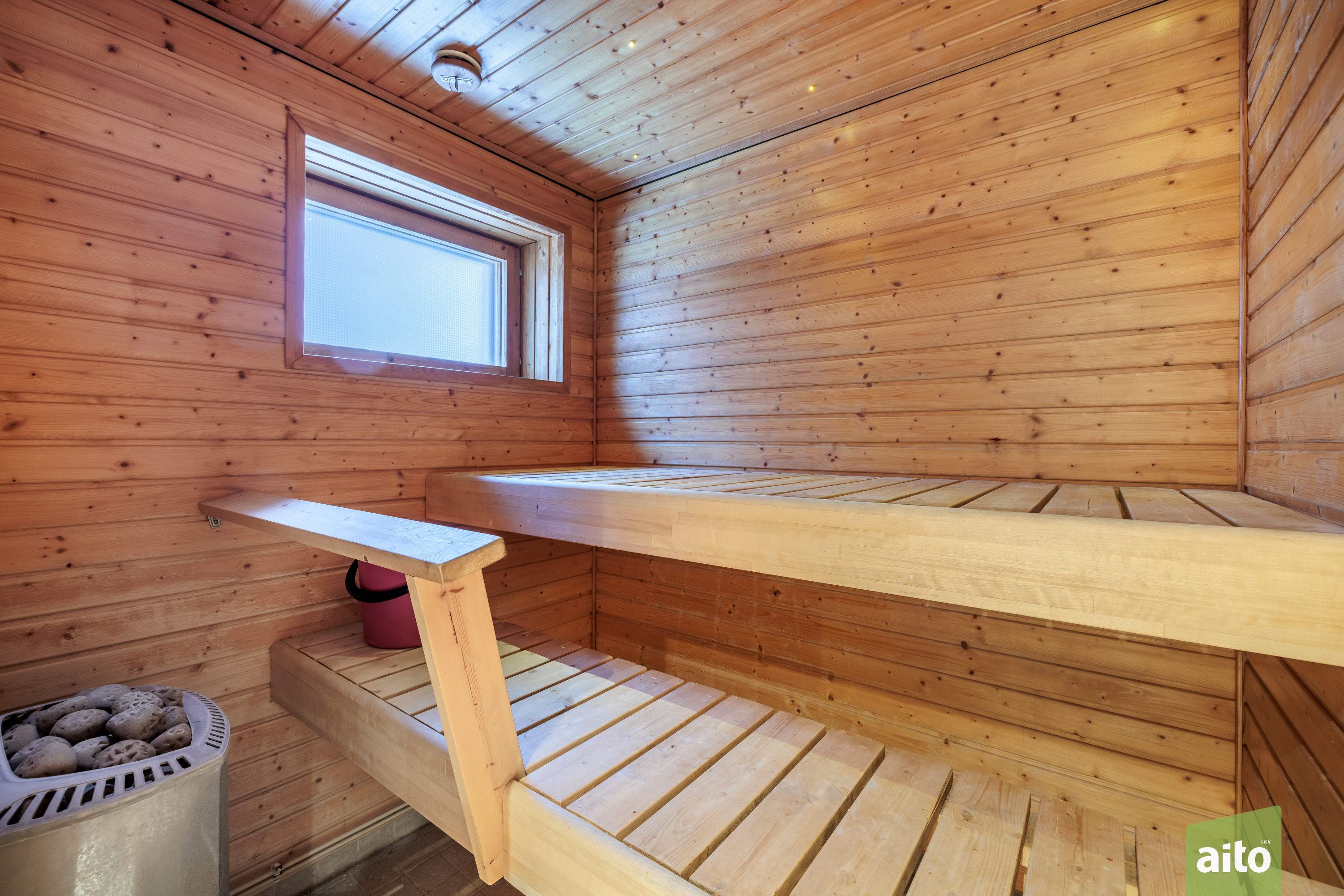 Sähkökäyttöinen kiuas, avattava ikkuna, lattiassa laatta, seinät ja katto paneeli.