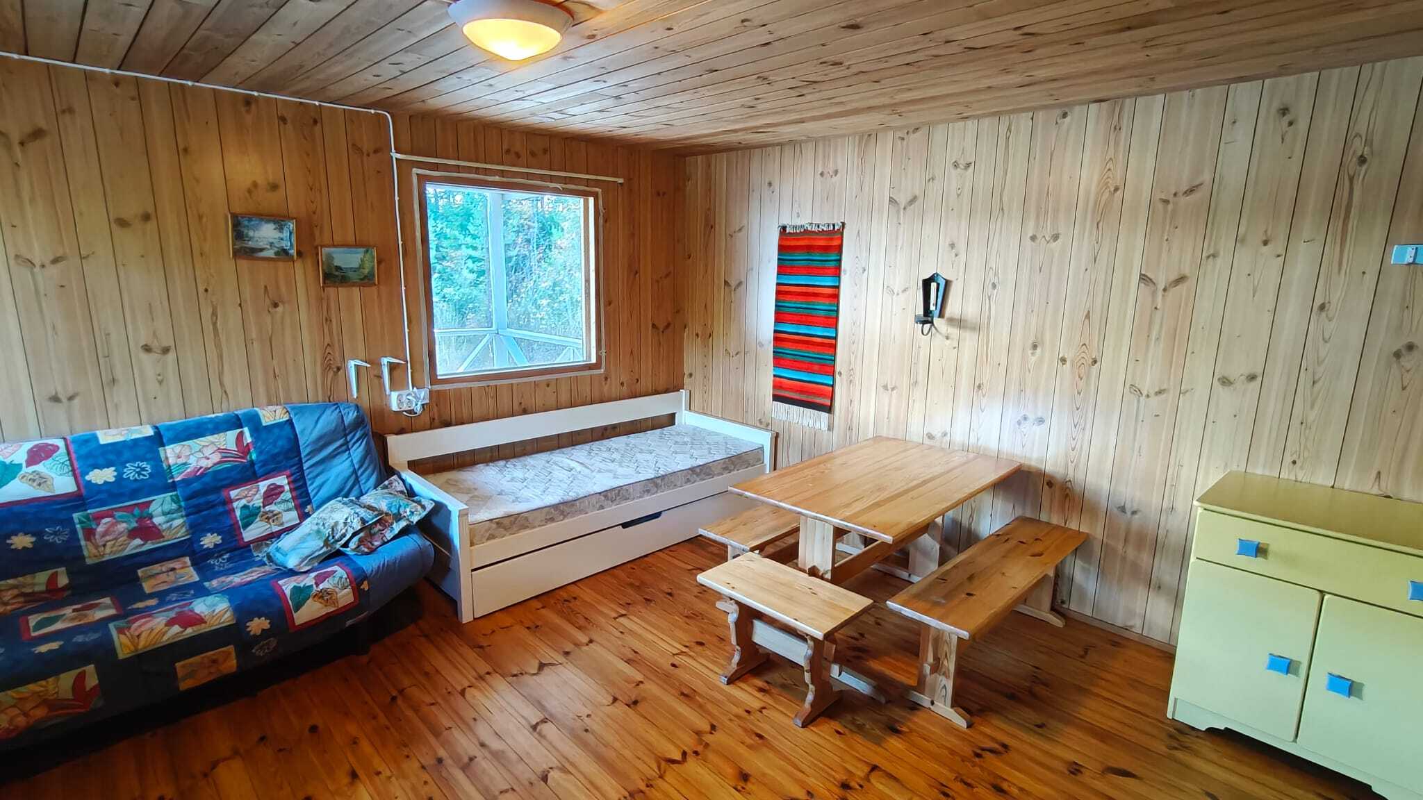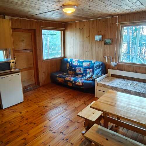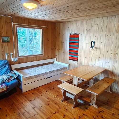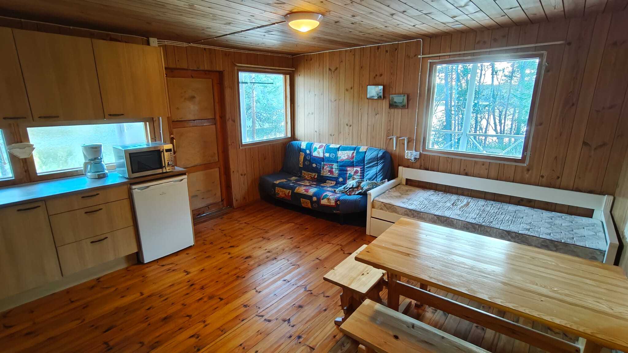 Avara tupa, jossa tilaa majoittumiseen, oleskeluun, ruoanlaittoon ja ruokailuun.