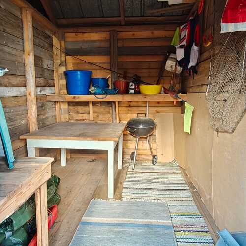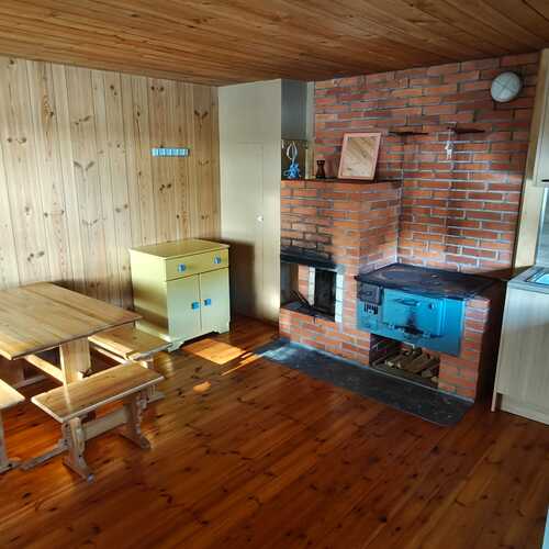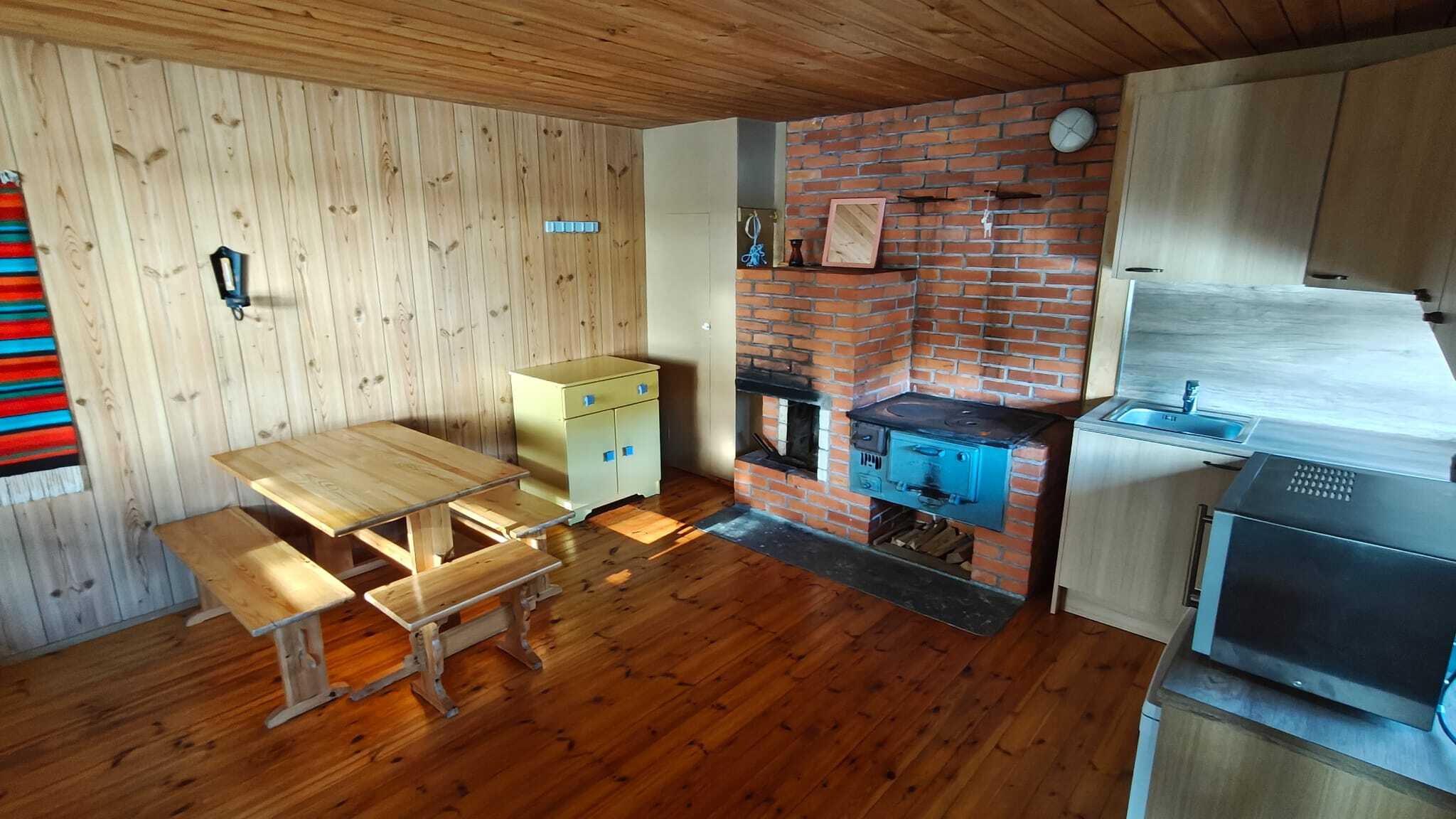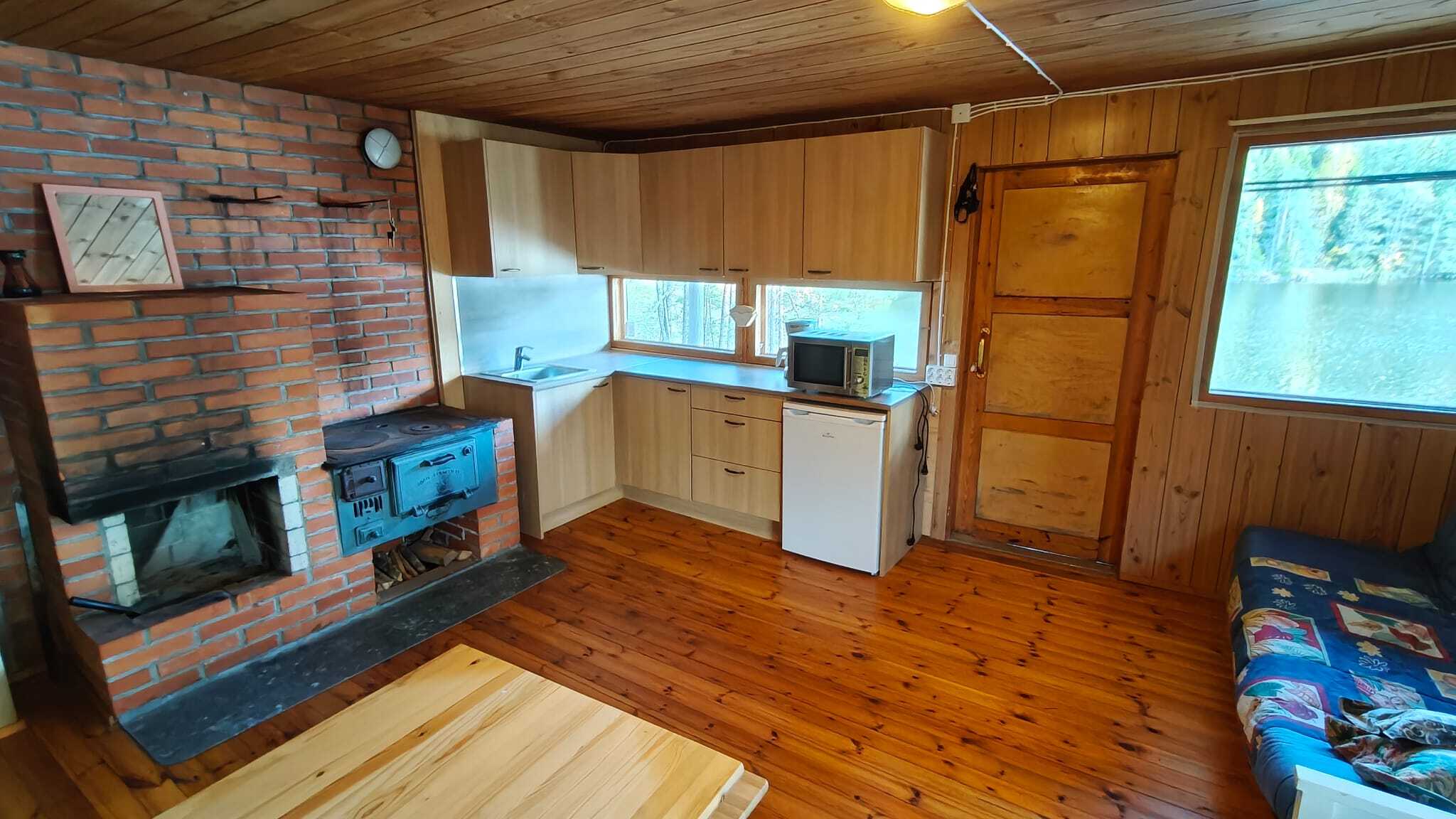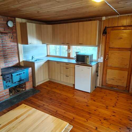 Aurinkosähköllä toimivat jääkaappi ja mikro, puuliesi, keittiökaapistot ja -taso, allas, vesijohto, kesävesi järvestä aurinkosähköllä toimivalla vesiautomaatilla, viemäröinti.