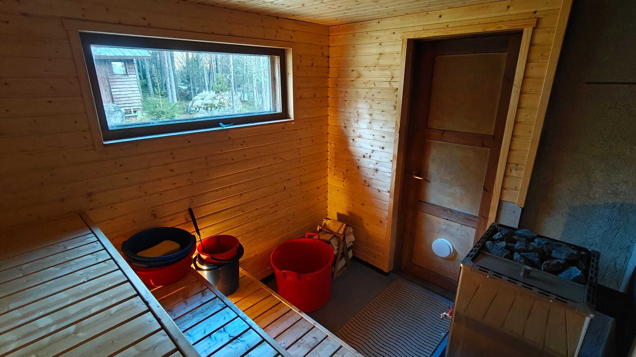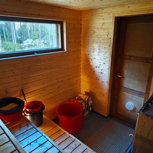 Puulämmitteinen kiuas, kuumavesisäiliö, lauteet yhdellä seinustalla, ikkuna ulos, kantovesi.