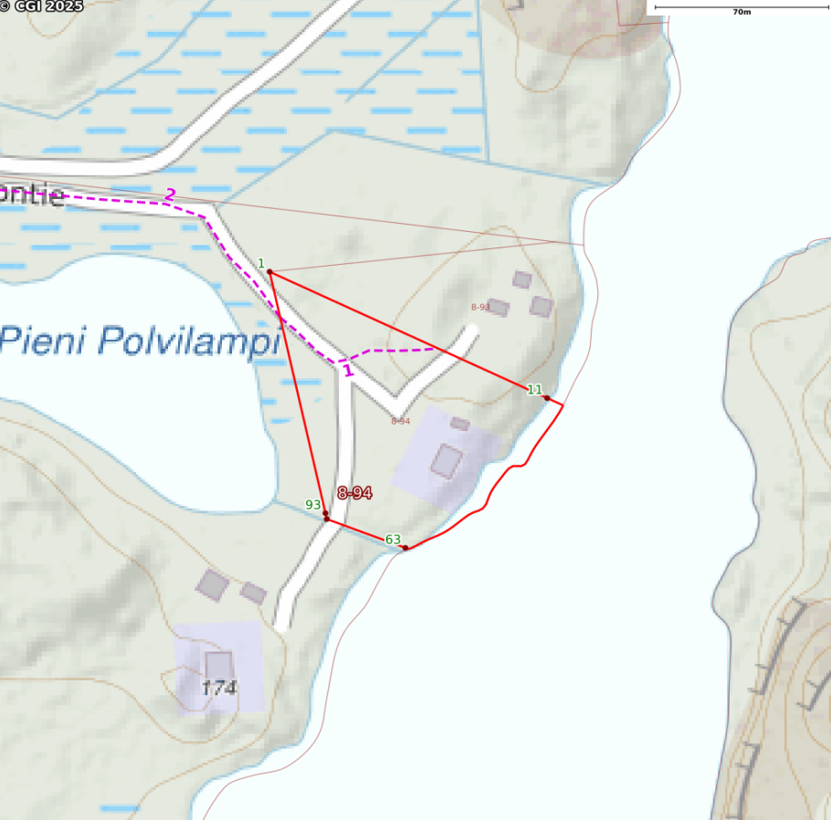 Avara ja melko tasainen rakennuspaikka-alue, jonka edessä puhdas ja sileä rantaan loivasti laskeva kalliorinne. Rakennuspaikka-aluetta ympäröi suojaava sekapuusto.