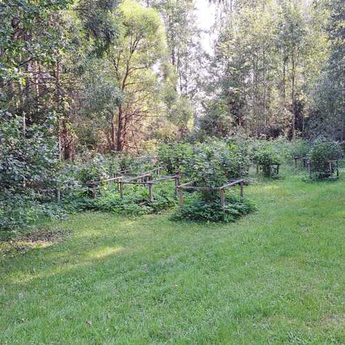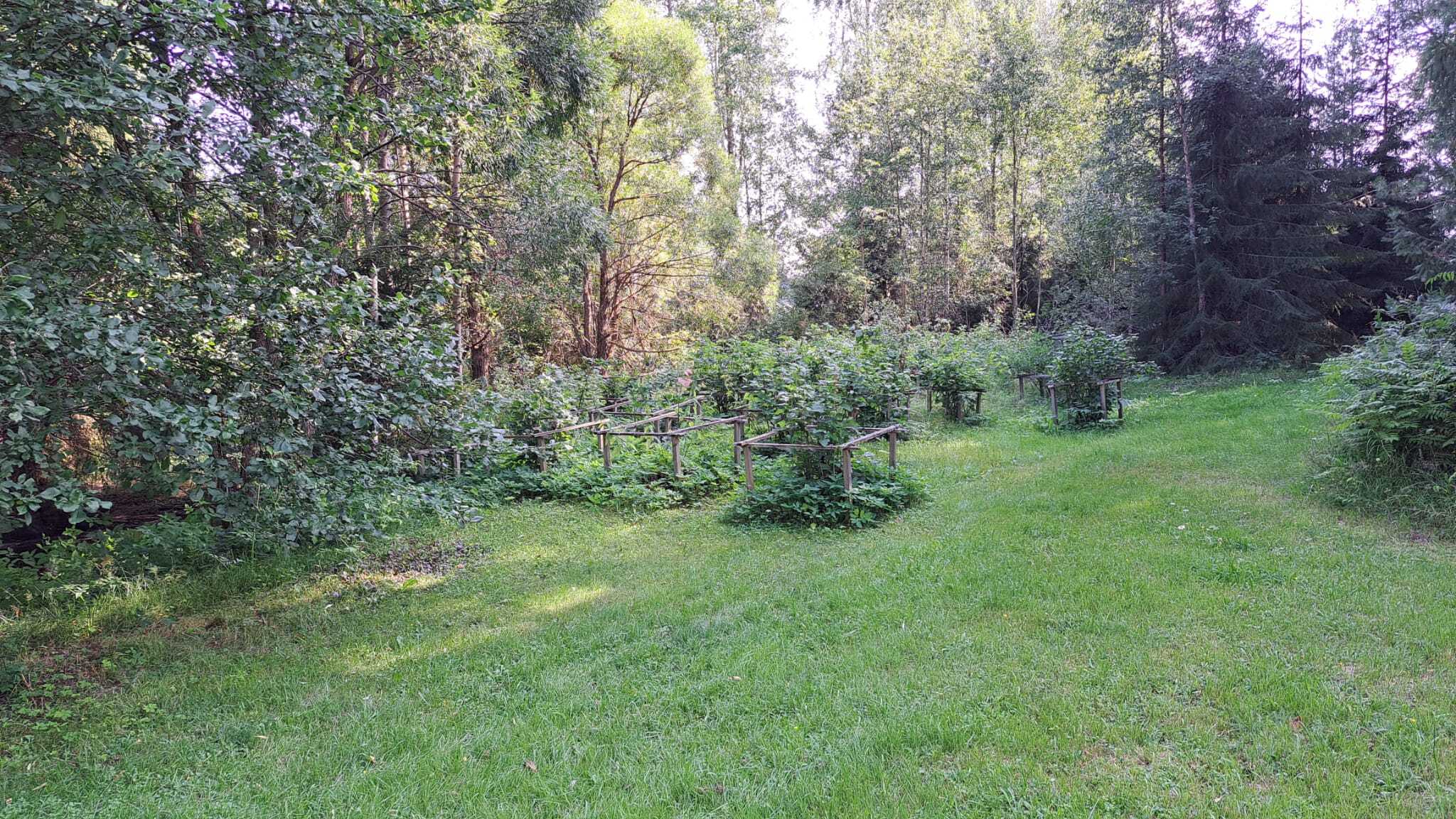 Aurinkoisen kumpareen päällä tasainen, metsän ympäröimä puutarha piha-alue, jossa marjapensaita,