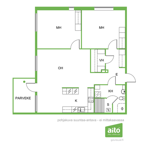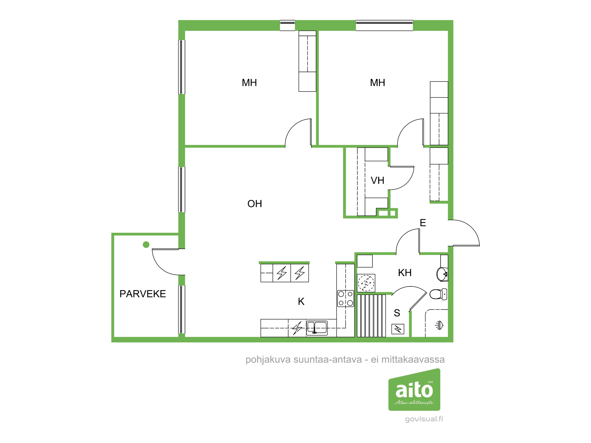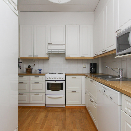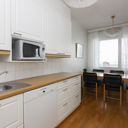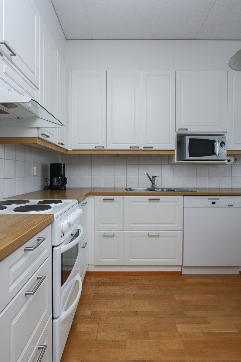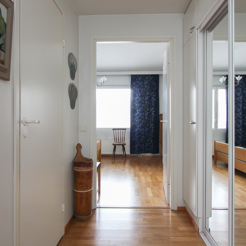 Asunnon keittiö avautuu ruokailutilaan ja edelleen olohuoneeseen. Molemmat makuuhuoneet ovat reilunkokoisia. Arkea helpottaa myös tilava vaatehuone. Oman saunan löylyissä voi rentoutua aina silloin, kun itselle parhaiten sopii. Selkeä ja käytännöllinen pohjaratkaisu tekee kodista toimivan niin pariskunnalle, lapsiperheelle kuin tilaa arvostavalle yksinasujalle.