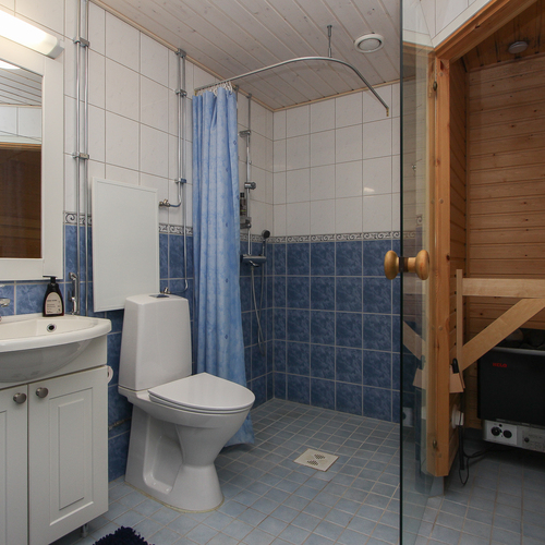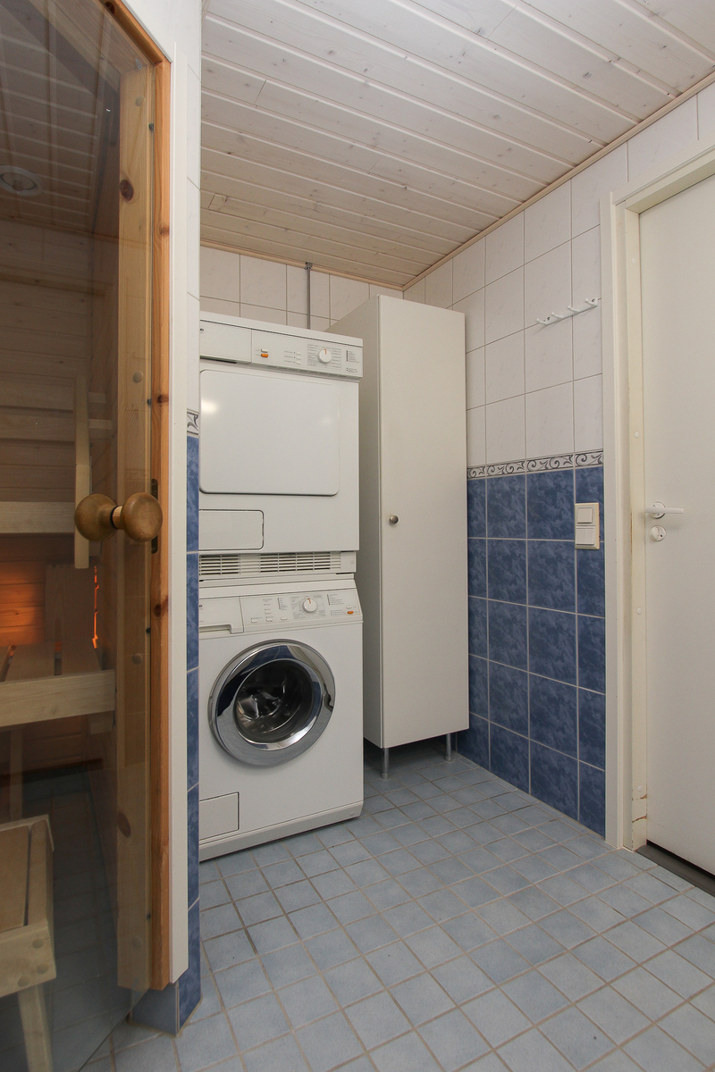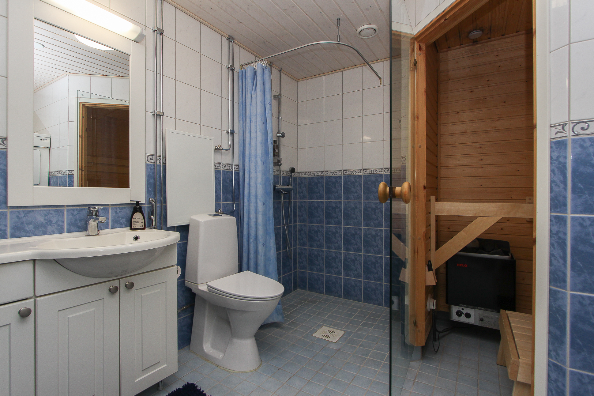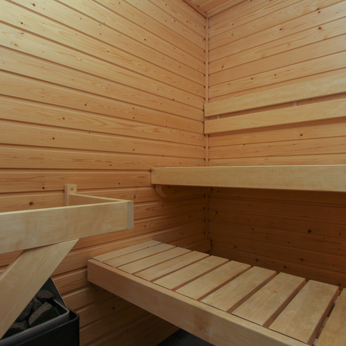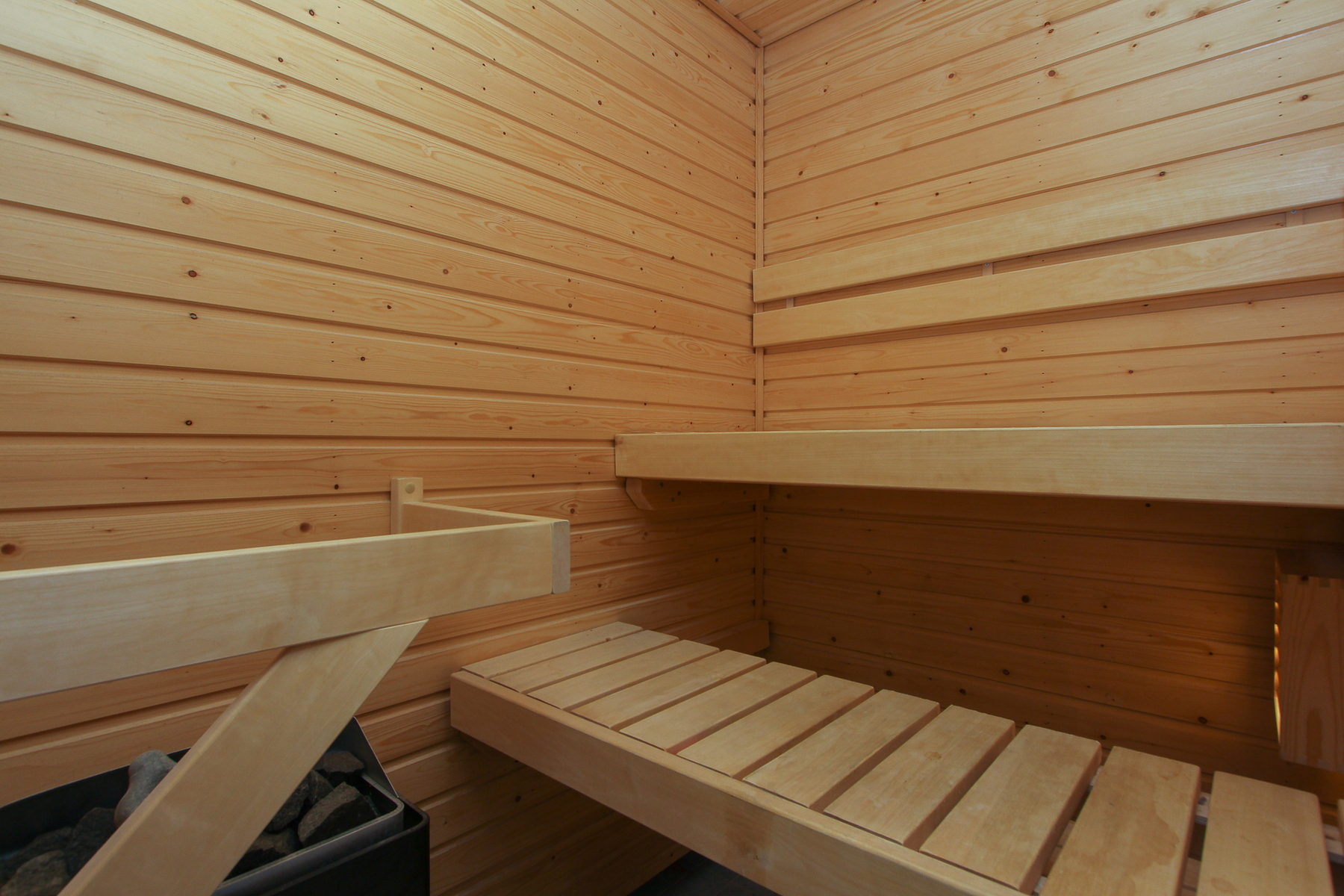 Oma sauna: lauteet, sähkökiuas. Lattiassa laatta, seinät paneloitu, lasiovi.
