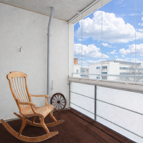 Tilava lasitettu parveke, josta avarat näkymät. Parvekkeella säteilylämmittimet.