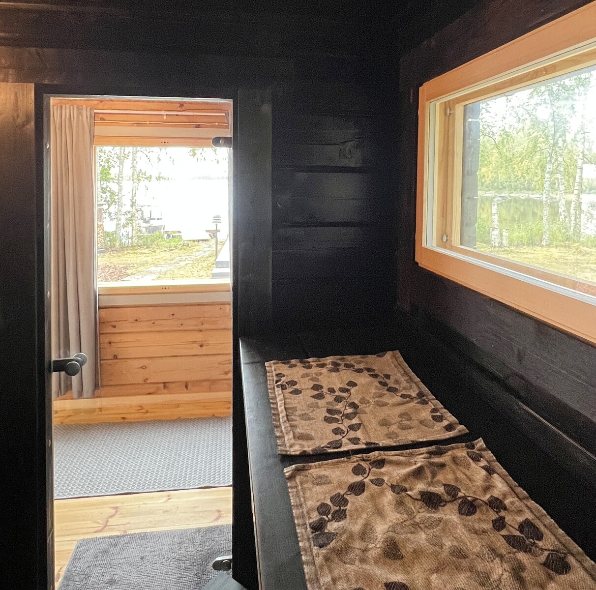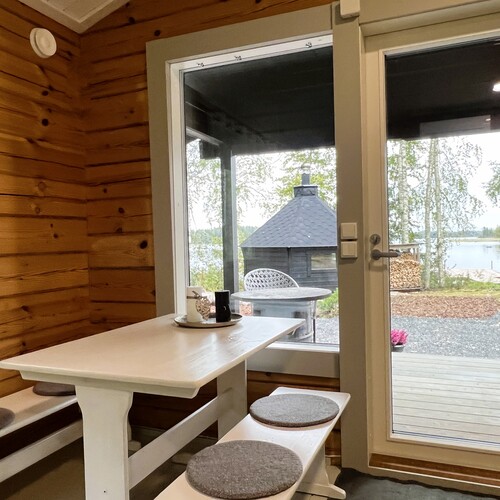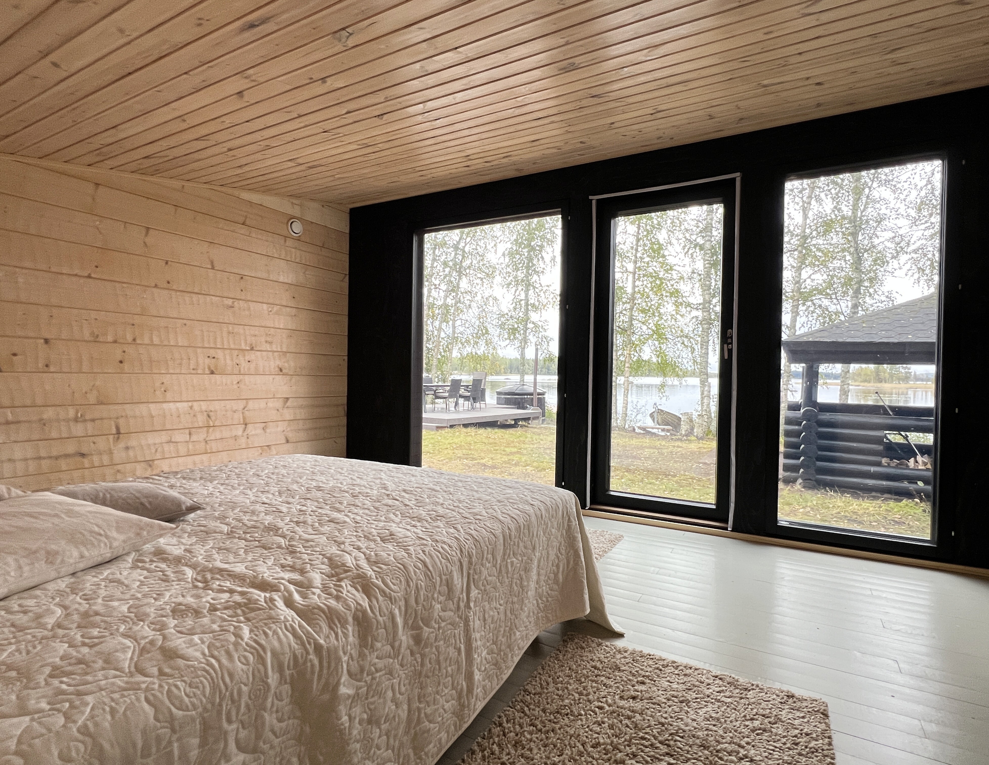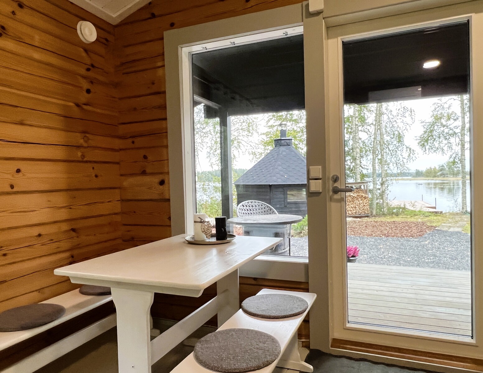 Puukiuas, näkymät järvelle ovesta ja ikkunasta