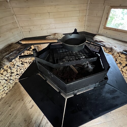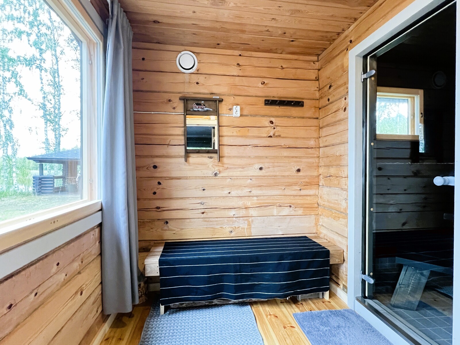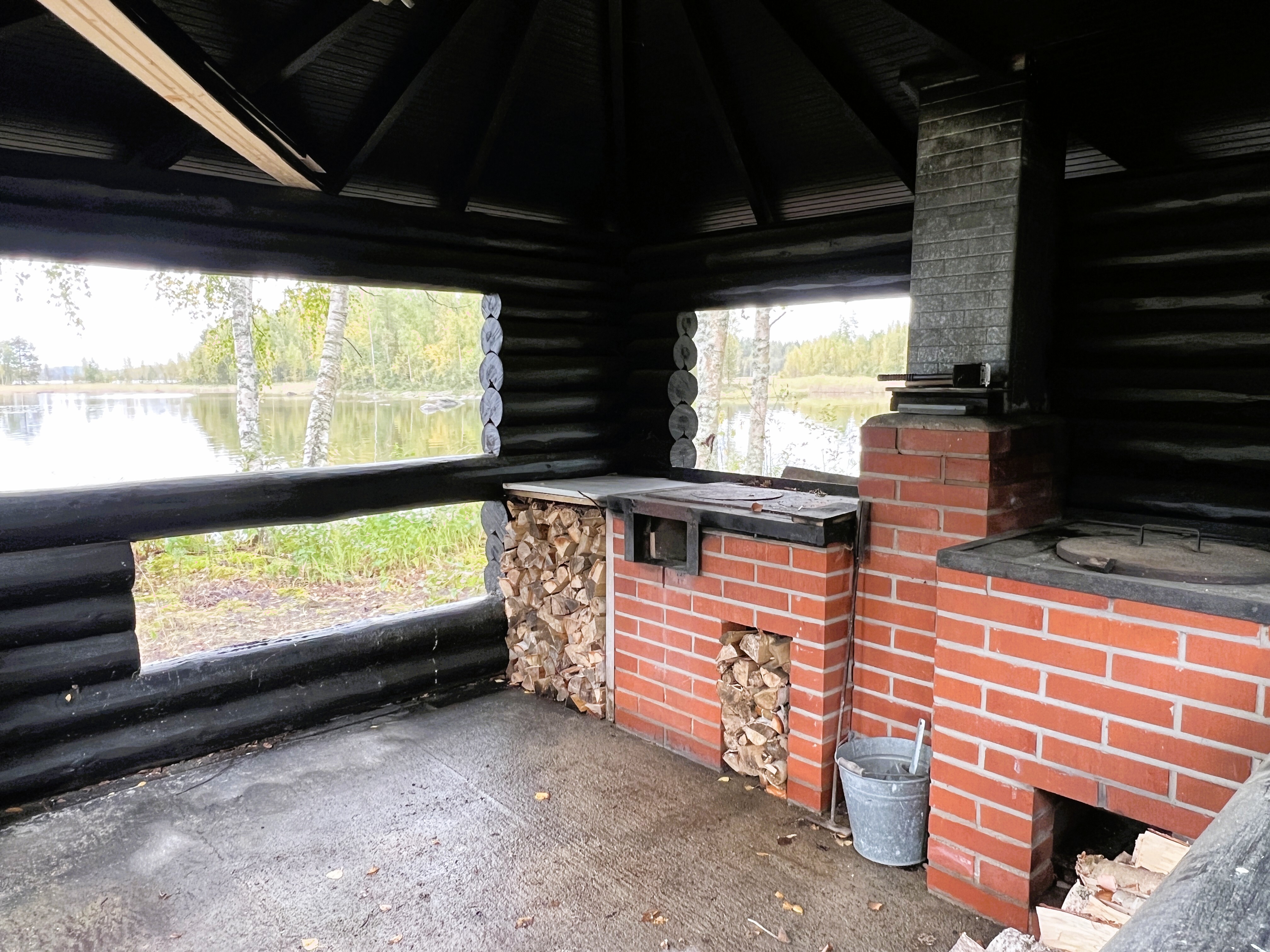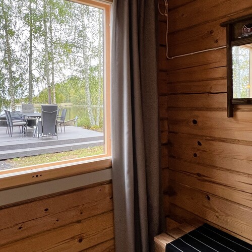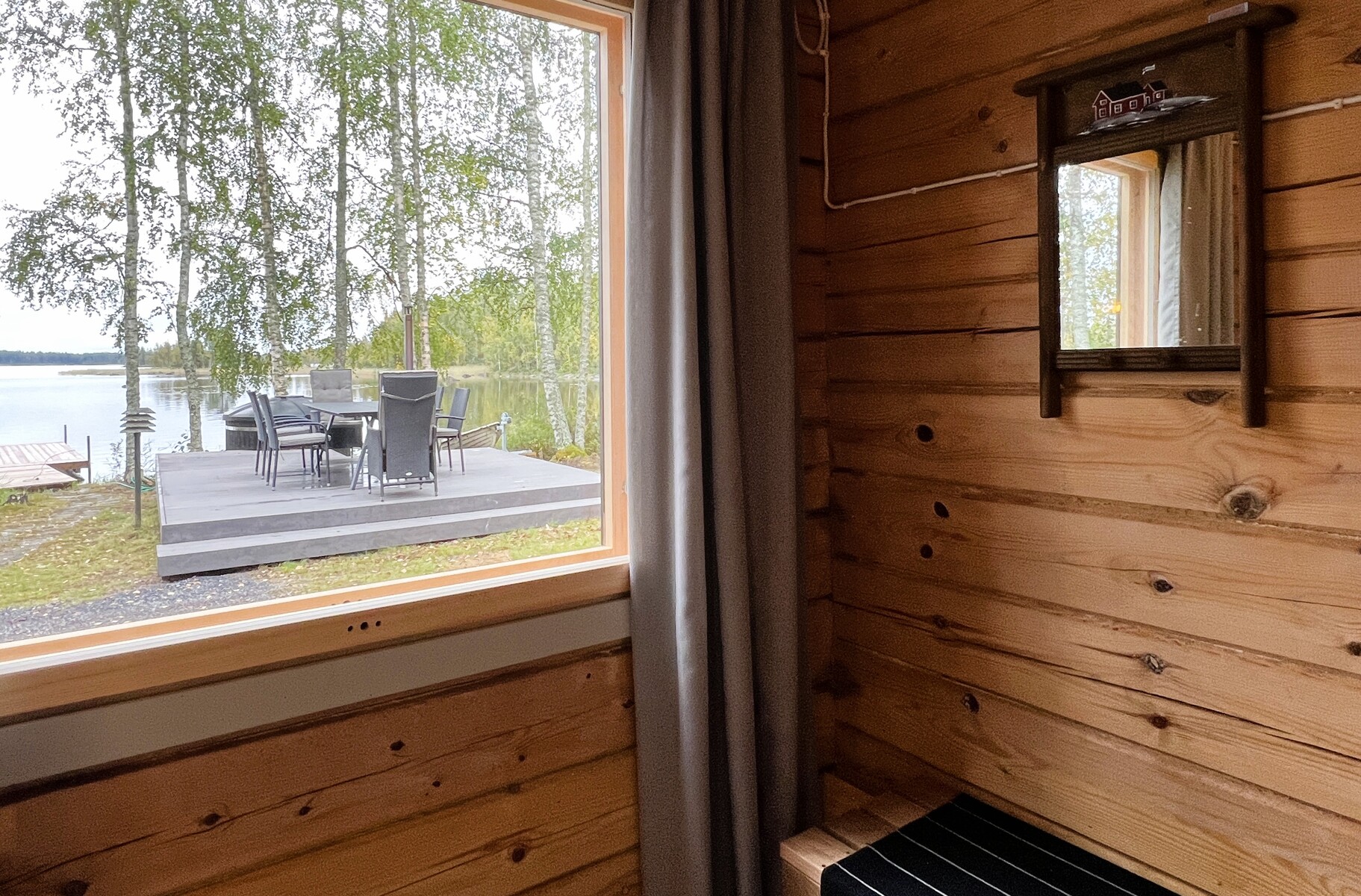 Puukiuas, näkymät järvelle ovesta ja ikkunasta
