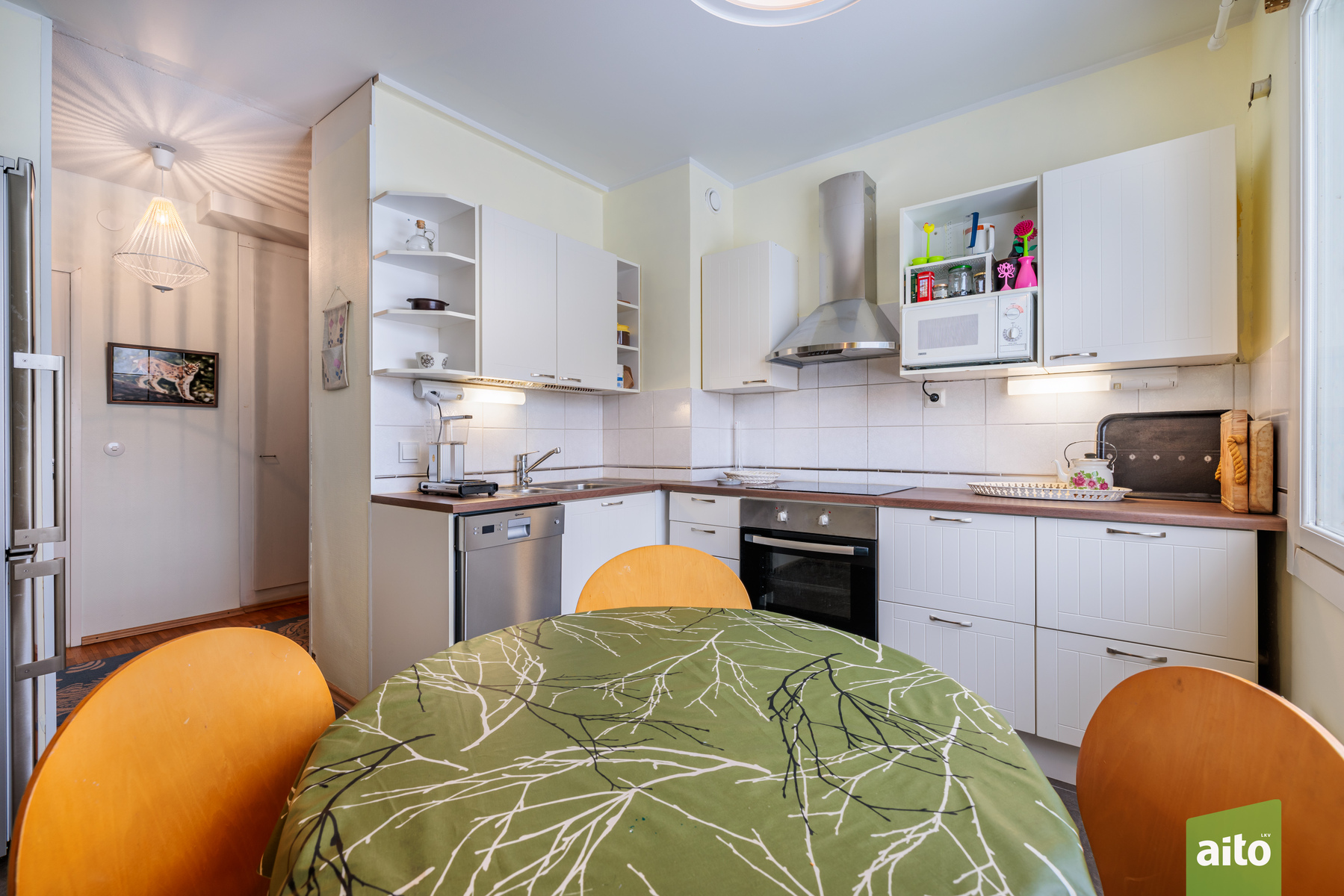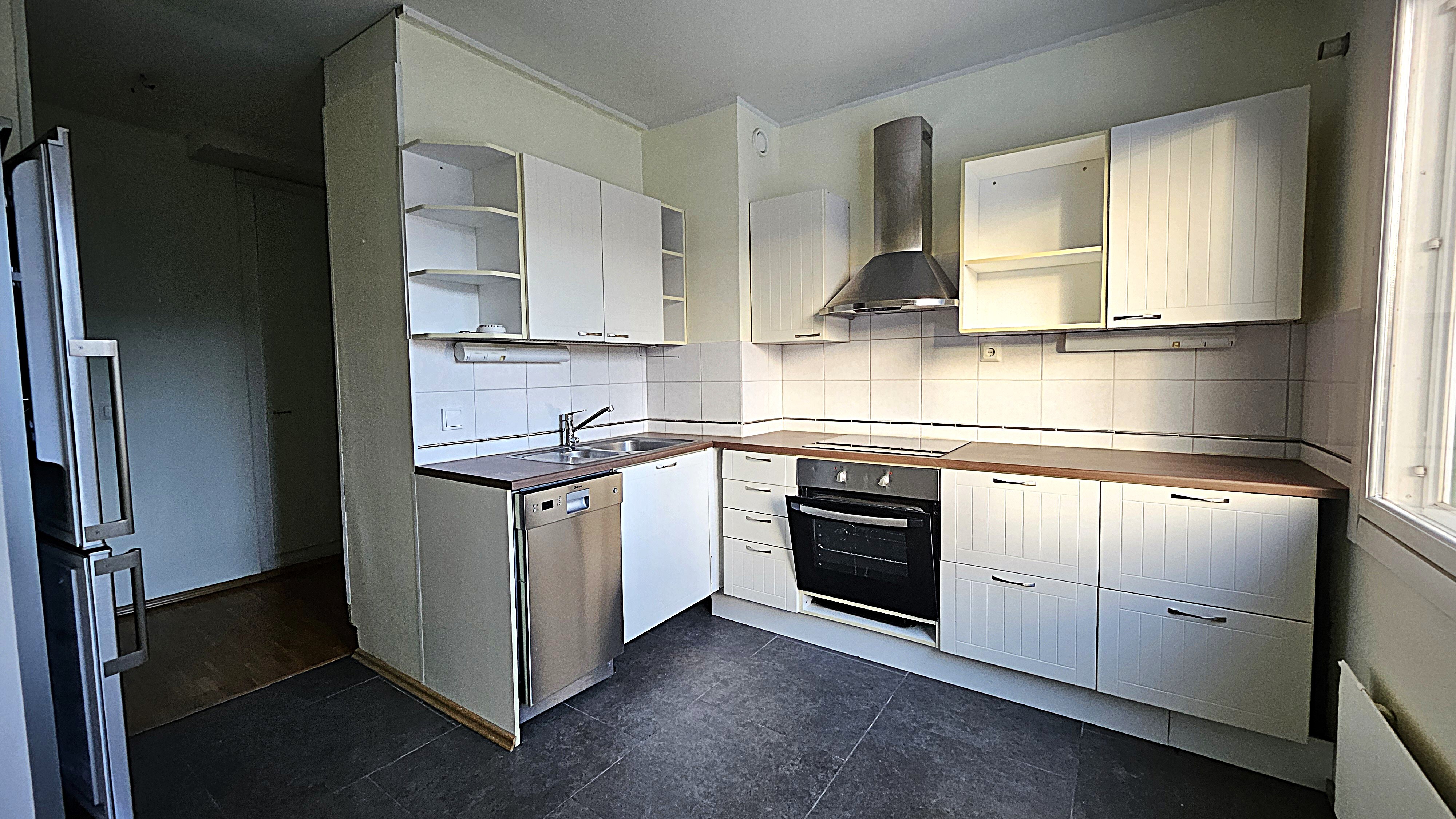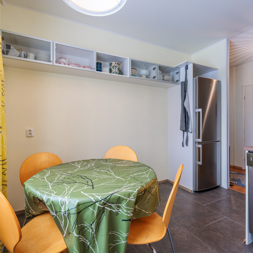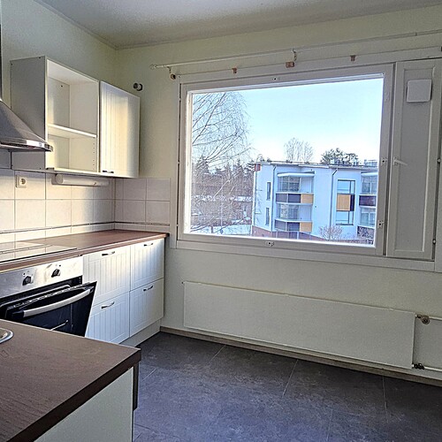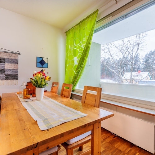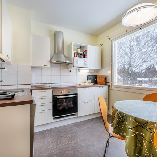 Päivitetty keittiö – käytännöllinen arjen keskus. Keittiö säilytystiloineen ja laitteineen on uusittu 2010. Keittiössä mukavasti tilaa myös ruokapöydälle.