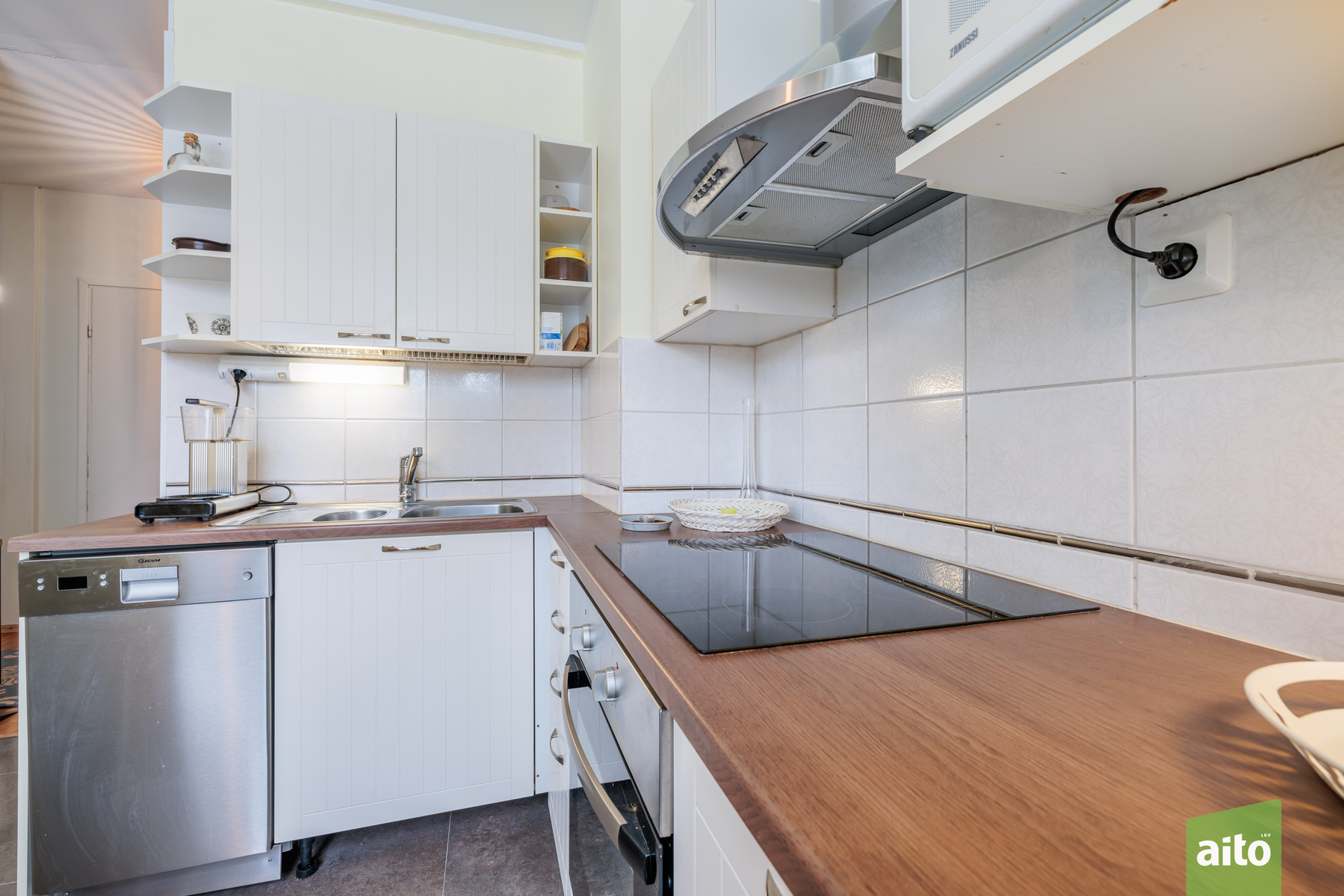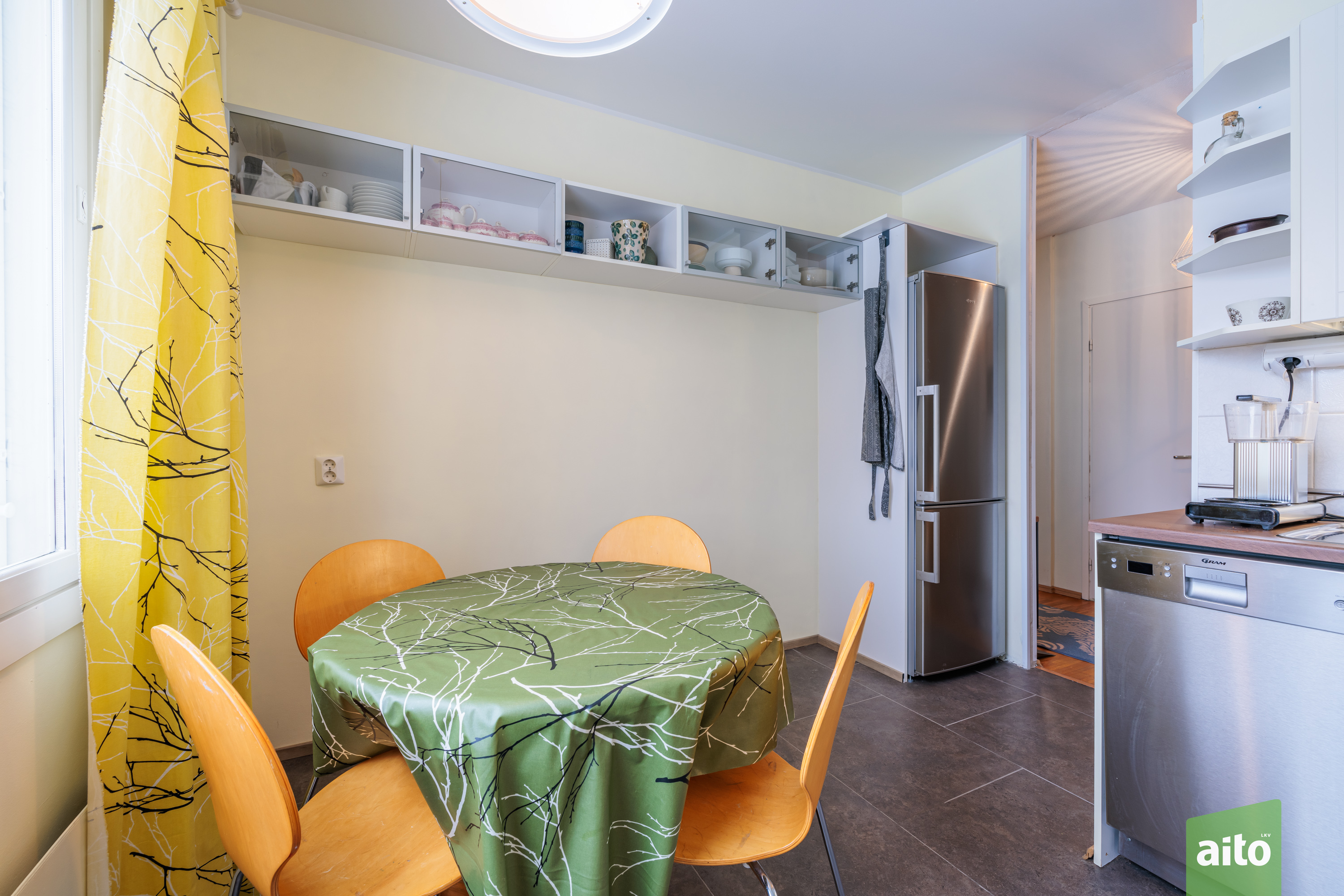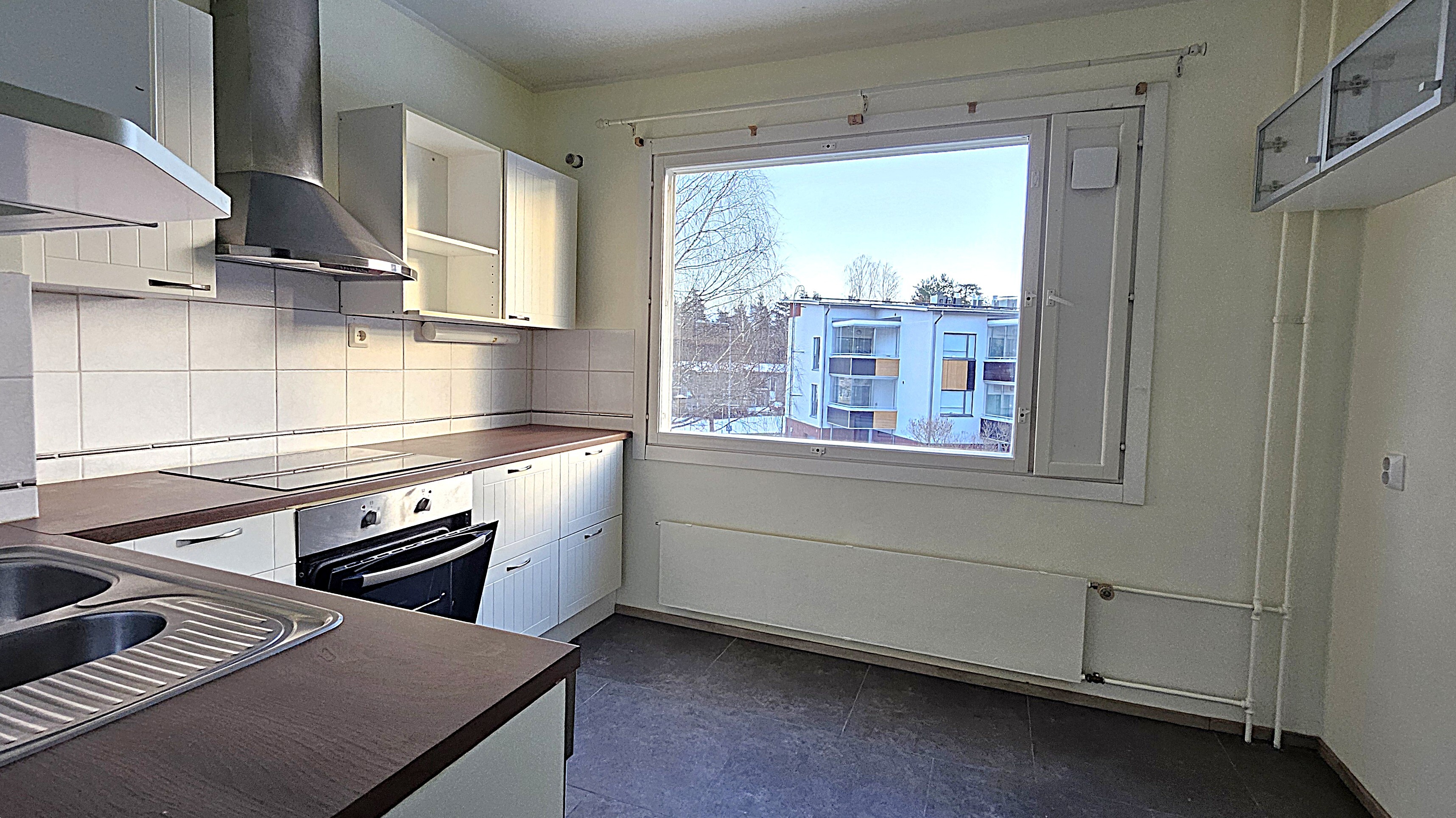 Päivitetty keittiö – käytännöllinen arjen keskus. Keittiö säilytystiloineen ja laitteineen on uusittu 2010. Keittiössä mukavasti tilaa myös ruokapöydälle.