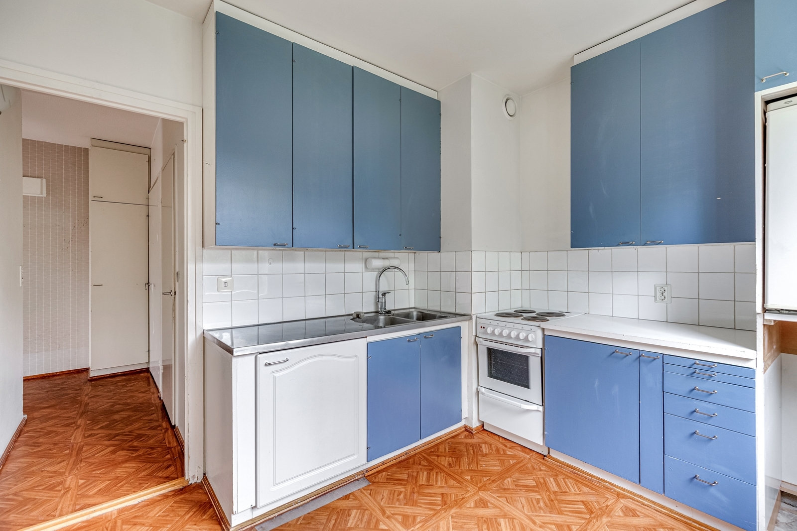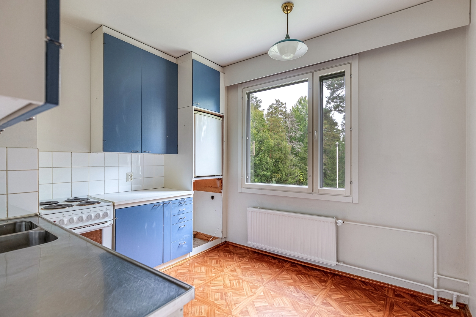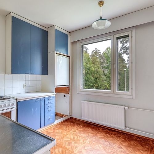 Tämä kolmannen kerroksen kolmio on lähes alkuperäisessä kunnossa ja tarjoaa erinomaisen mahdollisuuden luoda juuri omannäköinen koti. Asunnossa on iso ja valoisa olohuone, jonka suuret ikkunat tuovat tilaan avaruutta ja valoa. Keittiö huokuu retrohenkeä ja kutsuu joko säilyttämään nostalgisen tunnelman tai uudistamaan sen täysin oman maun mukaan. Tilava vaatehuone tuo arkeen käytännöllistä säilytystilaa, ja kylpyhuone on uusittu jossain vaiheessa, joten se on muita tiloja modernimmassa kunnossa. Tämä asunto sopii erityisesti remonttitaitoiselle ostajalle, joka arvostaa mahdollisuutta toteuttaa omia ideoitaan ja nostaa kohteen arvoa.