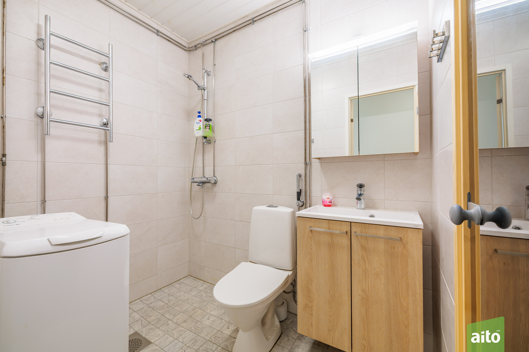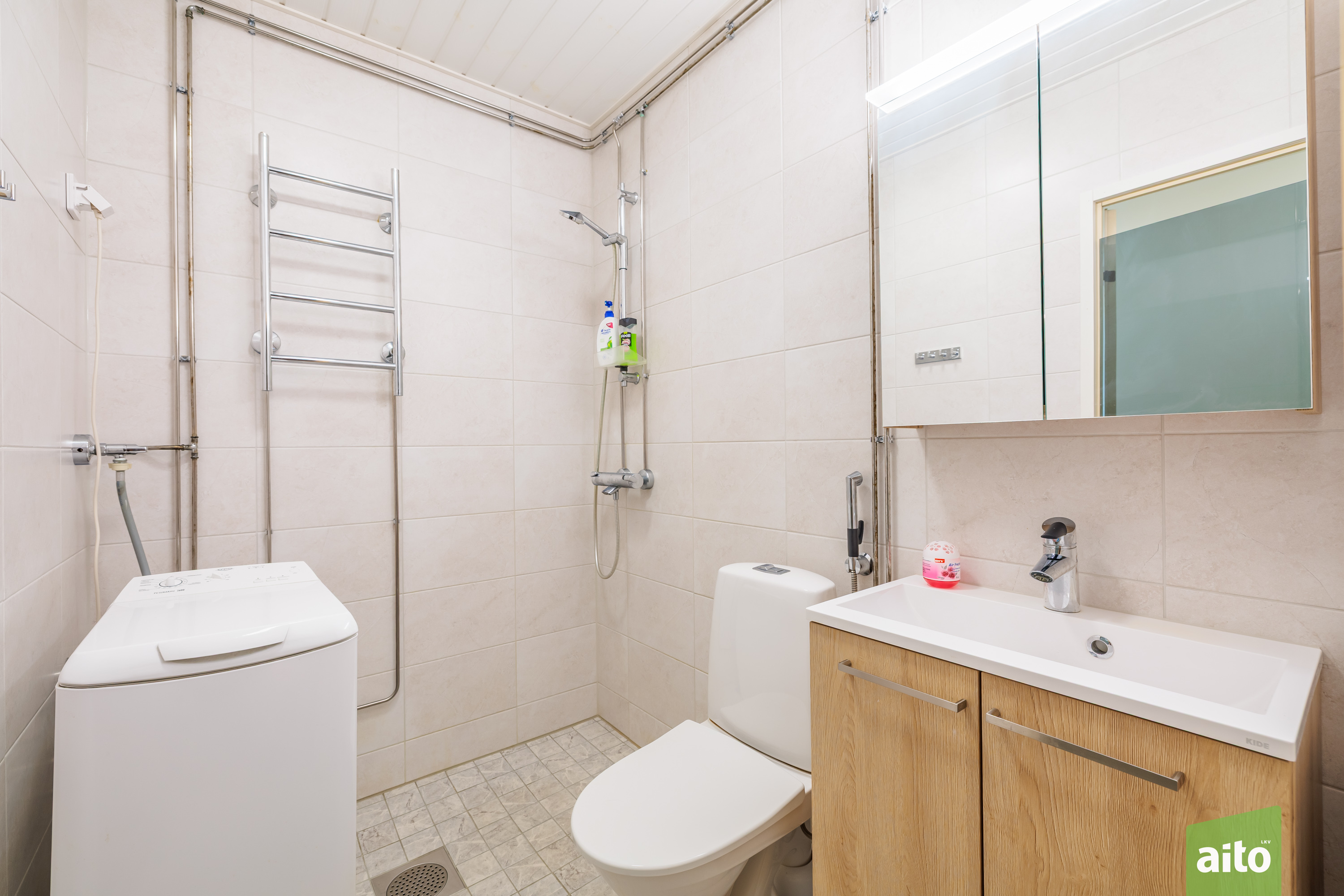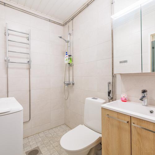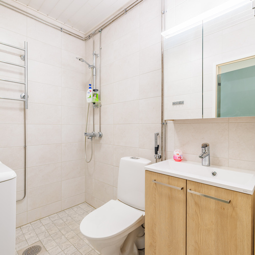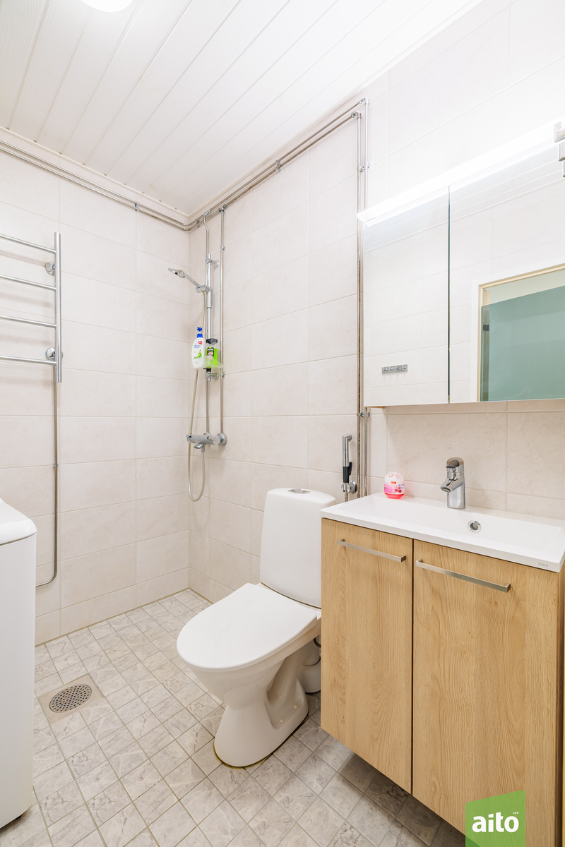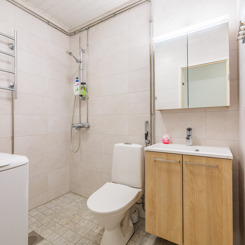 Kylpyhuone koki täydellisen remontin 2023: Vedeneristykset, pinnoitteet ja kalusteet ovat kaikki tuoreita, ja työt on tehty sertifioidusti.