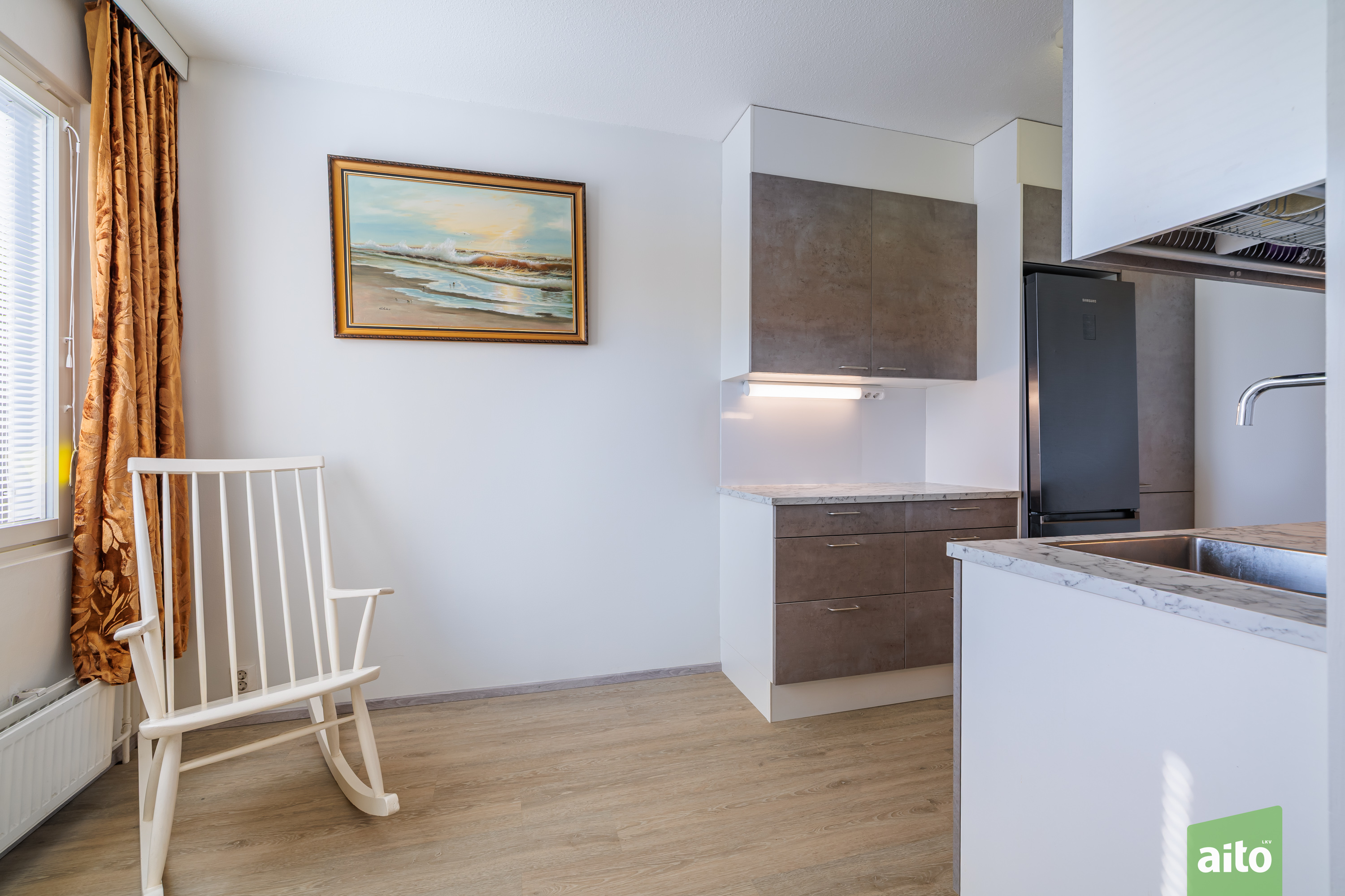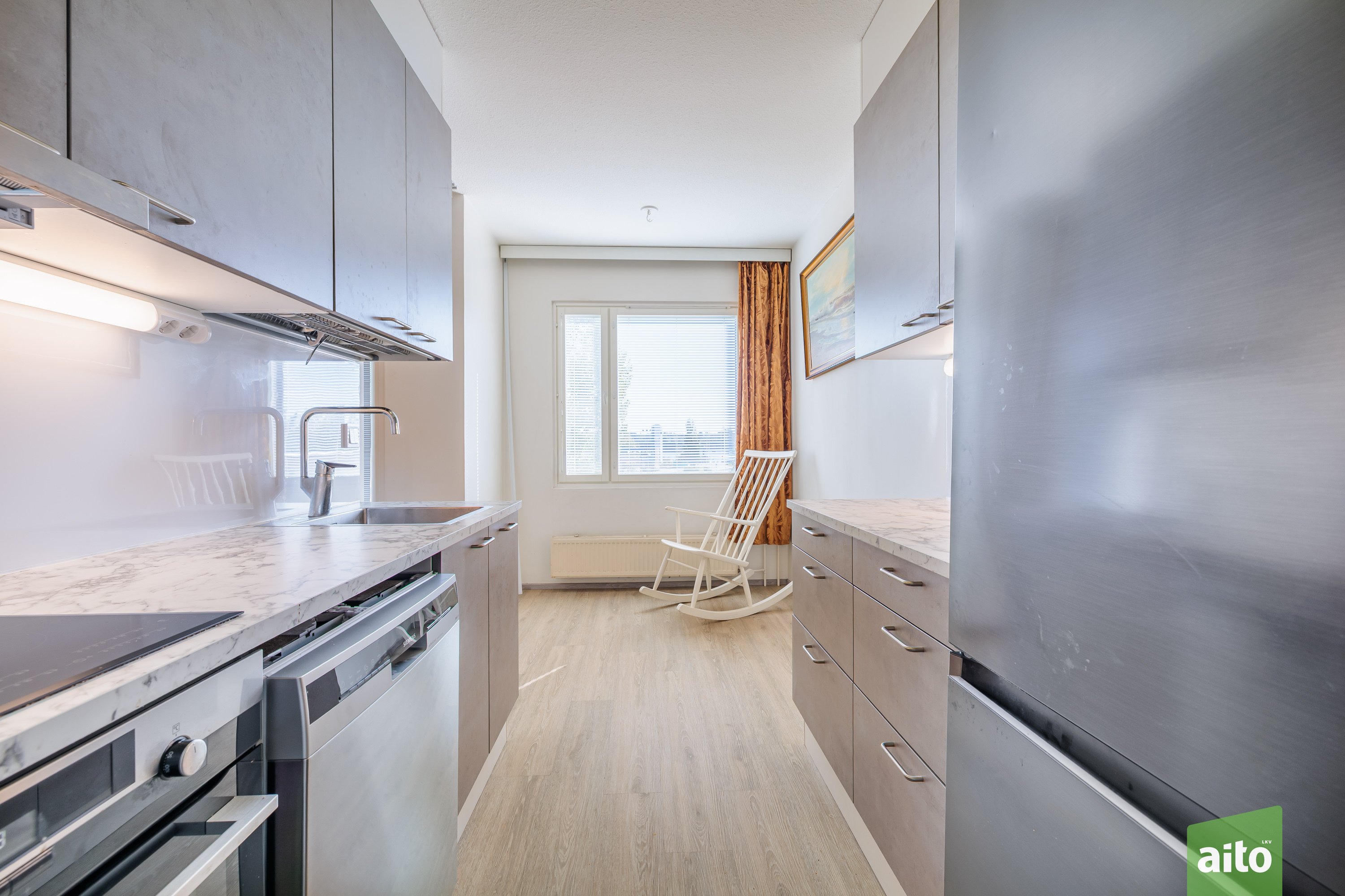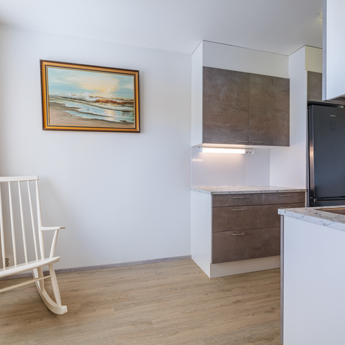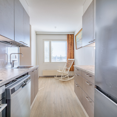 Koti on valmis muuttoa varten – keittiö on uusittu kaapeilla, työtasoilla ja koneilla, keittiössä on hyvin tilaa myös ruokapöydälle.