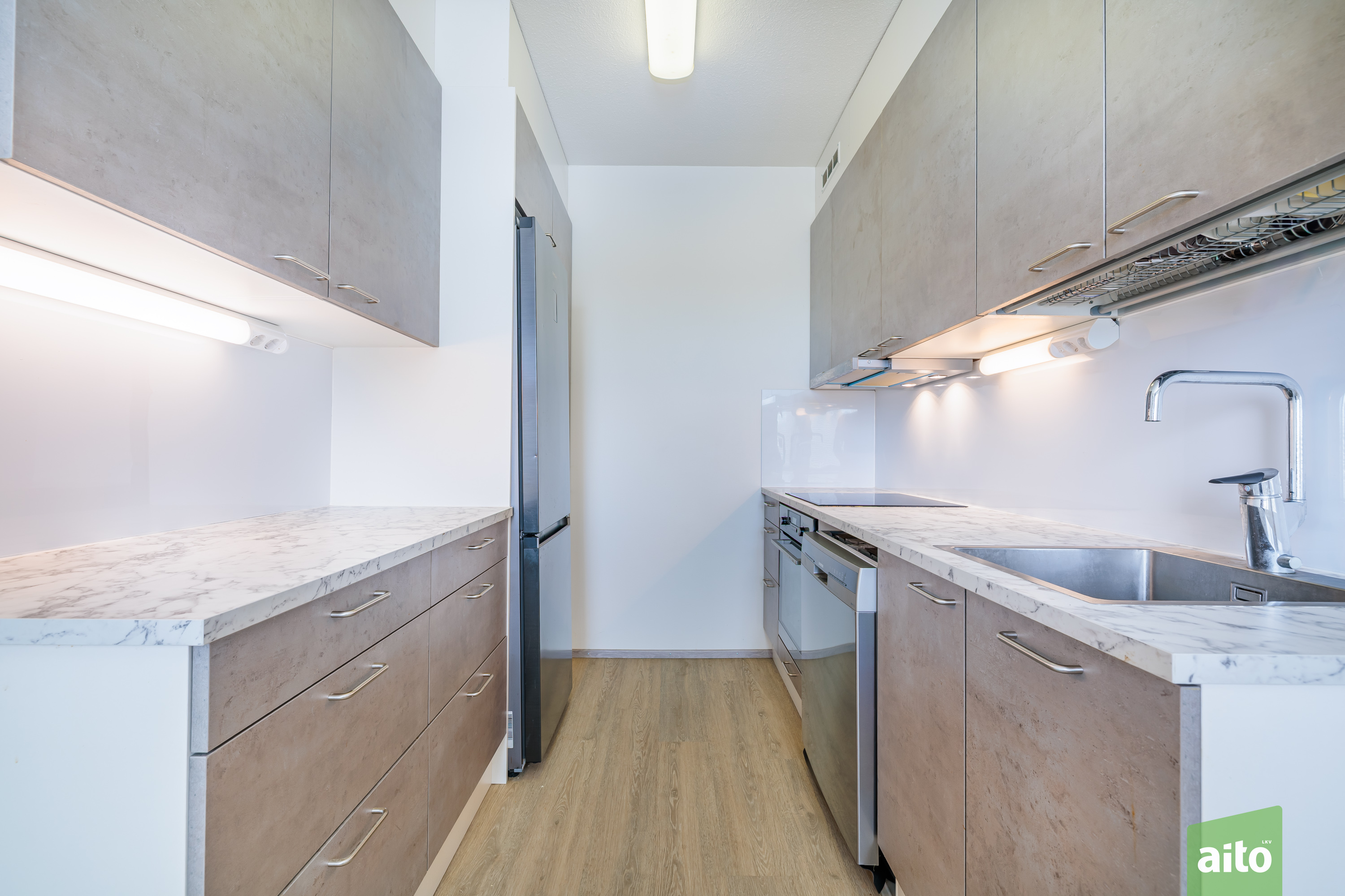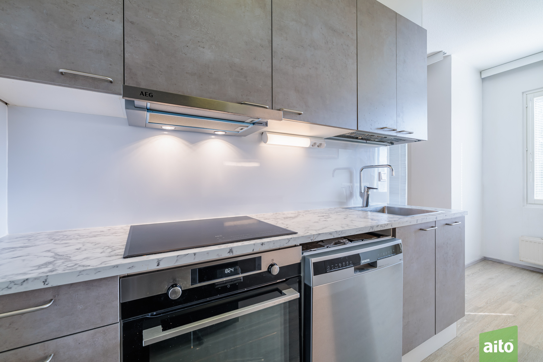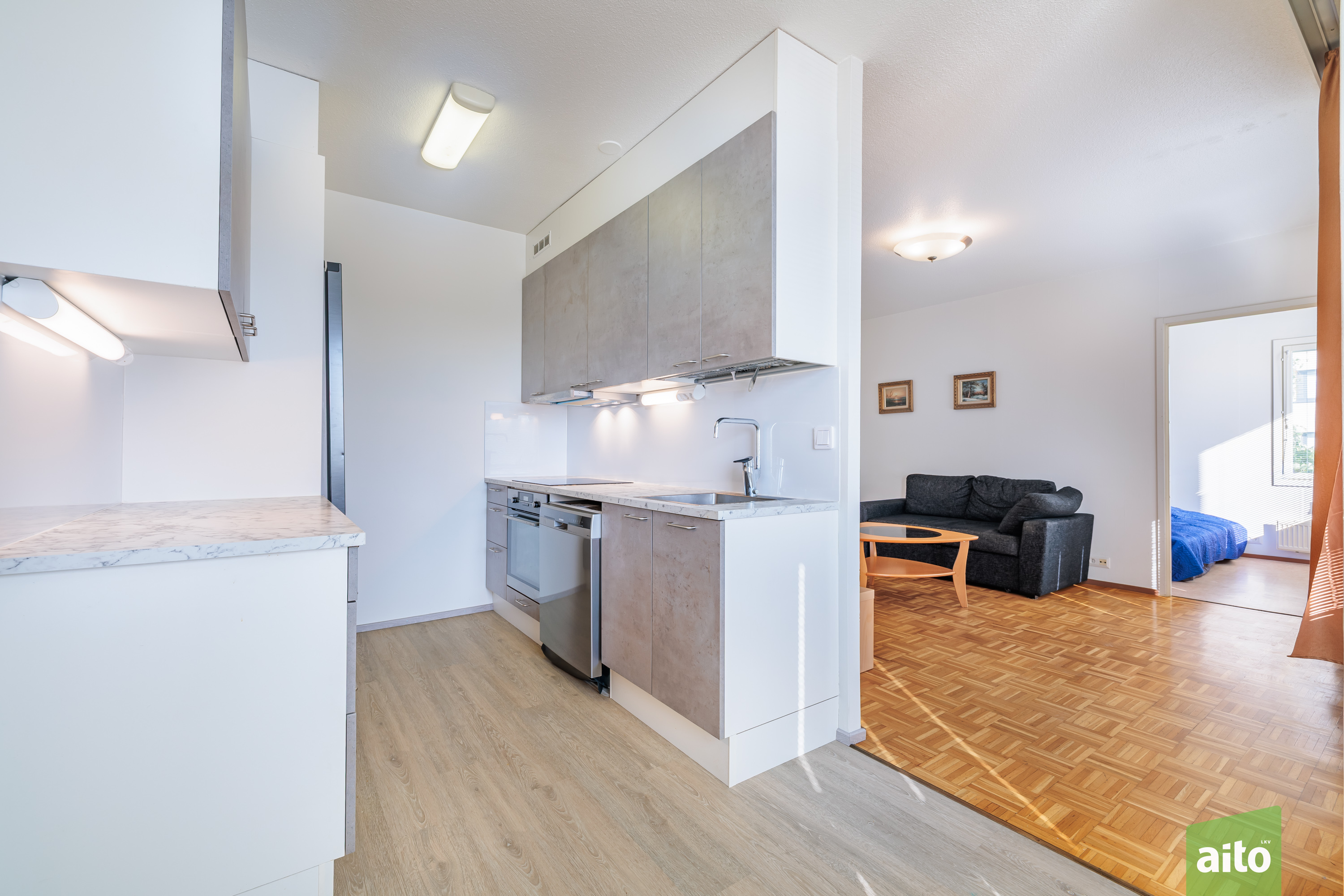 Koti on valmis muuttoa varten – keittiö on uusittu kaapeilla, työtasoilla ja koneilla, keittiössä on hyvin tilaa myös ruokapöydälle.