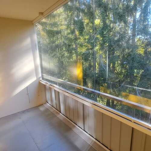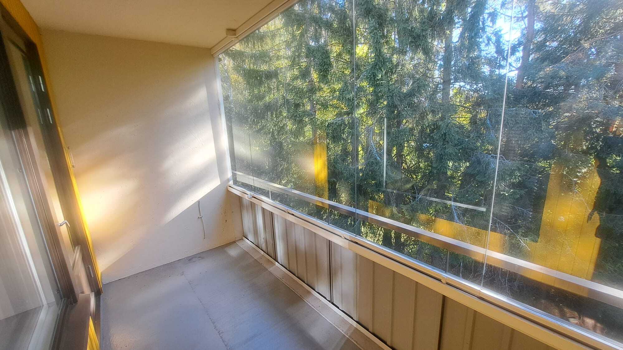 Olohuoneesta ja lasitetulta parvekkeelta puiden suojaama näkymä etelän suuntaan piha-alueelle.
