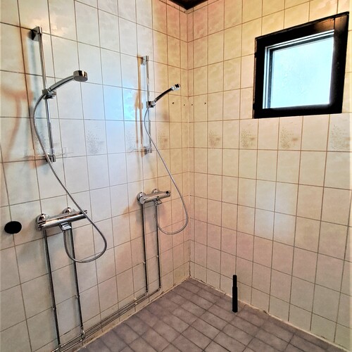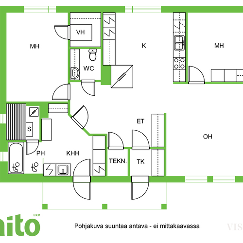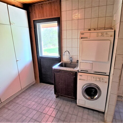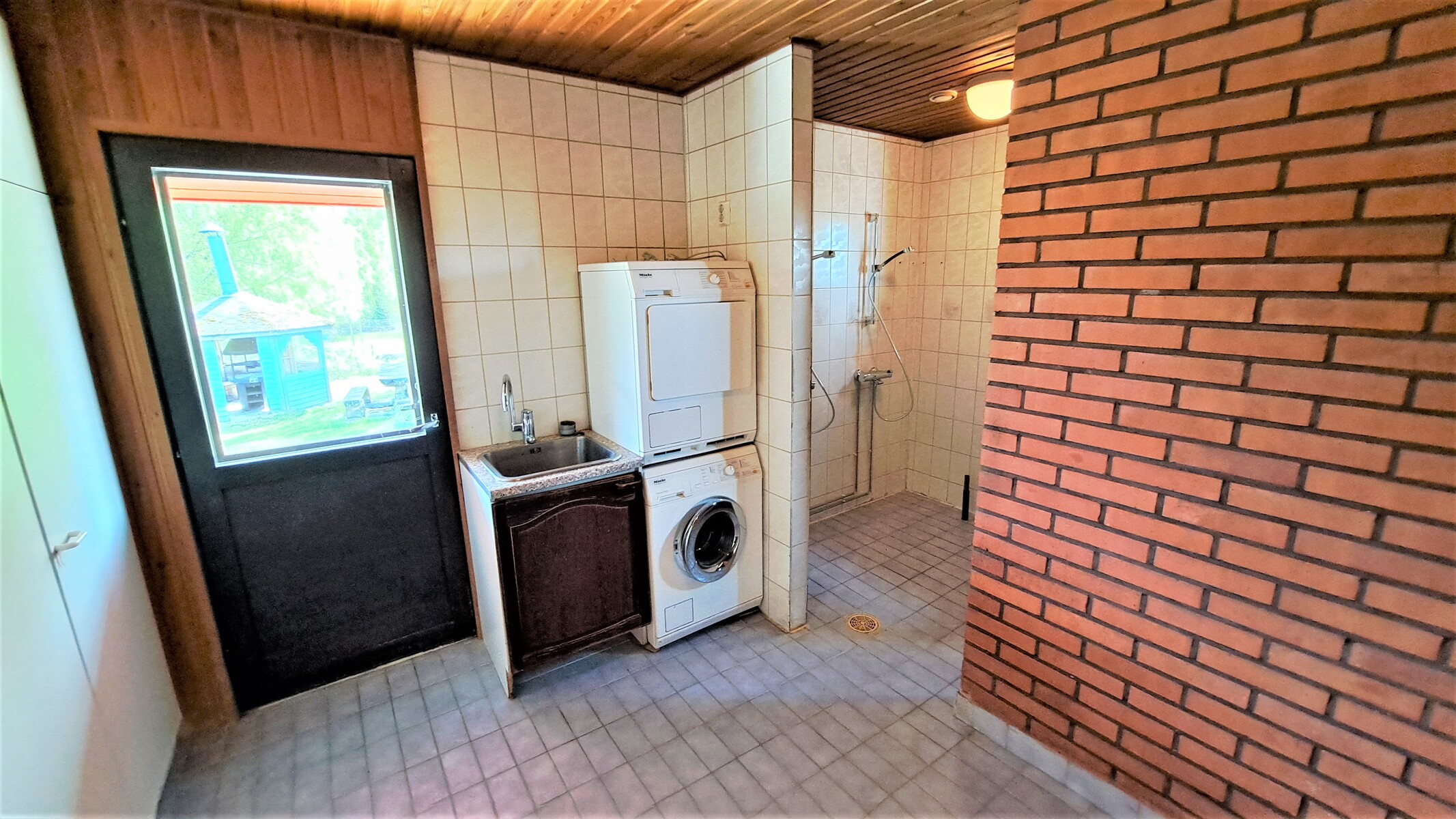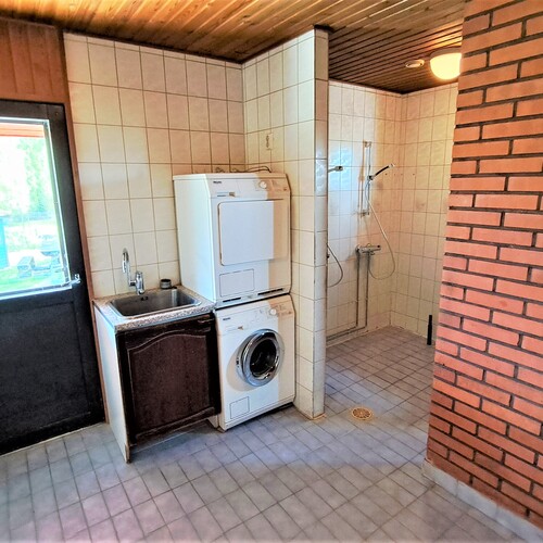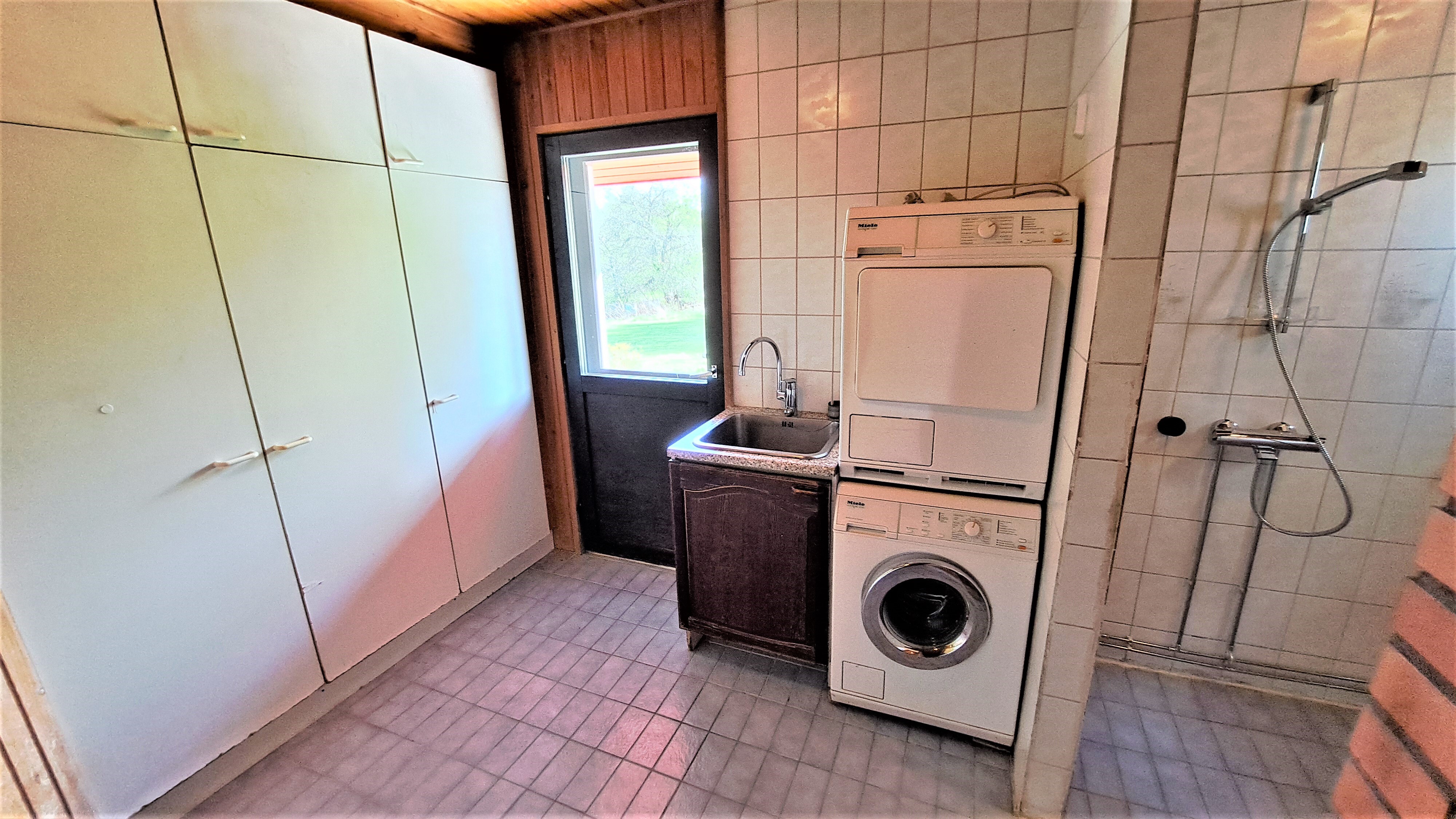 Allaskaappi, kiinteä valaistus, pesukone, kuivausrumpu, lämminvesivaraaja, lattialämmitys, ovi ulos.