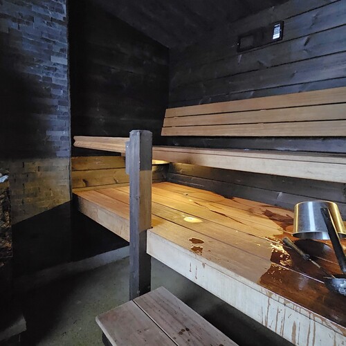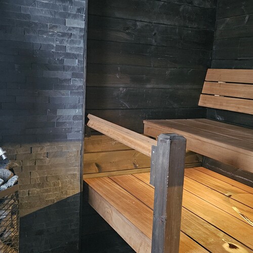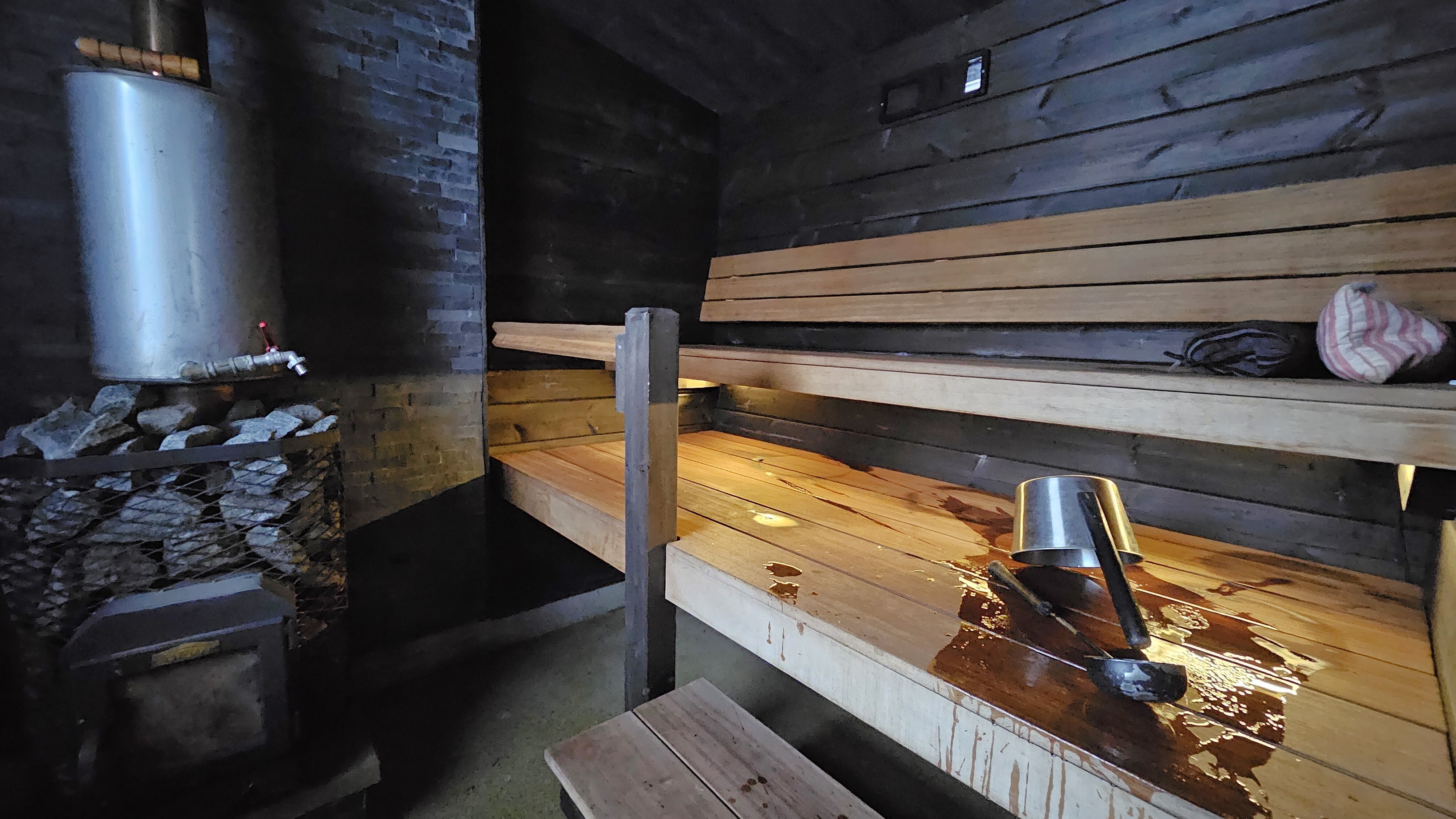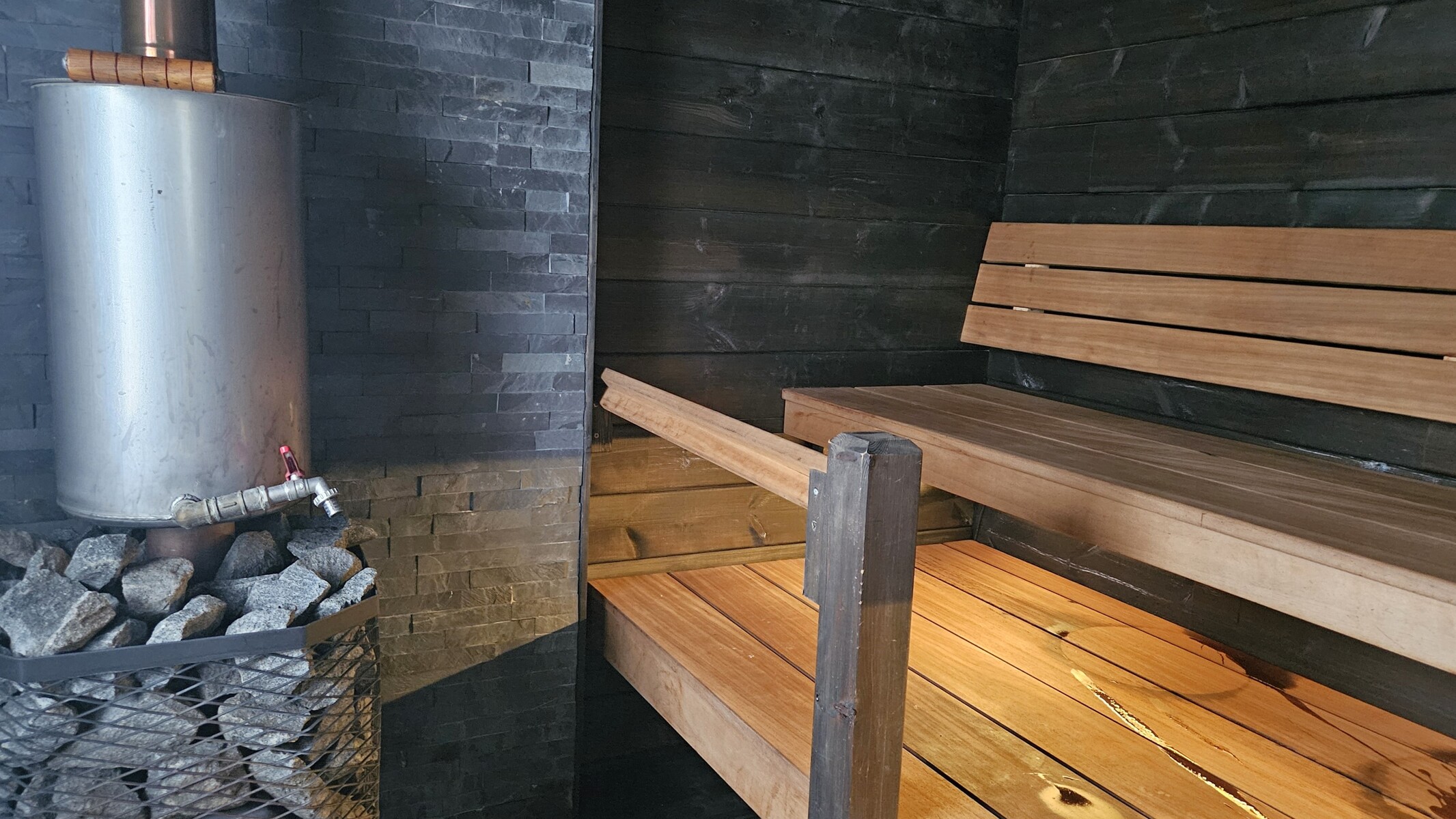 Erillinen rantasaunarakennus. Tilava löylyhuone ja pukuhuone/saunatupa. Lattialämmitys sähköllä. Puukiuas, jonka yhteydessä vedenlämmitys. Ns. kantovesi. Saunan edustalla terassi ja palju.