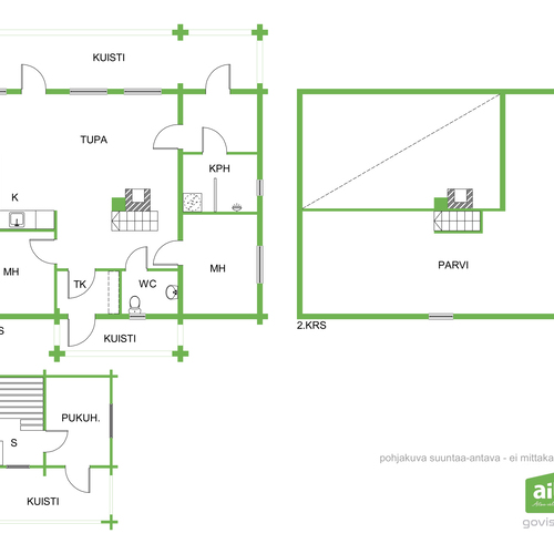 3h + k + kph + wc + khh + parvi + terassi | 76 m² / 91 m². Tontti: 5142 m²
