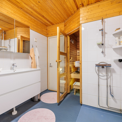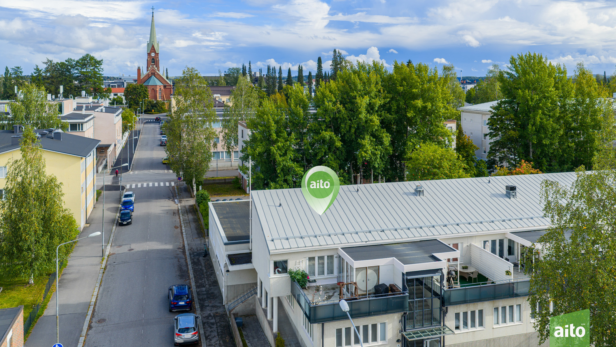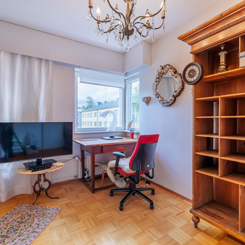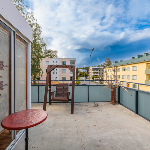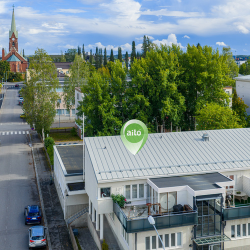 Tämä 85,50 m²:n koti sijaitsee rauhallisella alueella, aivan keskustan palveluiden läheisyydessä. Asunnossa on olohuone, keittiö, kaksi makuuhuonetta, työhuone, kylpyhuone, sauna sekä kaksi vaatehuonetta. Kodin kruunaa iso, 26 m² kattoterassi, josta 9 m² on lasitettu – erinomainen paikka rentoutua ja nauttia kaupunkimaisemista.